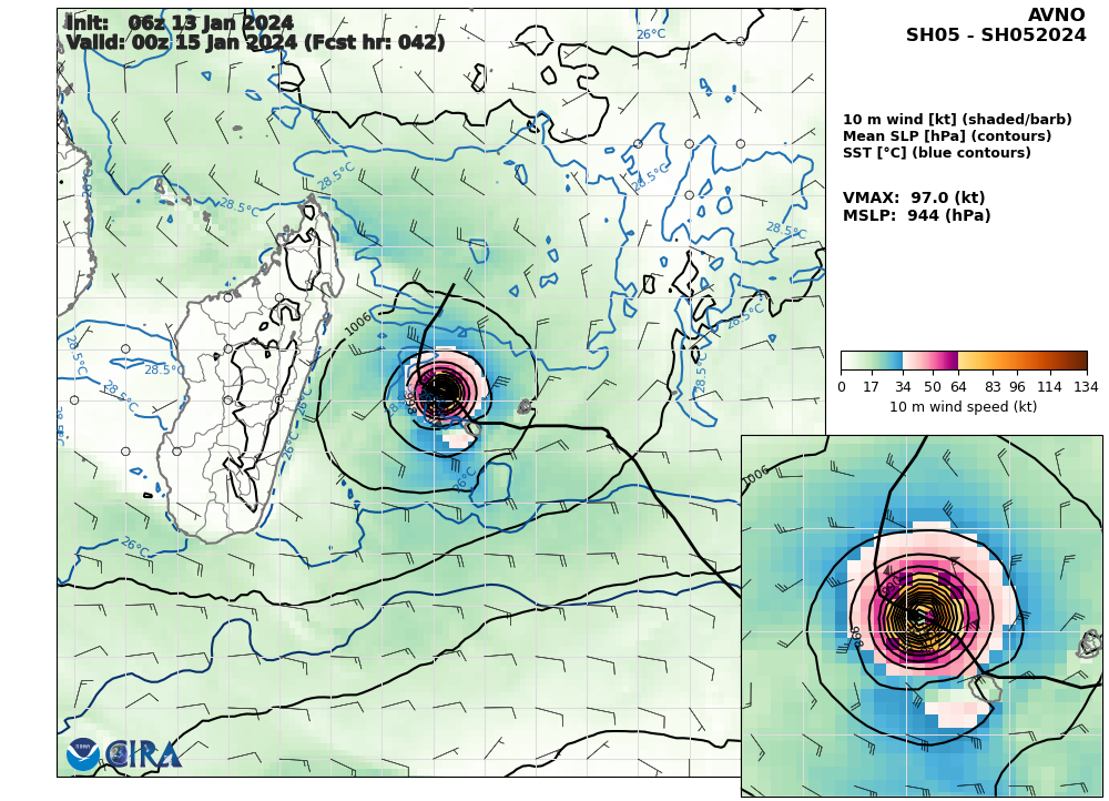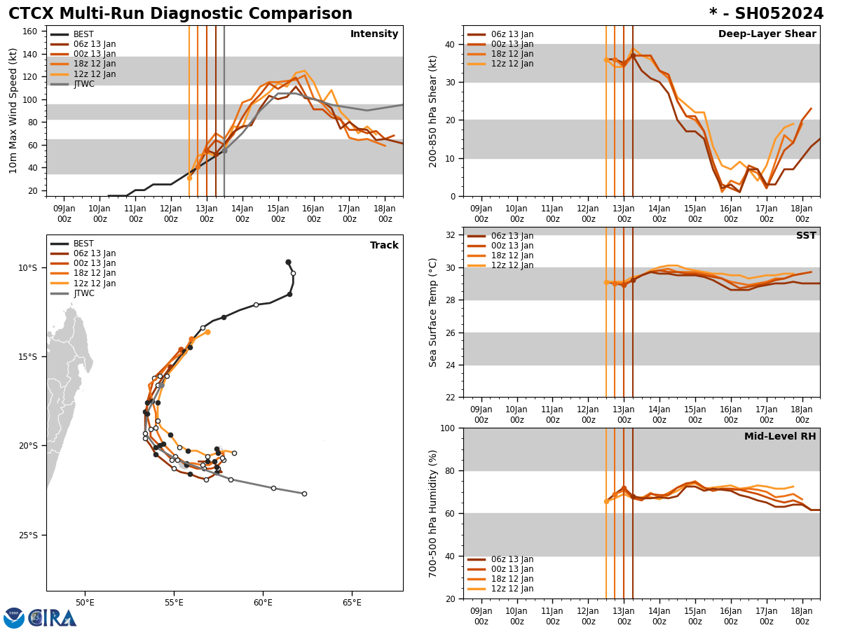 FORECAST REASONING. SIGNIFICANT FORECAST CHANGES: THERE ARE NO SIGNIFICANT CHANGES TO THE FORECAST FROM THE PREVIOUS WARNING. FORECAST DISCUSSION: TROPICAL CYCLONE (TC) 05S IS FORECAST TO TRACK SOUTH-SOUTHWESTWARD TO SOUTHWARD ALONG THE WESTERN PERIPHERY OF THE STR THROUGH TAU 24. BY TAU 36, TC 05S IS EXPECTED TO TURN SHARPLY SOUTHEASTWARD AS THE SUBTROPICAL WESTERLIES SHIFT OVER MADAGASCAR AND WEAKEN THE STR. TC 05S IS EXPECTED TO RAPIDLY INTENSIFY OVER THE NEXT 36 HOURS UNDER VERY FAVORABLE CONDITIONS, WITH A PEAK INTENSITY OF 105 KNOTS ANTICIPATED BY TAU 36. STEADY WEAKENING WILL COMMENCE AFTER TAU 48 DUE TO INCREASING (15 TO 25 KNOTS) VERTICAL WIND SHEAR (VWS) ASSOCIATED WITH THE STRENGTHENING SUBTROPICAL WESTERLIES. TC 05S WILL TRACK GENERALLY EAST-SOUTHEASTWARD THROUGH TAU 120 ALONG THE SOUTHWESTERN PERIPHERY OF THE REORIENTED STR POSITIONED TO THE NORTHEAST. AFTER TAU 96, THERE IS A SHORT WINDOW FOR SLIGHT REINTENSIFICATION AS THE SUBTROPICAL WESTERLIES AND AN ASSOCIATED SHORTWAVE TROUGH PROPAGATE EASTWARD, WITH DECREASING VWS AND IMPROVED POLEWARD VENTING.