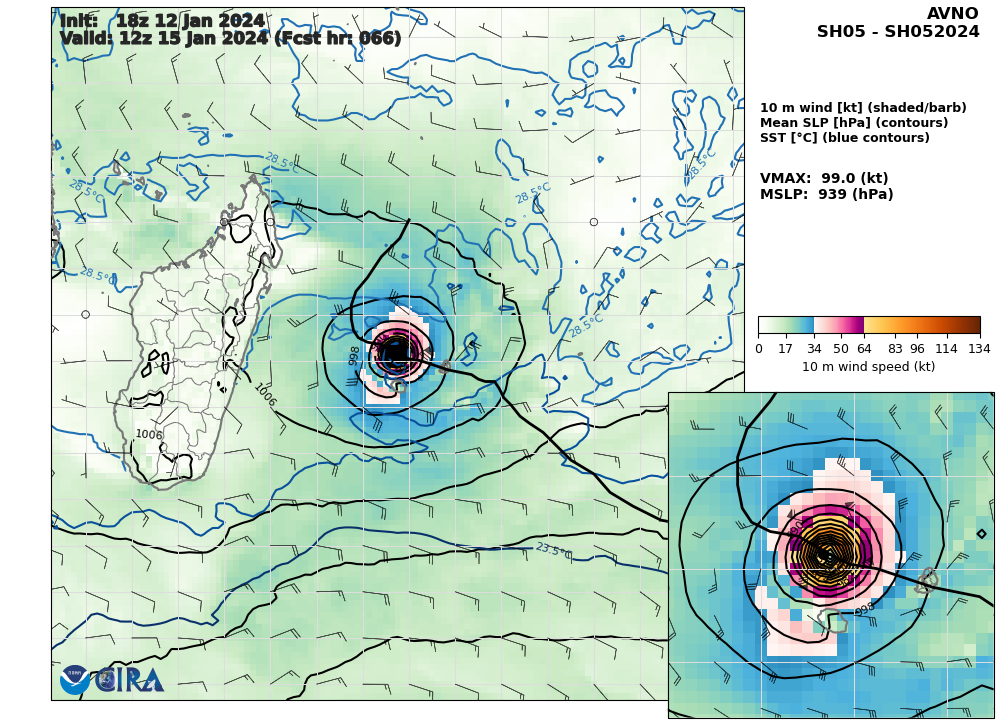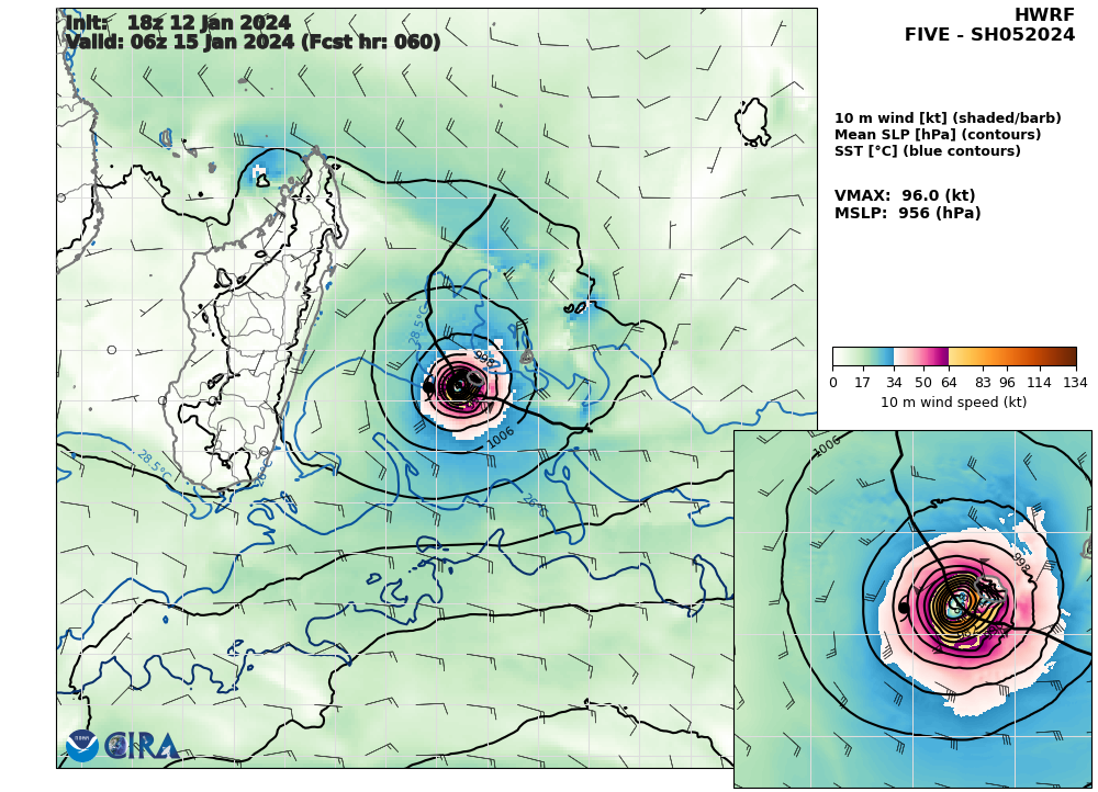 FORECAST REASONING. SIGNIFICANT FORECAST CHANGES: THERE ARE NO SIGNIFICANT CHANGES TO THE FORECAST FROM THE PREVIOUS WARNING. FORECAST DISCUSSION: TROPICAL CYCLONE (TC) 05S (FIVE) IS FORECAST TO TRACK TOWARD THE SOUTHWEST ALONG THE WESTERN PERIPHERY OF THE STEERING SUBTROPICAL RIDGE FOR THE NEXT 24 HOURS. TRACK SPEED IS EXPECTED TO REMAIN FAIRLY STEADY AS THE RIDGE DRIVES THE STORM TRACK TOWARD MAURITIUS AND LA REUNION. BY TAU 24, THE OVERALL MOVEMENT BEGINS TO PROGRESS SOUTHWARD AND SLOWS DOWN AS THE STEERING RIDGE REORIENTS TO THE NORTHEAST. BY TAU 36, TC 05S WILL BEGIN ITS SOUTHEASTWARD TRACK AND IS EXPECTED TO PASS DIRECTLY IN BETWEEN MAURITIUS AND LA REUNION NEAR THE TAU 72, AND CONTINUE INTO THE OPEN WATERS OF THE INDIAN OCEAN. THE ENVIRONMENT REMAINS FAVORABLE FOR ONGOING RAPID INTENSIFICATION AS DESTRUCTIVE VERTICAL WIND SHEAR (VWS) REMAINS LOW AND ALLOWS FOR INTENSITY TO INCREASE TO 60 KNOTS WITHIN THE NEXT 12 HOURS. 105 KNOTS IS FORECAST INTO TAU 72 AS WELL WHILE THE ENVIRONMENT SUPPORTS CONTINUED STRENGTHENING DIRECTLY THROUGH THE MASCARENE ARCHIPELAGO. AN EXPECTED RAPID DECREASE IN OCEAN HEAT CONTENT AND SSTS, WHILE VWS INCREASES WILL INDUCE A WEAKENING OF 05S INTO TAU 120 AS THE STORM PROGRESSES POLEWARD TOWARD COOLER WATERS.