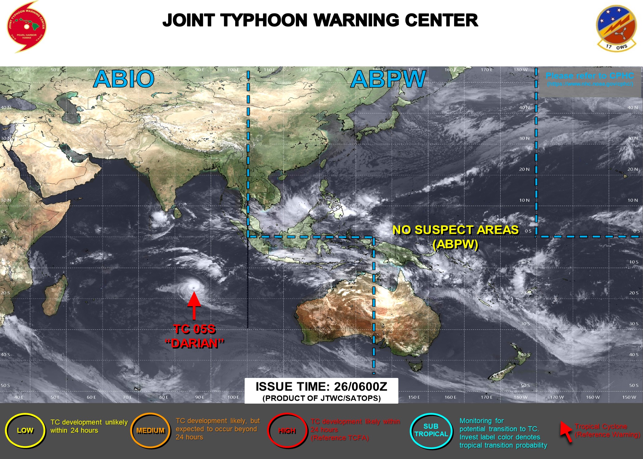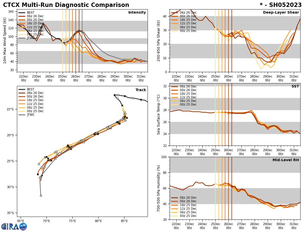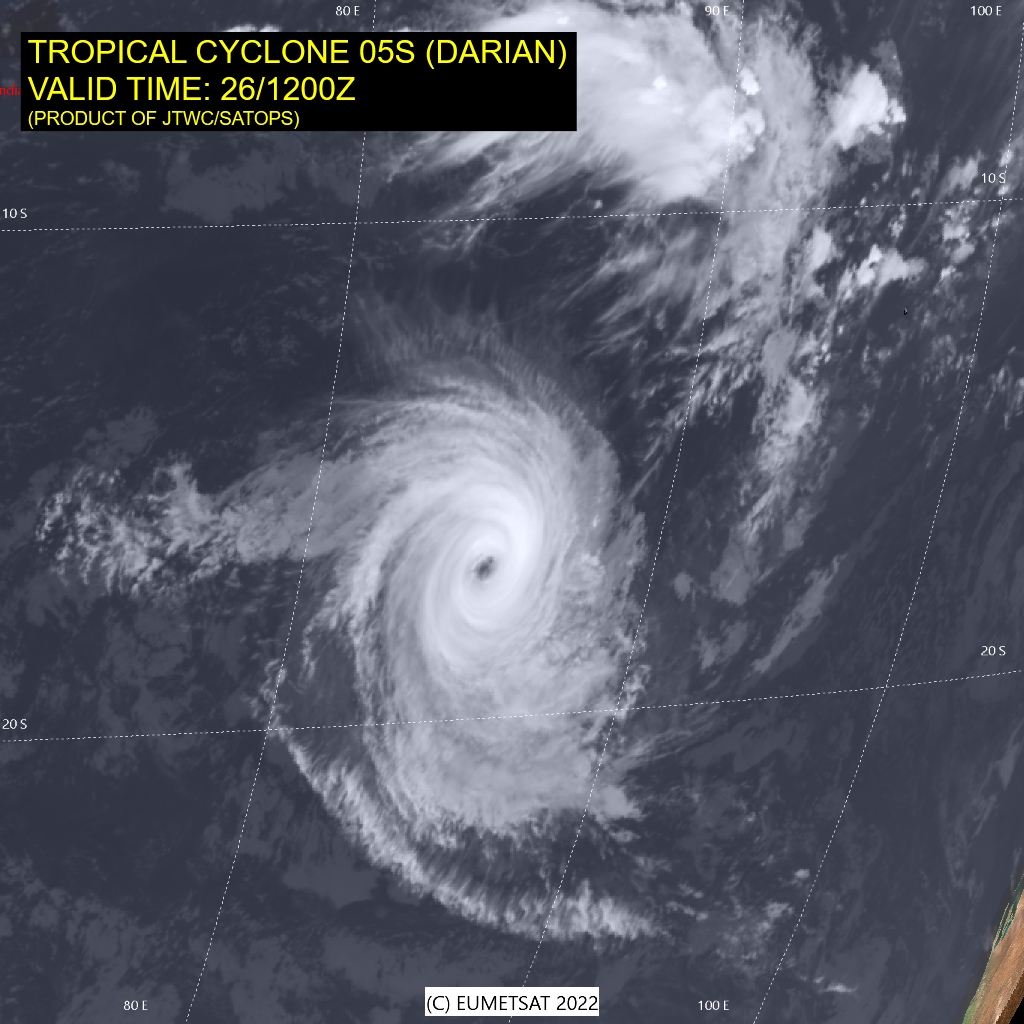 SATELLITE ANALYSIS, INITIAL POSITION AND INTENSITY DISCUSSION: ANIMATED MULTISPECTRAL SATELLITE IMAGERY (MSI) DEPICTS TIGHTLY WRAPPED DEEP CONVECTION SURROUNDING A 19 NM DIAMETER EYE. THE INITIAL POSITION IS PLACED WITH HIGH CONFIDENCE BASED ON A CLEAR DEPICTION OF THE EYE IN RECENT MICROWAVE SATELLITE IMAGERY, INCLUDING 260819Z AMSR2 AND 261022Z SSMIS PASSES. THE INITIAL INTENSITY OF 110 KTS IS ASSESSED WITH HIGH CONFIDENCE BASED ON SUBJECTIVE DVORAK CURRENT INTENSITY ESTIMATES FROM PGTW, KNES, FMEE, AND FIMP AS WELL AS AUTOMATED INTENSITY ESTIMATES FROM UW-CIMSS INDICATING A NARROW RANGE OF POSSIBLE VALUES FROM APPROXIMATELY 102 TO 116 KNOTS. TC 05S HAS WEAKENED SLIGHTLY OVER THE PAST SIX HOURS AFTER COMPLETING A THIRD ROUND OF RAPID INTENSIFICATION TO APPROXIMATELY 115 KNOTS AT 260600Z. PASSAGE OVER A PATCH OF RELATIVELY WARMER WATER AND EXCEPTIONAL OUTFLOW BOTH POLEWARD AND TOWARD AN UPPER-LEVEL LOW SITUATED TO THE WEST AIDED THE RECENTLY OBSERVED INTENSIFICATION TREND.