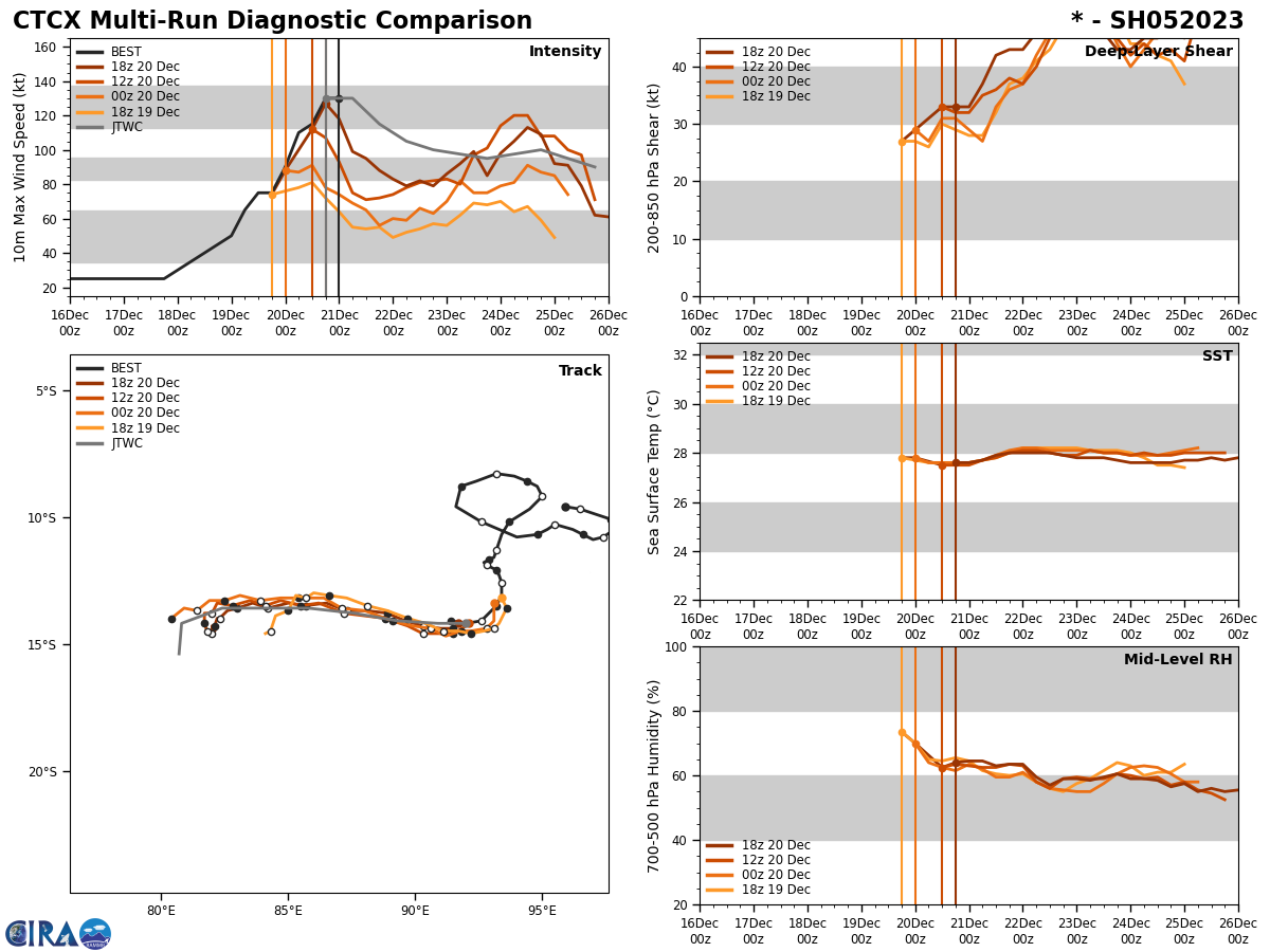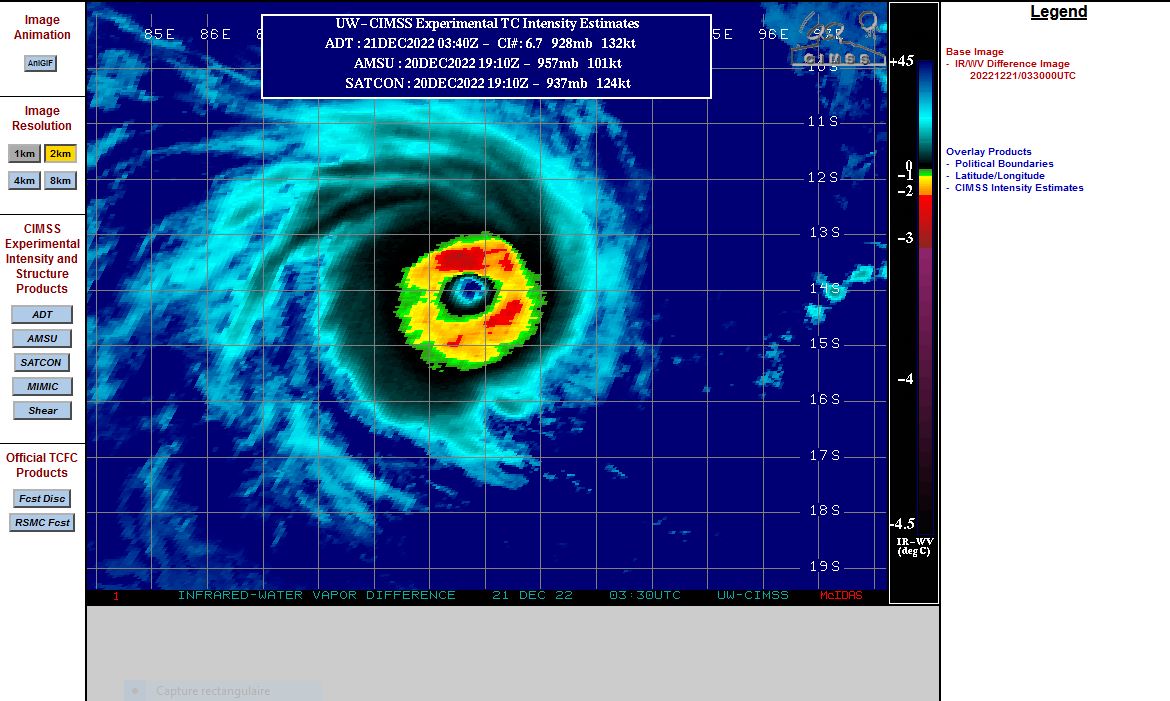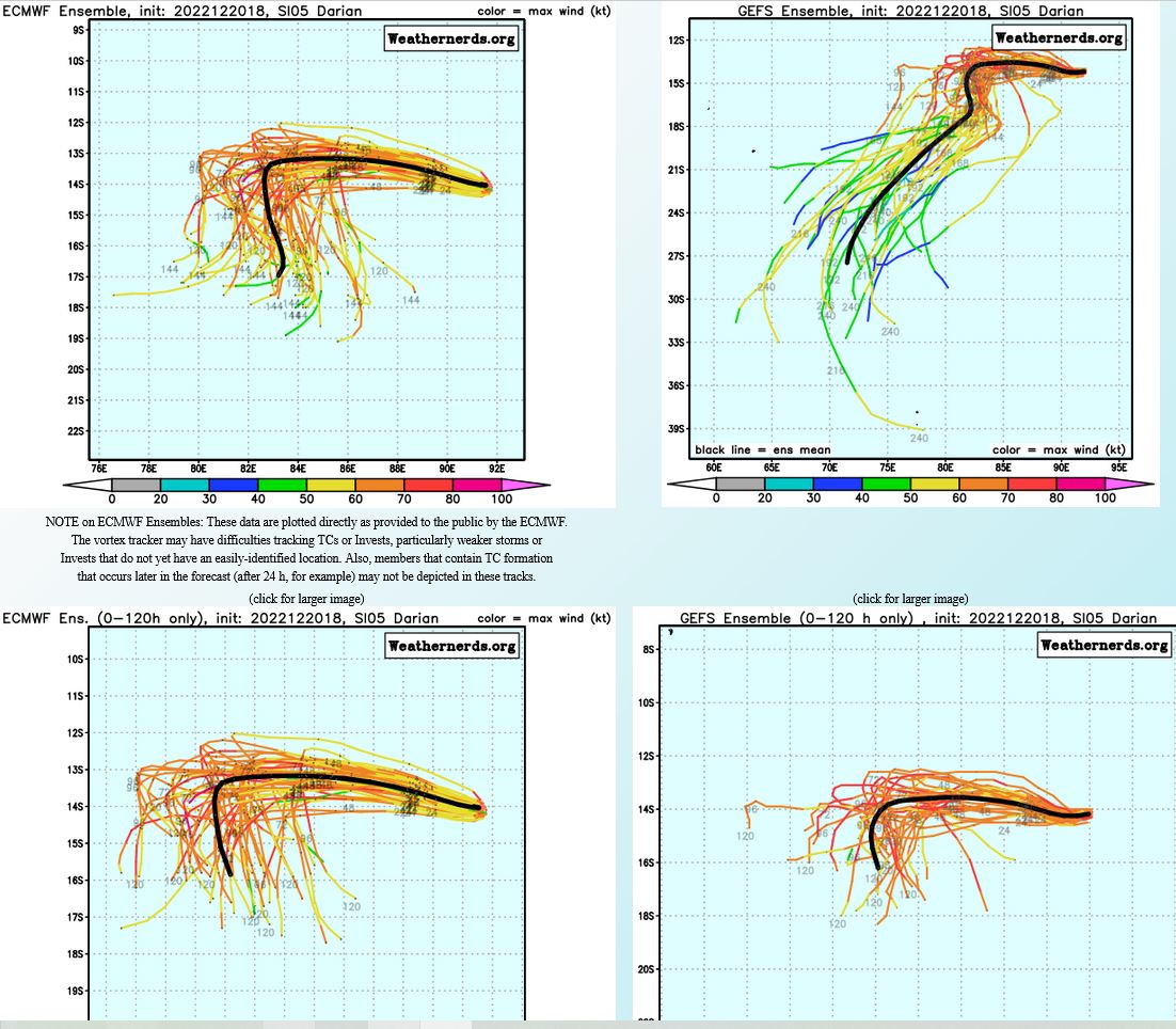 FORECAST DISCUSSION: TC 05S HAS RAPIDLY INTENSIFIED OVER THE PAST 12 HOURS, FROM 90 KNOTS TO 130 KNOTS IN JUST 18 HOURS. THE SYSTEM HAS TURNED TO THE WEST OVER THE PAST 12 HOURS THOUGH THERE HAS BEEN A BIT OF WOBBLE IN THE TRACK RECENTLY, THE COURSE MADE GOOD IS NOW ALMOST DUE WEST. THE FORECAST CALLS FOR THE TRACK TO TURN MORE WEST-NORTHWEST THROUGH TAU 48 TO TAU 60 AS THE SYSTEM CONTINUES TO TRACK ALONG THE NORTHERN PERIPHERY OF A DEEP-LAYER SUBTROPICAL RIDGE (STR) ENTRENCHED DOWN TO THE SOUTH NEAR 30S. BY TAU 72 THE RIDGE WILL RACE OFF TO THE WEST AND SOUTH AND THE SYSTEM WILL COME UNDER THE STEERING INFLUENCE OF AN EXTENSION OF THE NEAR-EQUATORIAL RIDGE (NER) WHICH WILL BUILD SOUTHWARD TO THE EAST OF THE SYSTEM, LEADING TO A TURN SHARPLY SOUTHWARD BY THE END OF THE FORECAST PERIOD. IN THE NEAR-TERM, DUE TO ITS NEAR-ANNULAR NATURE, AND THE LOW PROBABILITY OF AN EYEWALL REPLACEMENT CYCLE (ERC), THERE IS LITTLE IN THE WAY OF INTENSITY CHANGE ANTICIPATED THROUGH TAU 12. AFTER THIS POINT HOWEVER. A COMBINATION OF FACTORS WILL CONSPIRE TO WEAKEN THE SYSTEM. FIRST, THE RECENT SLOW MOVEMENT HAS UPWELLED CONSIDERABLY COOLER WATERS AROUND THE SYSTEM, AND THE FORECAST TRACK TAKES IT OVER MARGINALLY COOLER WATERS FOR THE NEXT 48 HOURS. THEN AROUND TAU 48, AN UPPER-LEVEL TROUGH IS EXPECTED TO DEEPEN JUST TO THE SOUTHEAST OF TC 05S, WHICH WILL INDUCE SOME CONVERGENT FLOW ALOFT WHICH WILL PUSH DOWN ON THE SYSTEM FROM THE SOUTH. THE FORECAST CALLS FOR THESE FACTORS TO WEAKEN THE SYSTEM DOWN TO 95 KNOTS BY TAU 72. THEREAFTER, ENVIRONMENTAL FACTORS IMPROVE ONCE MORE WITH THE SYSTEM MOVING OVER WARMER WATERS, AND TAPPING INTO IMPROVED POLEWARD OUTFLOW, WITH A SECOND PEAK EXPECTED NEAR 100 KNOTS. BUT THIS SECOND PEAK WILL BE SHORT-LIVED, AS THE SYSTEM SUCCUMBS ONCE AGAIN TO UPWELLING INDUCED SSTS COOLING AND BEGINS TO WEAKEN BY THE END OF THE FORECAST PERIOD.