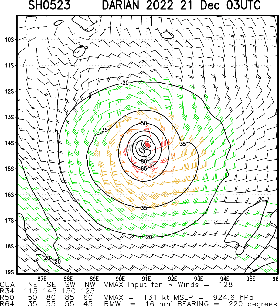 SATELLITE ANALYSIS, INITIAL POSITION AND INTENSITY DISCUSSION: TROPICAL CYCLONE DARIAN HAS EXCEEDED ALL EXPECTATIONS, AND RAPIDLY INTENSIFIED INTO A 130-KNOT MONSTER. ANIMATED ENHANCED INFRARED (EIR) SATELLITE IMAGERY DEPICTS A 30NM WIDE EYE, WITH EYE TEMPERATURES MEASURED AT +7C AT ANALYSIS TIME, NOW MEASURED AT +14C AN HOUR LATER. THE SYSTEM IS EXHIBITING SOME FEATURES OF AN ANNULAR TROPICAL CYCLONE, WITH MINIMAL BANDING FEATURES CONSTRAINED TO THE WESTERN SIDE OF THE CIRCULATION AND AN EYE SURROUNDED BY A RING OF FAIRLY CONSISTENT -75C CLOUD TOPS. THE MOST RECENT MICROWAVE IMAGE WAS AN SSMIS PASS FROM 201218Z WHICH SHOWED A NEARLY COMPLETE EYEWALL, THOUGH STILL OPEN ON THE NORTHEAST SIDE AND THE ONE BANDING FEATURE DISPLACED TO THE WEST. BASED ON THE DRAMATICALLY IMPROVED INFRARED STRUCTURE, IT CAN BE SAFELY ASSUMED THE EYEWALL IS NOW COMPLETELY CLOSED. THE INITIAL POSITION IS ASSESSED WITH HIGH CONFIDENCE BASED ON THE 30NM EYE IN THE EIR. THE INITIAL INTENSITY IS ASSESSED WITH HIGH CONFIDENCE BASED ON A BLEND OF AGENCY FIXES BETWEEN 115-140 KNOTS, WITH A SUPPORT FROM THE ADT (134 KNOTS), AIDT (132 KNOTS), OPEN-AIIR (129 KNOTS) AND THE SATCON OF 121 KNOTS. THE SYSTEM REMAINS COCOONED IN A FAVORABLE ENVIRONMENT CHARACTERIZED BY LOW VERTICAL WIND SHEAR (VWS), MODERATE RADIAL OUTFLOW WITH A SLIGHT BIT OF POLEWARD OUTFLOW AS WELL. SSTS ARE MARGINAL AT 26-27C AND MAY BE SLIGHTLY COOLER DUE TO UPWELLING, BUT CLEARLY THE SYSTEM HAS BEEN ABLE TO OVERCOME THIS MARGINAL PARAMETER.