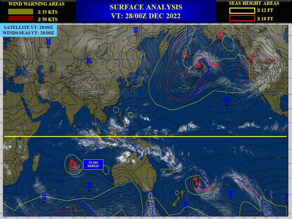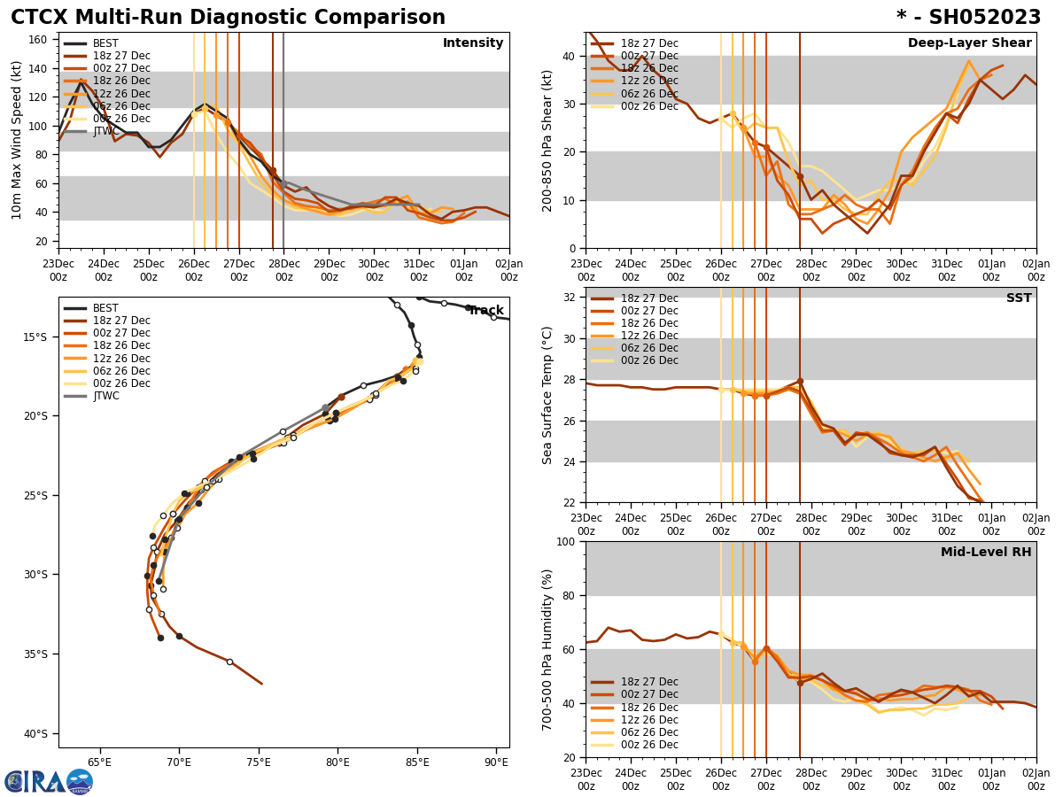 SATELLITE ANALYSIS, INITIAL POSITION AND INTENSITY DISCUSSION: TROPICAL CYCLONE (TC) 05S HAS CONTINUED TO WEAKEN DUE TO PERSISTENT NORTHERLY VERTICAL WIND SHEAR, COOLER SEA SURFACE TEMPERATURE AND DRY AIR ENTRAINMENT AS EVIDENCED IN ANIMATED MULTISPECTRAL SATELLITE IMAGERY, WHICH SHOWS AN EXPOSED LOW-LEVEL CIRCULATION CENTER (LLCC) WITH RAPIDLY-DECAYING DEEP CONVECTION CONFINED TO THE SOUTHERN SEMICIRCLE. DESPITE THE POOR DEEP CONVECTIVE STRUCTURE, LOW-LEVEL BANDING CONTINUES TO WRAP TIGHTLY INTO A WELL-DEFINED LLCC. ADDITIONALLY, A 272331Z SSMIS 37GHZ MICROWAVE IMAGE REVEALS SHALLOW BANDING WRAPPING INTO A RAGGED BUT DEFINED LLCC, WHICH, ALONG WITH THE MSI, SUPPORTS THE INITIAL POSITION WITH HIGH CONFIDENCE. A RECENT 271953Z AMSR2 WINDSPEED IMAGE INDICATES AN ASYMMETRIC WIND FIELD BUT SHOWS A SWATH OF 50-61 KNOT WINDS OVER THE SOUTHERN QUADRANT, THEREFORE, THE INITIAL INTENSITY IS HELD AT 60 KNOTS. THIS ESTIMATE IS CONSISTENT WITH THE DVORAK CURRENT INTENSITY ESTIMATES AS WELL AS THE CIMSS SATCON ESTIMATE.