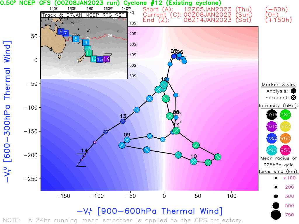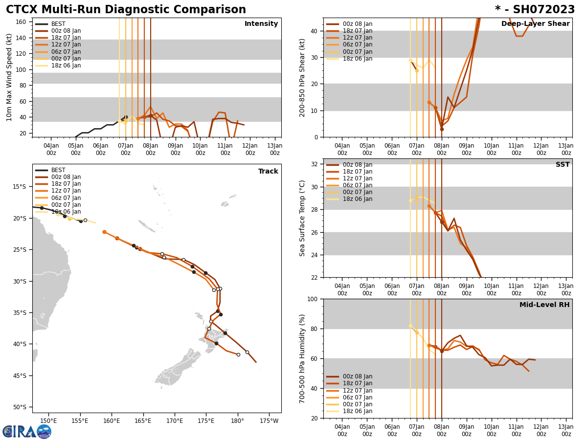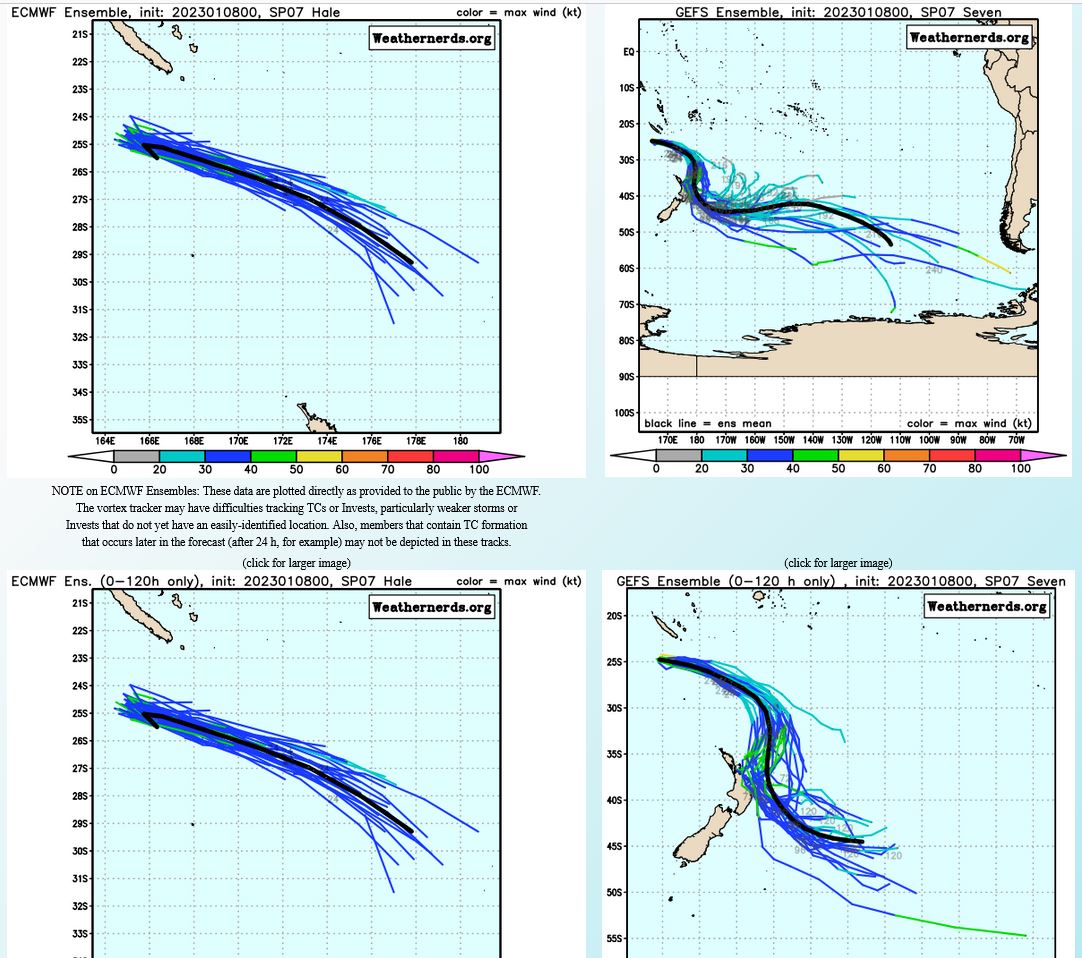 080900Z POSITION NEAR 25.8S 169.1E. 08JAN23. TROPICAL CYCLONE 07P (HALE), LOCATED APPROXIMATELY 224 NM SOUTH-SOUTHEAST OF NOUMEA, NEW CALEDONI, HAS TRACKED EAST- SOUTHEASTWARD AT 24 KNOTS OVER THE PAST SIX HOURS. ANIMATED MULTISPECTRAL SATELLITE IMAGERY REVEALS THAT 07P IS BEING RIPPED APART ON ITS POLEWARD JOURNEY PARTIALLY EXPOSING A HIGHLY IRREGULAR LOW LEVEL CIRCULATION. HAVING ALREADY PASSED SOUTH OF THE 26C ISOTHERM AND UNDERGOING INCREASING VERTICAL WIND SHEAR (VWS) AND RELENTLESS DRY AIR ENTRAINMENT, TC HALE IS WELL ON ITS WAY TO SUBTROPICAL TRANSITION (STT). AS THE SYSTEM CONTINUES SOUTH-SOUTHEASTWARD IT WILL CONTINUE TO DEGRADE AND LOSE ALL REMAINING TROPICAL CHARACTERISTICS, BY TAU 12 THE SYSTEM IS FORECAST TO COMPLETE STT. NUMERICAL MODELS ARE IN TIGHT AGREEMENT THAT THE SYSTEM WILL CONTINUE ON ITS CURRENT COURSE AND SPEED THROUGH TAU 12 UNTIL TURNING POLEWARD AFTER THE FORECAST PERIOD AND ACCELERATING TO THE SOUTH. THIS IS THE FINAL WARNING ON THIS SYSTEM BY THE JOINT TYPHOON WRNCEN PEARL HARBOR HI. THE SYSTEM WILL BE CLOSELY MONITORED FOR SIGNS OF REGENERATION. MAXIMUM SIGNIFICANT WAVE HEIGHT AT 080600Z IS 14 FEET.//