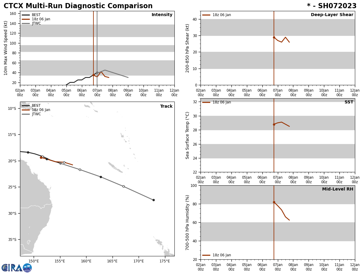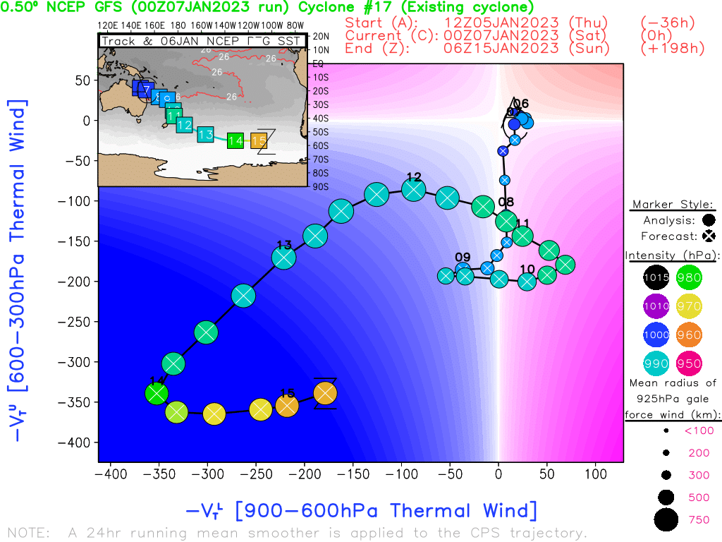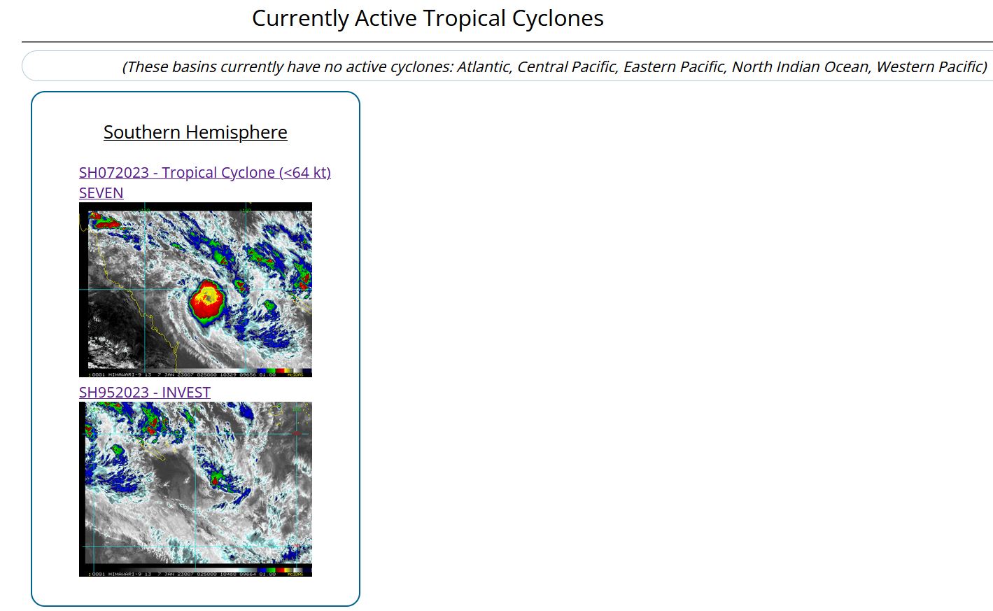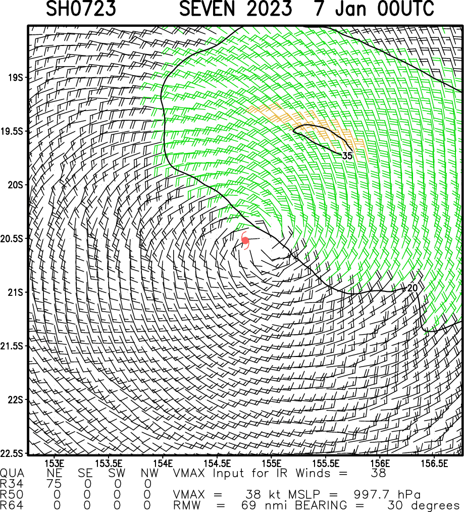 FORECAST REASONING. SIGNIFICANT FORECAST CHANGES: THERE ARE NO SIGNIFICANT CHANGES TO THE FORECAST FROM THE PREVIOUS WARNING. HOWEVER, THE FORECAST HAS BEEN TRUNCATED TO 48 HOURS DUE TO AN ACCELERATED TIMELINE FOR SUBTROPICAL TRANSITION. FORECAST DISCUSSION: TC 07P (SEVEN) HAS CONTINUED TO TRANSIT RAPIDLY TOWARDS THE SOUTHEAST ALONG THE SOUTHWESTERN SIDE OF A DEEP STR CENTERED FAR TO THE NORTHEAST. NO MAJOR CHANGES ARE EXPECTED IN THE GENERAL TRACK MOTION, OTHER THAN SOME FURTHER ACCELERATION THROUGH THE FORECAST PERIOD AS THE STR BUILDS AND STRENGTHENS THE STEERING GRADIENT. IT REMAINS POSSIBLE THAT THE SYSTEM COULD EVOLVE INTO MORE THAN ONE CENTER OF CIRCULATION, WITH ONE SPINNING OUT OF THE NORTHWESTERN END OF THE ELONGATED CIRCULATION AND MOVING EAST OVER NORTHERN NEW CALEDONIA, WHILE THE CURRENT LLCC CONTINUES TO TRACK SOUTHEASTWARD. THIS SCENARIO IS DEPICTED WELL IN THE GFS DETERMINISTIC RUN WHILE THE REMAINDER OF THE MODELS SHOW ONE CIRCULATION TRACKING SOUTHEASTWARD. REGARDLESS, THE FORECAST TRACKS TWO PRIMARY CIRCULATION THROUGHOUT THE FORECAST PERIOD. OVER THE SHORT-TERM, ADDITIONAL INTENSIFICATION IS LIKELY, AS THE SYSTEM WILL REMAIN OVER WARM WATERS AND WILL CONTINUE TO TAP INTO STRONG POLEWARD OUTFLOW, WHILE SHEAR REMAINS RELATIVELY LOW. THE RECENT INNER-CORE LIGHTNING BURST IS SUGGESTIVE OF THE INTENSIFICATION TREND AND THE FORECAST CALLS FOR THE TO PEAK AT 45-50 KNOTS BY TAU 12. THEREAFTER TC 07P WILL START TO SLOWLY WEAKEN AS IT STARTS TO FEEL THE IMPACTS OF SHARPLY INCREASING VWS AND IS STEADILY ENGULFED BY A DRY MID-LEVEL AIR MASS. BY AROUND TAU 24 THE SYSTEM WILL MOVE SOUTH OF THE 26C ISOTHERM AND MOVE UNDER THE SUBTROPICAL WESTERLIES ALOFT, MARKING THE BEGINNING OF SUBTROPICAL TRANSITION (STT). BY TAU 48 THE SYSTEM WILL LIKELY MERGE WITH INVEST 95P, CURRENTLY DRIFTING SOUTH TO THE EAST OF NEW CALEDONIA, WHILE BECOMING FULLY EMBEDDED UNDER THE SUBTROPICAL WESTERLIES ALOFT AND MOVING OVER COOLER WATERS. TRANSITION TO A FULLY SUBTROPICAL LOW IS EXPECTED TO BE COMPLETE NO LATER THAN TAU 48. WHILE THE SYSTEM IS EXPECTED TO WEAKEN BELOW THE 35 KNOT WARNING THRESHOLD BY TAU 48, AN ADDITIONAL ROUND OF INTENSIFICATION IS POSSIBLE IN THE LATER TAUS, AFTER THE CURRENT FORECAST PERIOD, DUE TO STRONG BAROCLINIC FORCING AS THE SYSTEM TURNS SOUTH AND BECOMES EXTRATROPICAL.