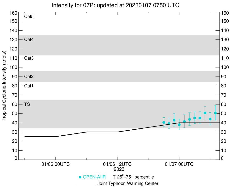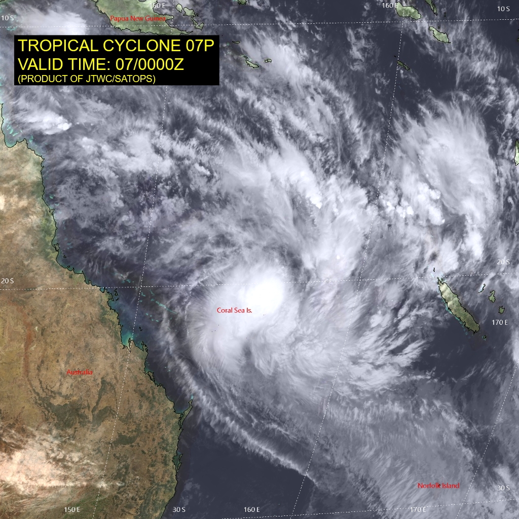 SATELLITE ANALYSIS, INITIAL POSITION AND INTENSITY DISCUSSION: ANIMATED MULTISPECTRAL SATELLITE IMAGERY (MSI) DEPICTS AN ELONGATED CIRCULATION, STRETCHED OUT FROM SOUTHEAST TO NORTHWEST, WITH A SMALL KERNEL OF A CIRCULATION IN THE FAR SOUTHEASTERN PORTION, WHICH IS THE CORE OF TC 07P. THIS ASSESSMENT IS BASED ON ANALYSIS OF THE ANIMATED MSI IN WHICH THE NORTHWESTERN SECTION OF THE CIRCULATION HAS STARTED TO PEAK OUT FROM UNDER THE CONVECTIVE BLOWOFF, COMBINED WITH A 062228Z ASCAT-B PARTIAL PASS WHICH SHOWED THE SMALL LLCC TUCKED INTO THE SOUTHEAST CORNER OF THE BROADER CIRCULATION. ENHANCED INFRARED (EIR) IMAGERY SHOWS HOT TOWERS WITH TEMPERATURES BELOW -90C FIRING UP NEAR THE ASSESSED CENTER AND GLOBAL LIGHTNING DATA SHOWS A STRONG INNER-CORE LIGHTNING BURST COMMENCING AT 070000Z, SUGGESTIVE OF INTENSIFICATION. THE INITIAL POSITION IS ASSESSED WITH HIGH CONFIDENCE BASED ON AN EXTRAPOLATION OF THE ASCAT AMBIGUITY FIX AND THE PGTW POSITION FIX. THE INITIAL INTENSITY IS UPPED A NOTCH TO 40 KNOTS WITH HIGH CONFIDENCE BASED ON MULTIPLE FACTORS INCLUDING A 2000Z SHIP OBSERVATION OF 40 KNOTS, A 061937Z SMAP PASS WITH 1-MIN WINDS OF 42 KNOTS, THE 062228Z ASCAT SHOWING WINDS UP TO 38 KNOTS, ALONG WITH SUBJECTIVE AND OBJECTIVE DVORAK BASED INTENSITY ESTIMATES BETWEEN T2.0 (30 KNOTS) AND T3.0 (45 KNOTS). THE ENVIRONMENT, WHILE NOT OPTIMAL, IS CLEARLY SUPPORTIVE OF DEVELOPMENT FOR THE TIME BEING, WITH LOW VWS, WARM SSTS AND STRONG POLEWARD OUTFLOW.