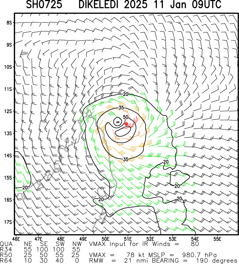 Platform: RCM-3 Acquisition Date: 2025-01-11 02:13:16 UTC Storm Name: SH072025 / DIKELEDI Storm ID: SH07 Storm Center Longitude: 53.296 Storm Center Latitude: -12.608 Incidence Angle (Degrees): 20.860 Quadrant 1 NE VMax (kts): N/A Quadrant 2 SE VMax (kts): 38.12 Quadrant 3 SW VMax (kts): 78.39 Quadrant 4 NW VMax (kts): 67.43 RMax (nmi): 33.00 - 76.00