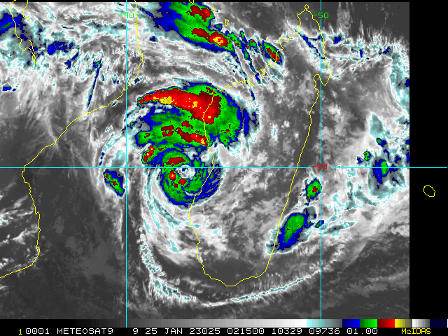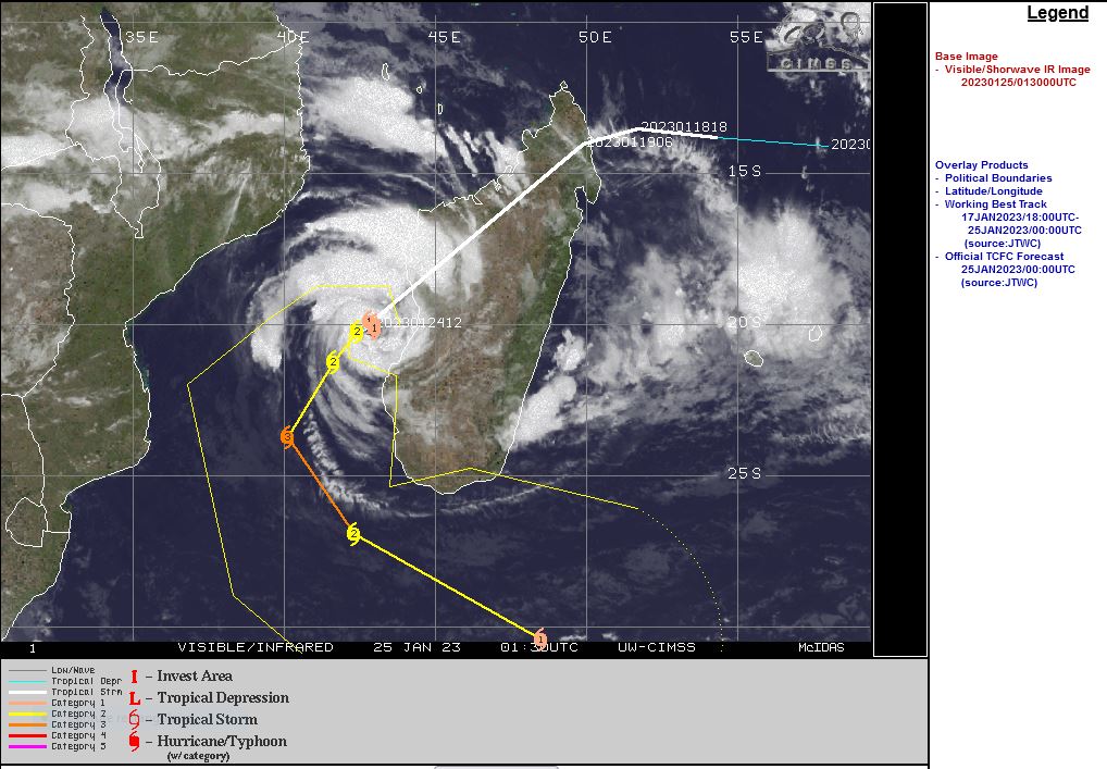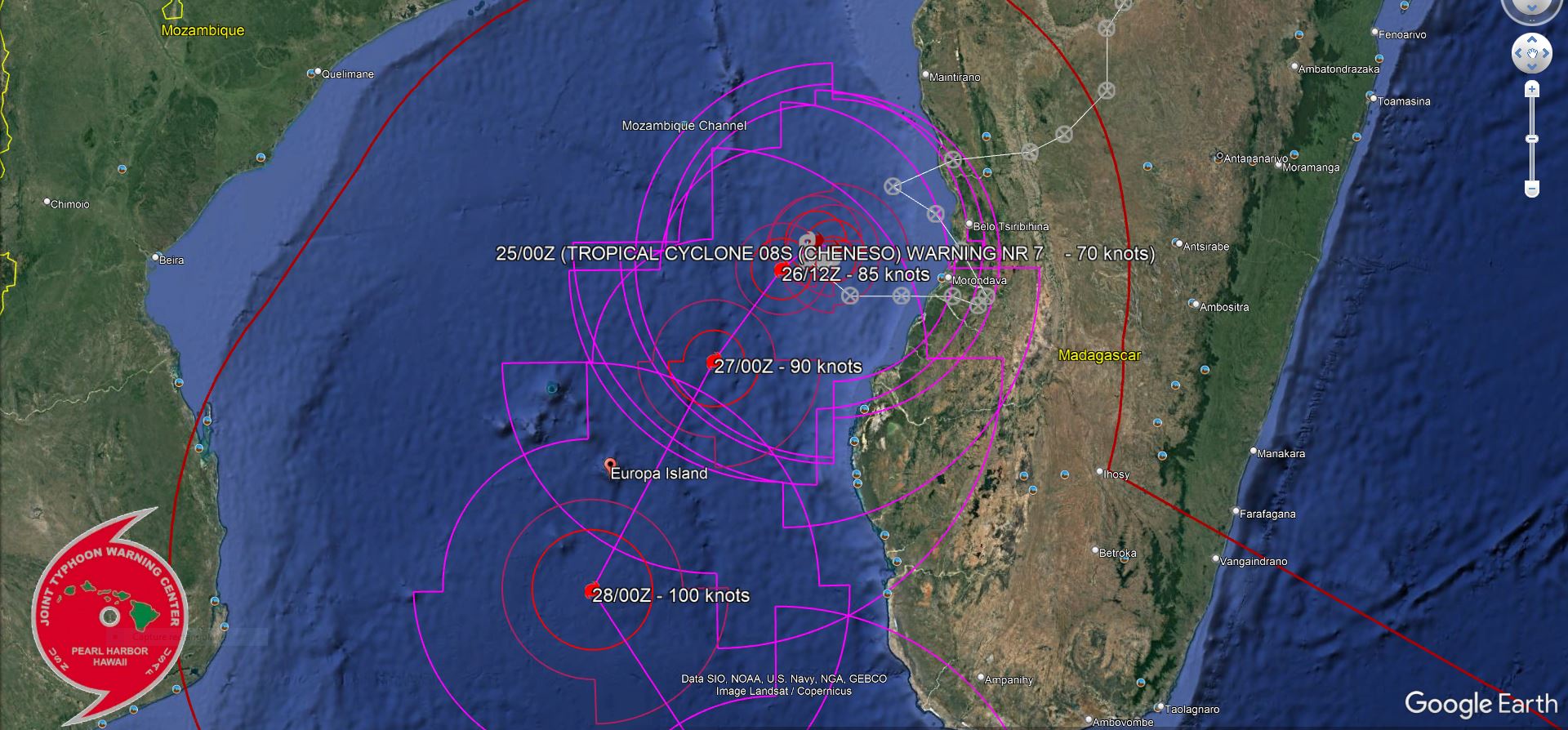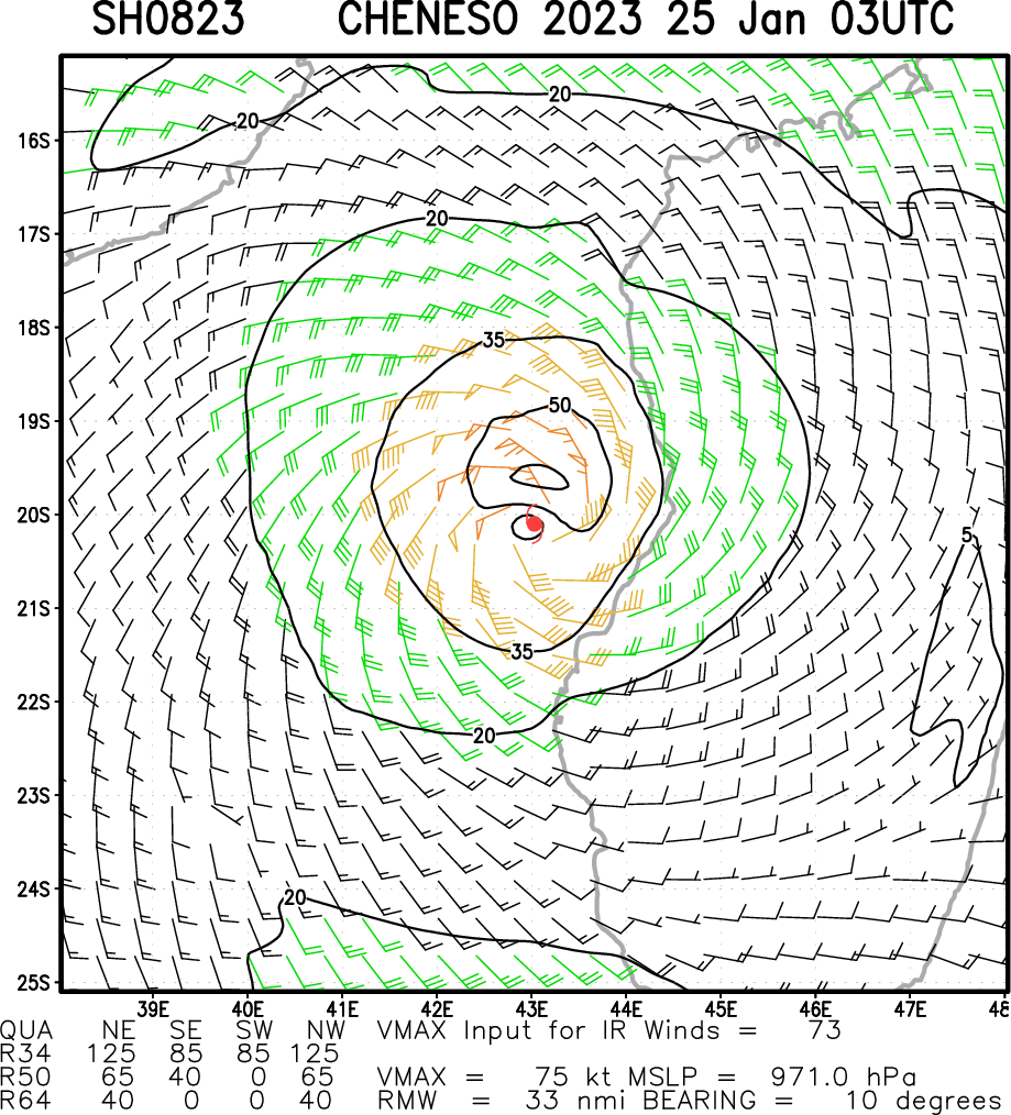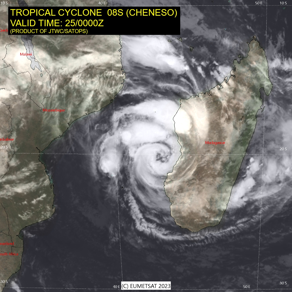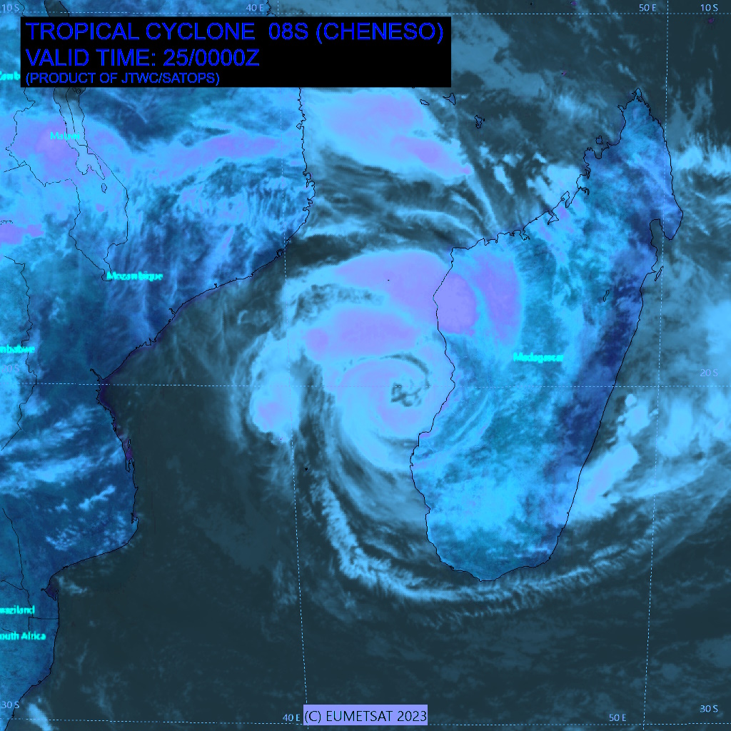 SOUTH INDIAN OCEAN/MOZ CHANNEL: TC 08S(CHENESO). ESTIMATED LOCATION AND INTENSITY AT 25/00UTC.
