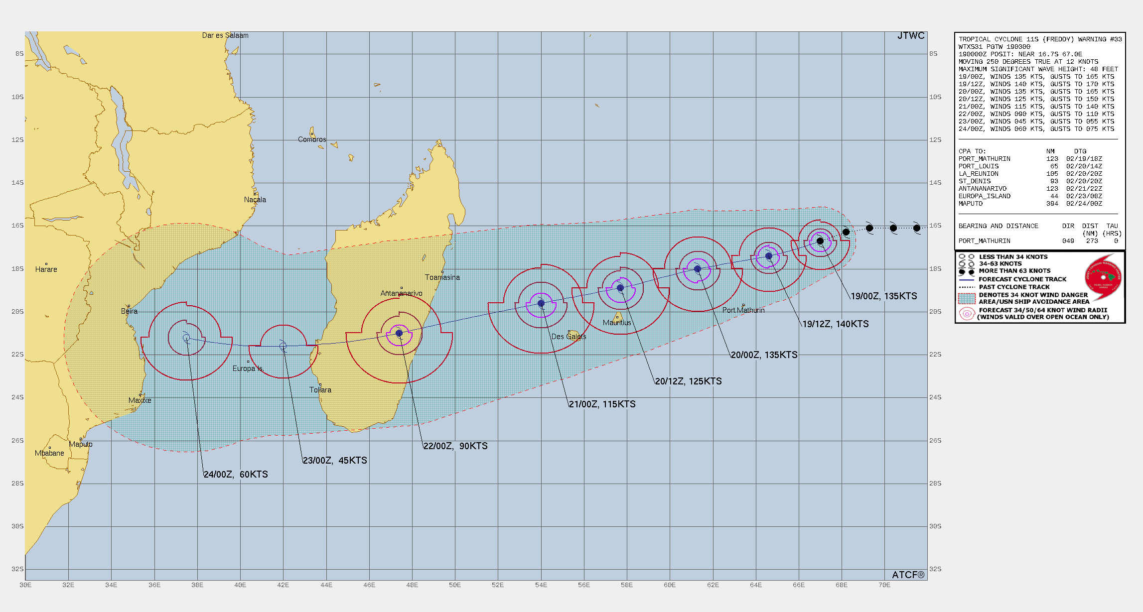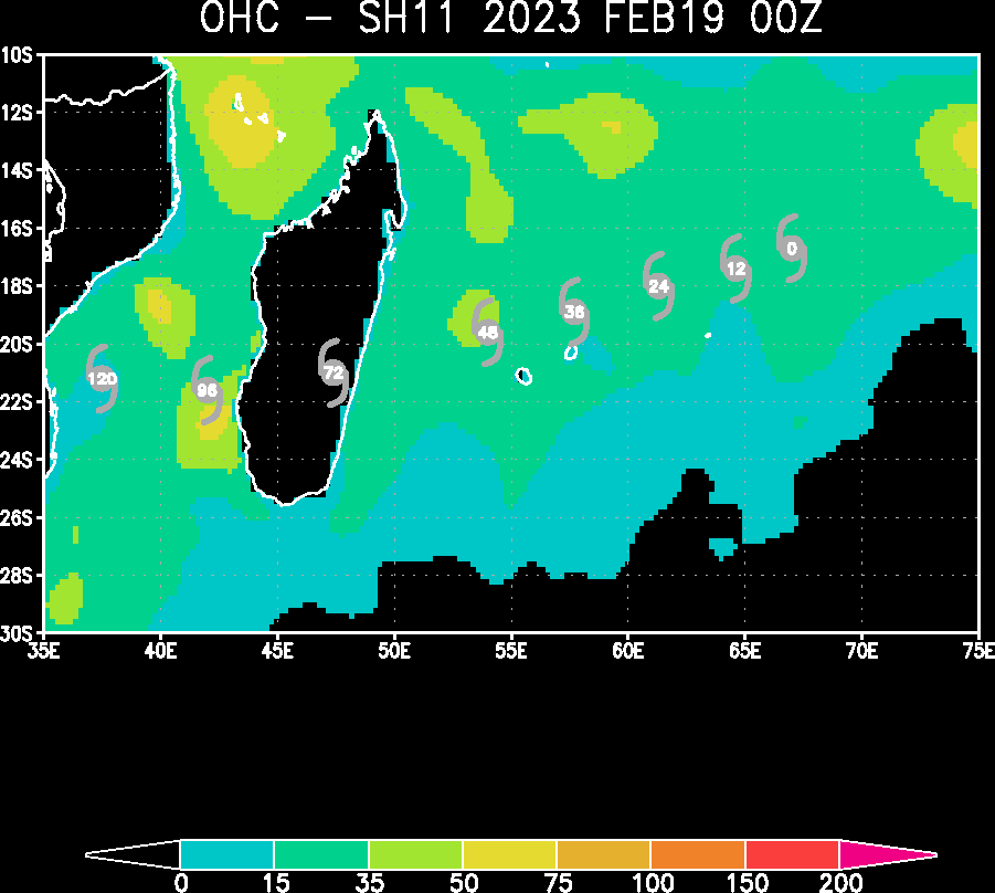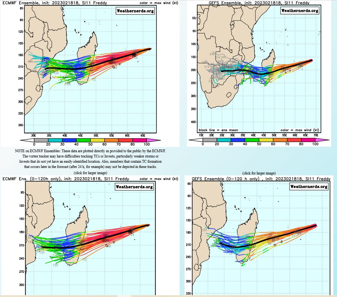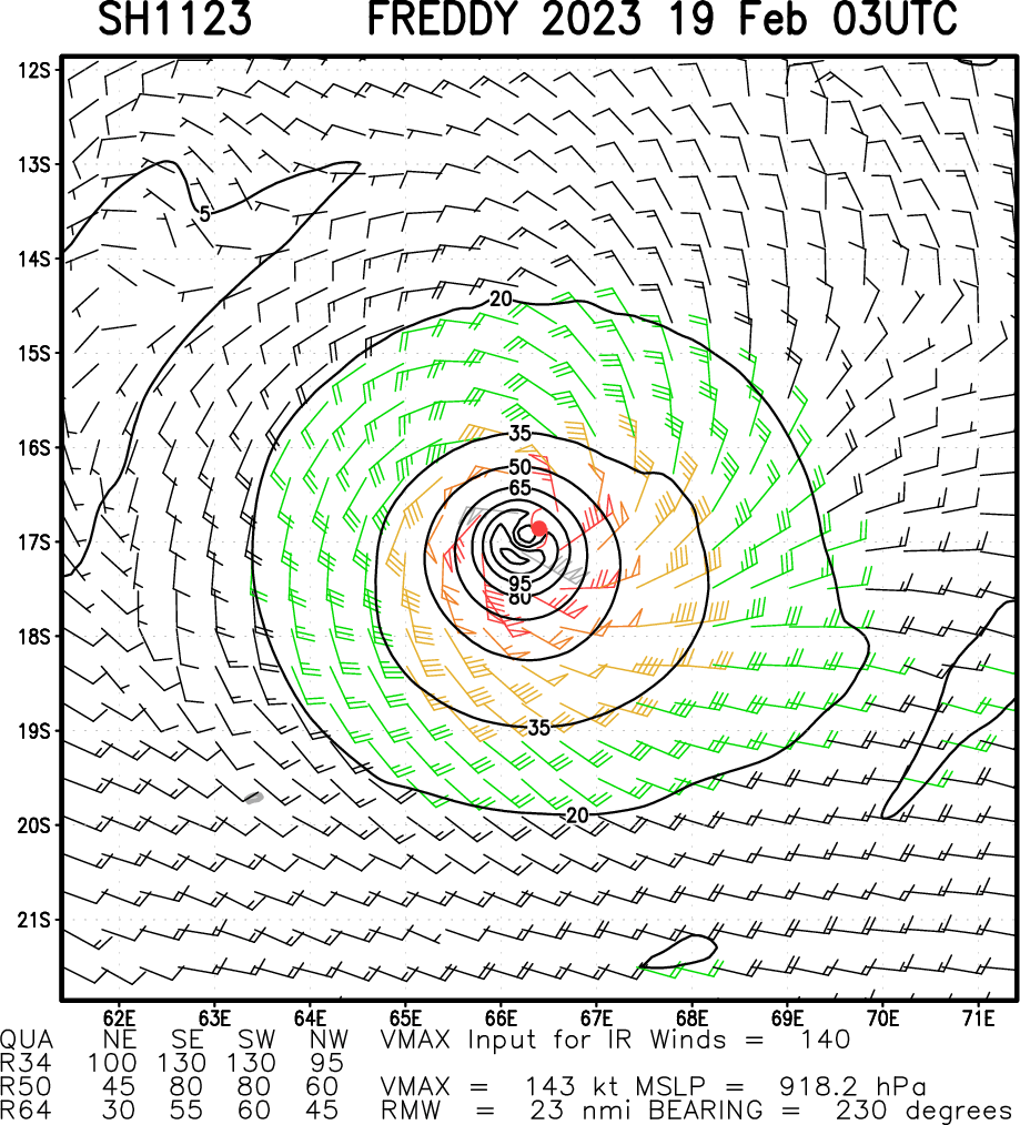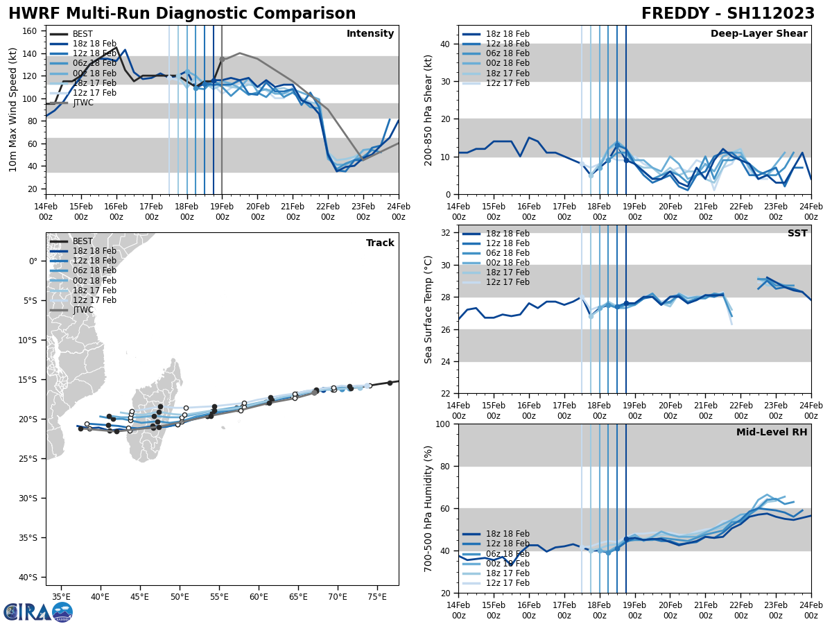 FORECAST REASONING. SIGNIFICANT FORECAST CHANGES: THERE ARE NO SIGNIFICANT CHANGES TO THE FORECAST FROM THE PREVIOUS WARNING. FORECAST DISCUSSION: TC FREDDY CONTINUES TO TRACK WEST-SOUTHWEST TOWARDS ITS RENDEZVOUS WITH MADAGASCAR. NO SIGNIFICANT CHANGE IN STEERING MECHANISM OR TRACK IS EXPECTED BEFORE LANDFALL ALONG THE EAST COAST OF MADAGASCAR. TRACK SPEEDS HAVE BEEN A CONSISTENT 11-12 KNOTS OVER THE PAST DAY, BUT SOME ACCELERATION IS EXPECTED AFTER TAU 24 AS THE RIDGE TO THE SOUTH BUILDS AND THE STEERING GRADIENT TIGHTENS UP A BIT. THE CURRENT FORECAST CALLS FOR THE SYSTEM TO TRACK SLIGHTLY FURTHER SOUTH THAN THE PREVIOUS FORECAST AND BRING IT INTO RELATIVELY CLOSE PROXIMITY OF BOTH MAURITIUS AND LA REUNION OVER THE NEXT 36 TO 48 HOURS, FOLLOWED BY LANDFALL AS A SIGNIFICANT TROPICAL CYCLONE ALONG THE EAST COAST OF MADAGASCAR AROUND TAU 60. AFTER CROSSING OVER THE ISLAND, THE SYSTEM WILL MOVE INTO THE MOZAMBIQUE CHANNEL. AS IT DOES SO, IT WILL COME UNDER THE STEERING INFLUENCE OF A DEVELOPING STR OVER SOUTH AFRICA AND GRADUALLY TURN ONTO A MORE WEST-NORTHWESTWARD TRACK TOWARDS MOZAMBIQUE. FROM AN INTENSITY PERSPECTIVE, SOME ADDITIONAL NEAR-TERM INTENSIFICATION IS POSSIBLE AS THERE IS NO INDICATION OF ANY EYEWALL REPLACEMENT CYCLES (EWRC) NOR ANY EXPECTED CHANGES IN THE ENVIRONMENT. THE ONLY FACTOR THAT COULD LIMIT A RUN AT 140 KNOTS WILL BE INNER-CORE DYNAMICAL FACTORS SUCH AS EYE ENLARGEMENT AND INNER-CORE INTRUSIONS FROM THE NEARBY POOL OF MID-LEVEL DRY AIR. AFTER TAU 24 HOWEVER, A STEADY BUT SLOW WEAKENING TREND IS EXPECTED AS THE SYSTEM MOVES OVER WATERS THAT WHILE STILL SUFFICIENTLY WARM, LACK SIGNIFICANT OHC. IT MUST BE MENTIONED HOWEVER THAT A POOL OF VERY WARM, HIGH OHC WATERS LIES DIRECTLY ALONG THE COAST OF MADAGASCAR AND COULD PROVIDE A SHORT-TERM BOOST IN INTENSITY JUST PRIOR TO LANDFALL, THOUGH THE SYSTEM WILL BE MOVING FAIRLY QUICKLY AND THIS WILL LIMIT THE POSSIBLE INTENSIFICATION. THE SYSTEM WILL RAPIDLY WEAKEN AS IT CROSSES MADAGASCAR AND IS EXPECTED TO BE A WEAK TROPICAL STORM AS IT MOVES OFF THE WEST COAST. ENVIRONMENTAL CONDITIONS ARE FORECAST TO BE VERY FAVORABLE IN THE MOZAMBIQUE CHANNEL AND WILL SUPPORT A FAIRLY QUICK REINTENSIFICATION OF THE SYSTEM AS IT MOVES TOWARDS EAST AFRICA.
