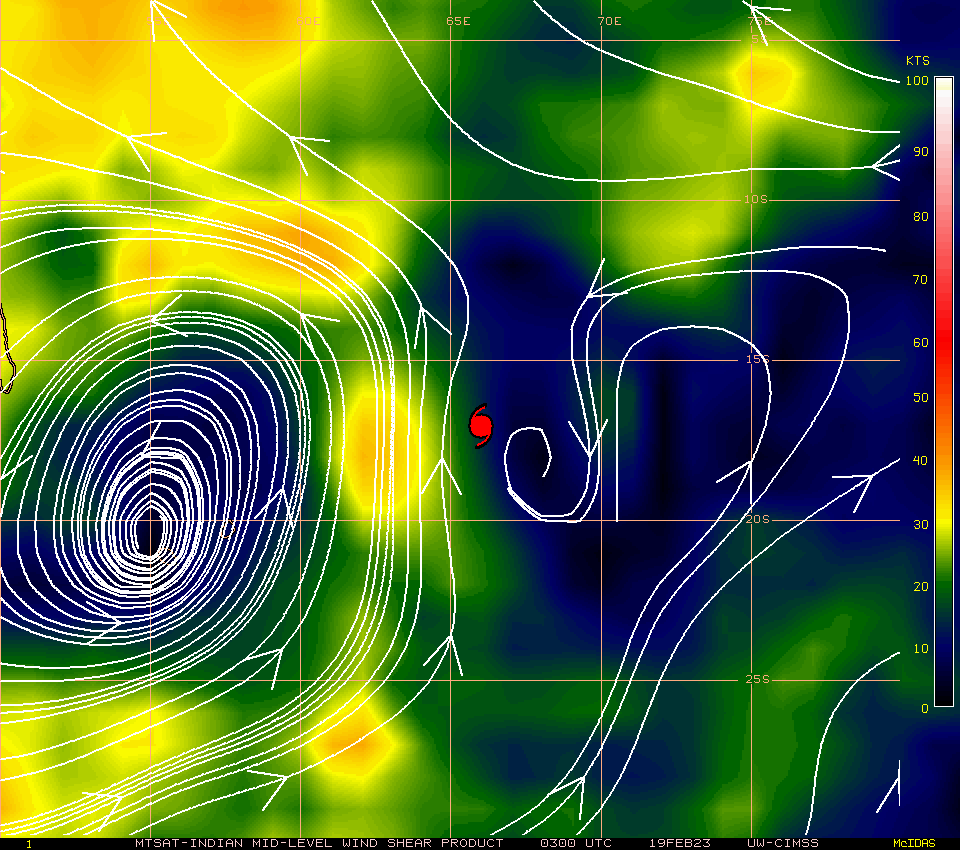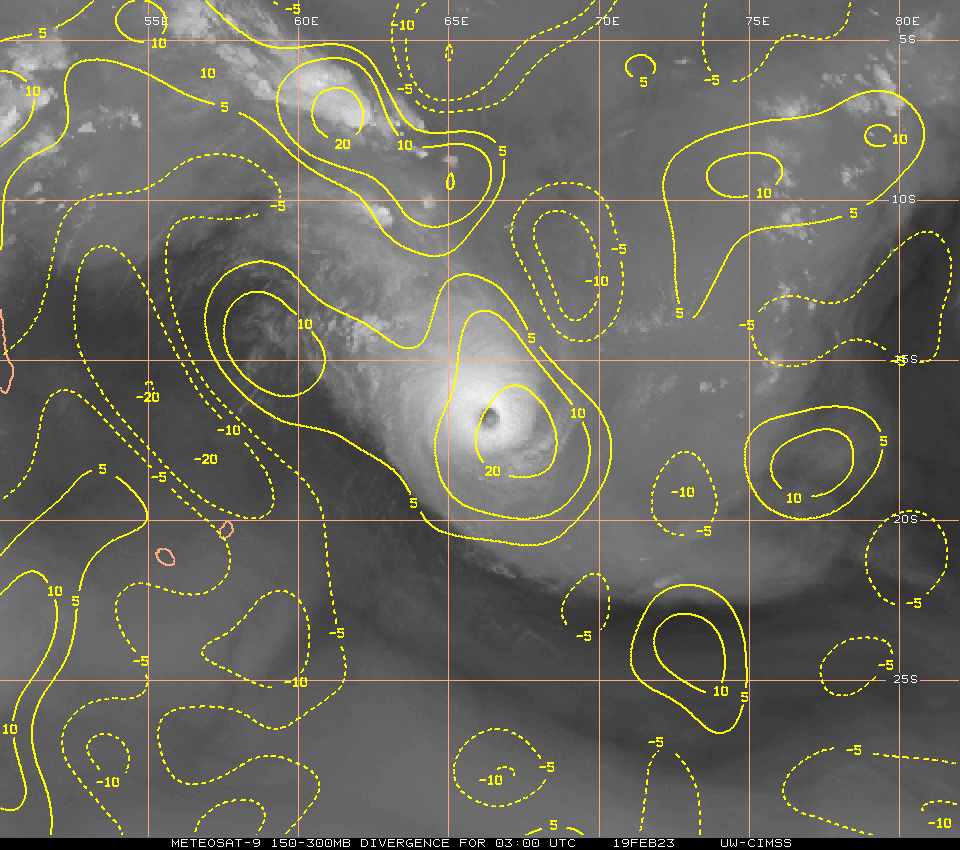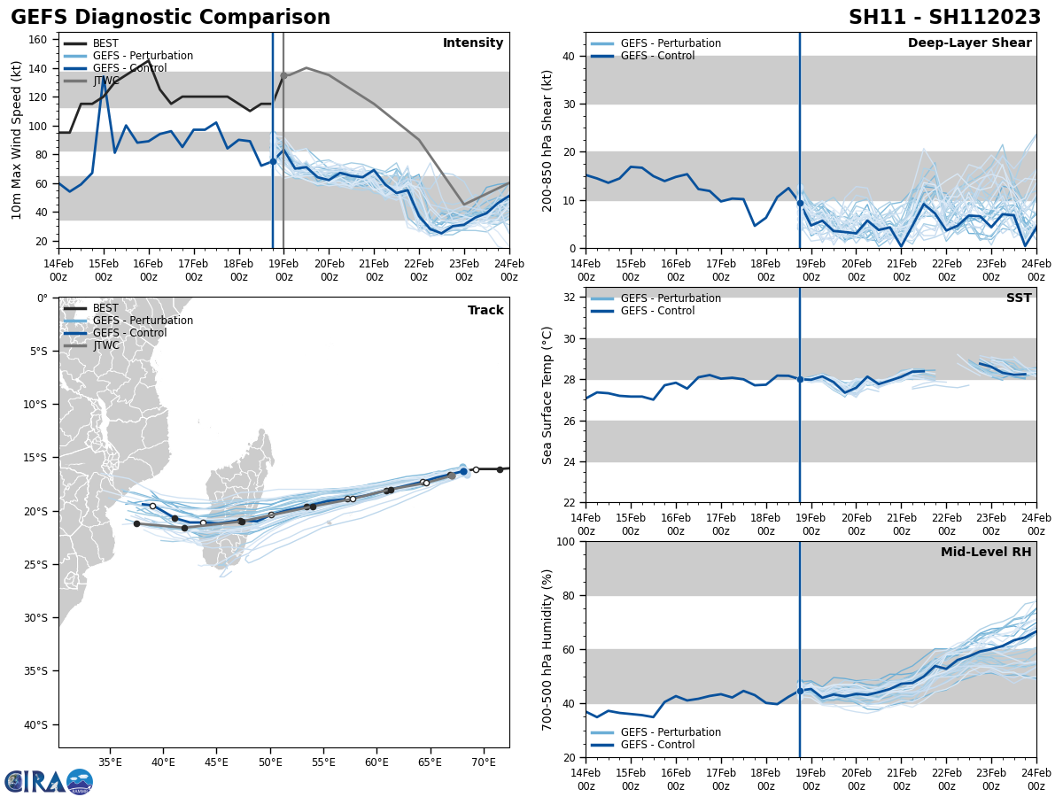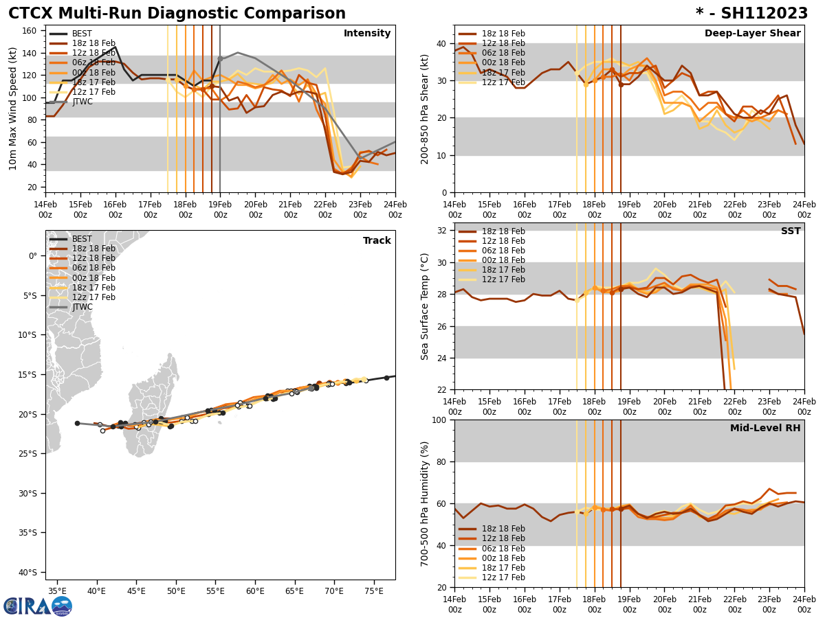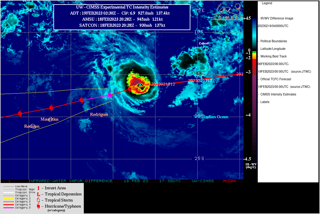 FORECAST REASONING. SIGNIFICANT FORECAST CHANGES: THERE ARE NO SIGNIFICANT CHANGES TO THE FORECAST FROM THE PREVIOUS WARNING. FORECAST DISCUSSION: TC FREDDY CONTINUES TO TRACK WEST-SOUTHWEST TOWARDS ITS RENDEZVOUS WITH MADAGASCAR. NO SIGNIFICANT CHANGE IN STEERING MECHANISM OR TRACK IS EXPECTED BEFORE LANDFALL ALONG THE EAST COAST OF MADAGASCAR. TRACK SPEEDS HAVE BEEN A CONSISTENT 11-12 KNOTS OVER THE PAST DAY, BUT SOME ACCELERATION IS EXPECTED AFTER TAU 24 AS THE RIDGE TO THE SOUTH BUILDS AND THE STEERING GRADIENT TIGHTENS UP A BIT. THE CURRENT FORECAST CALLS FOR THE SYSTEM TO TRACK SLIGHTLY FURTHER SOUTH THAN THE PREVIOUS FORECAST AND BRING IT INTO RELATIVELY CLOSE PROXIMITY OF BOTH MAURITIUS AND LA REUNION OVER THE NEXT 36 TO 48 HOURS, FOLLOWED BY LANDFALL AS A SIGNIFICANT TROPICAL CYCLONE ALONG THE EAST COAST OF MADAGASCAR AROUND TAU 60. AFTER CROSSING OVER THE ISLAND, THE SYSTEM WILL MOVE INTO THE MOZAMBIQUE CHANNEL. AS IT DOES SO, IT WILL COME UNDER THE STEERING INFLUENCE OF A DEVELOPING STR OVER SOUTH AFRICA AND GRADUALLY TURN ONTO A MORE WEST-NORTHWESTWARD TRACK TOWARDS MOZAMBIQUE. FROM AN INTENSITY PERSPECTIVE, SOME ADDITIONAL NEAR-TERM INTENSIFICATION IS POSSIBLE AS THERE IS NO INDICATION OF ANY EYEWALL REPLACEMENT CYCLES (EWRC) NOR ANY EXPECTED CHANGES IN THE ENVIRONMENT. THE ONLY FACTOR THAT COULD LIMIT A RUN AT 140 KNOTS WILL BE INNER-CORE DYNAMICAL FACTORS SUCH AS EYE ENLARGEMENT AND INNER-CORE INTRUSIONS FROM THE NEARBY POOL OF MID-LEVEL DRY AIR. AFTER TAU 24 HOWEVER, A STEADY BUT SLOW WEAKENING TREND IS EXPECTED AS THE SYSTEM MOVES OVER WATERS THAT WHILE STILL SUFFICIENTLY WARM, LACK SIGNIFICANT OHC. IT MUST BE MENTIONED HOWEVER THAT A POOL OF VERY WARM, HIGH OHC WATERS LIES DIRECTLY ALONG THE COAST OF MADAGASCAR AND COULD PROVIDE A SHORT-TERM BOOST IN INTENSITY JUST PRIOR TO LANDFALL, THOUGH THE SYSTEM WILL BE MOVING FAIRLY QUICKLY AND THIS WILL LIMIT THE POSSIBLE INTENSIFICATION. THE SYSTEM WILL RAPIDLY WEAKEN AS IT CROSSES MADAGASCAR AND IS EXPECTED TO BE A WEAK TROPICAL STORM AS IT MOVES OFF THE WEST COAST. ENVIRONMENTAL CONDITIONS ARE FORECAST TO BE VERY FAVORABLE IN THE MOZAMBIQUE CHANNEL AND WILL SUPPORT A FAIRLY QUICK REINTENSIFICATION OF THE SYSTEM AS IT MOVES TOWARDS EAST AFRICA.