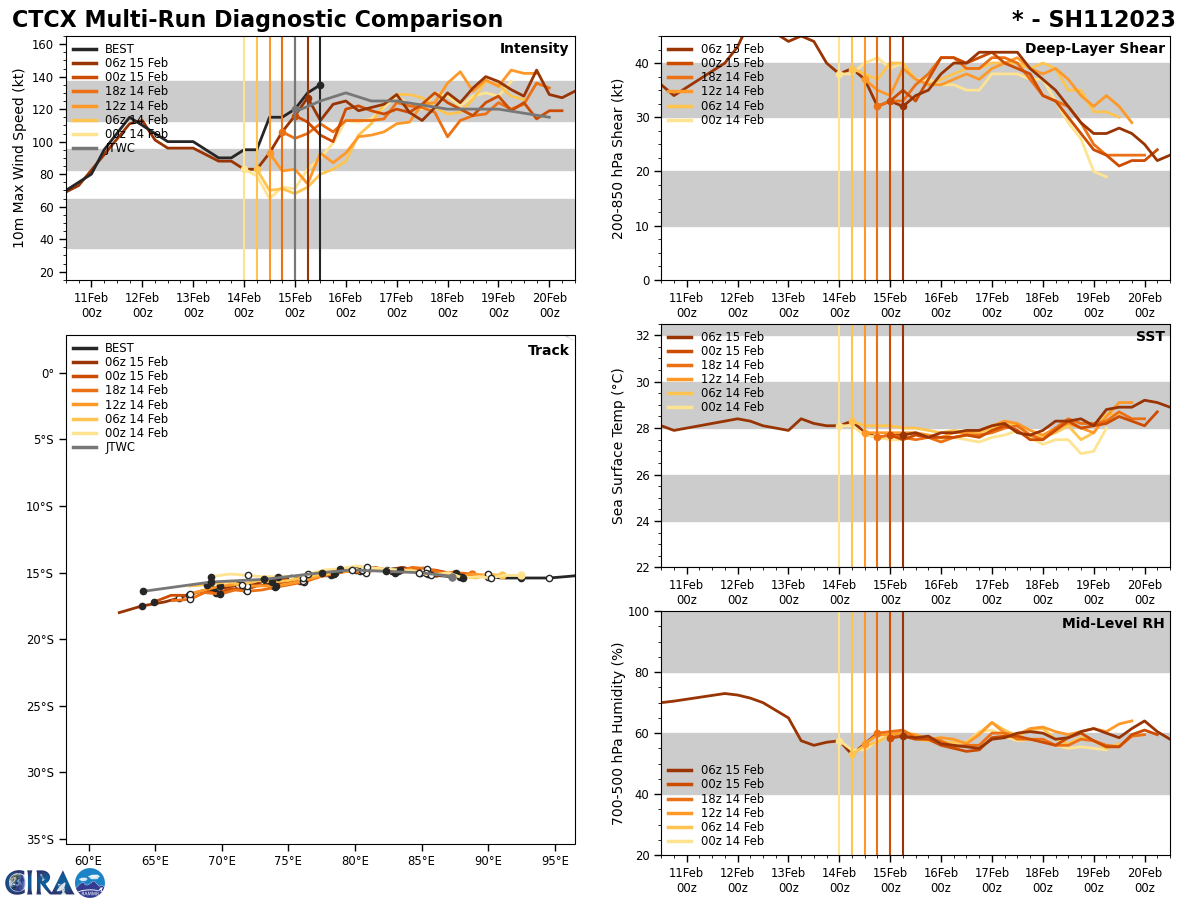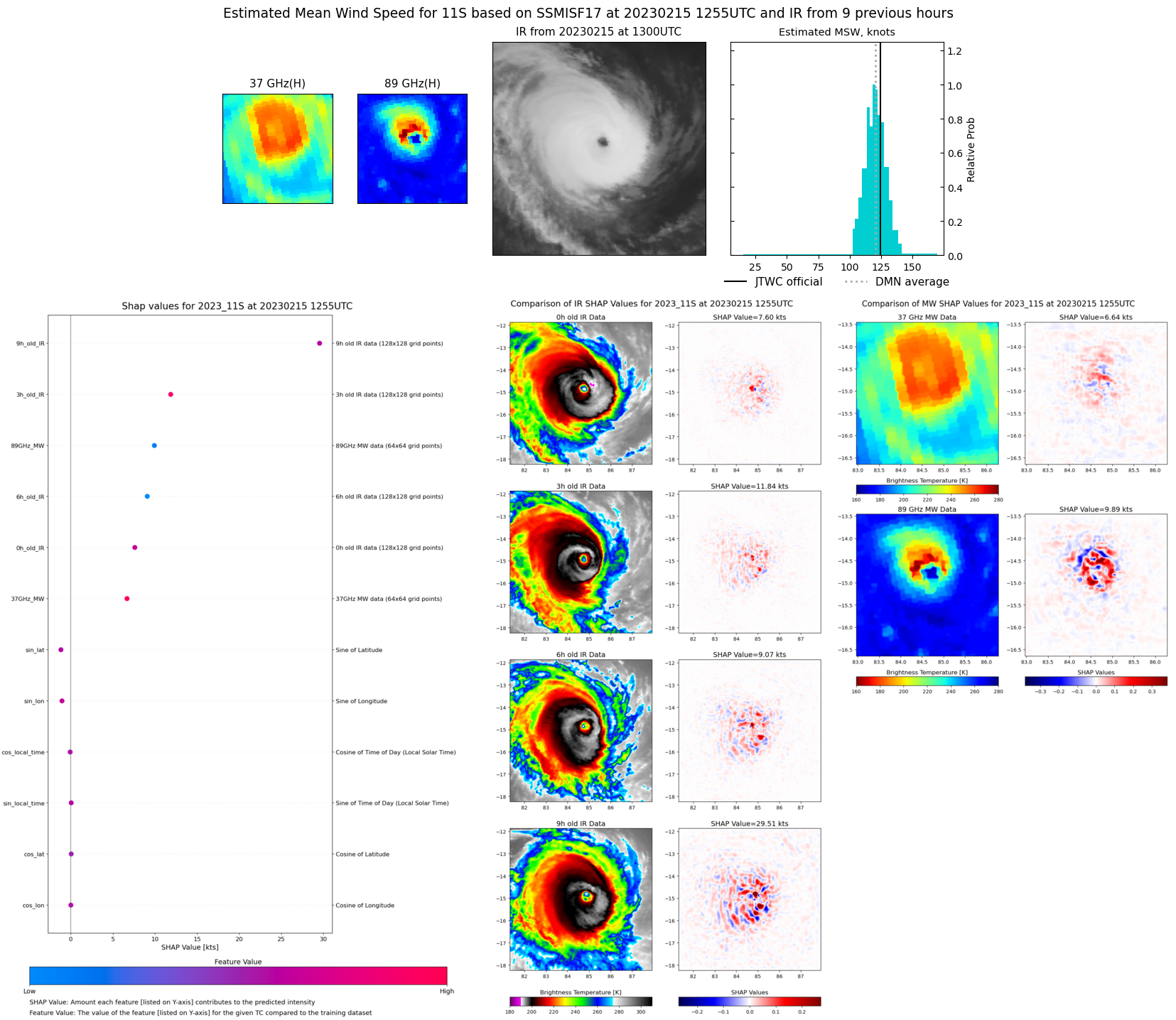 SATELLITE ANALYSIS, INITIAL POSITION AND INTENSITY DISCUSSION: ANIMATED MULTISPECTRAL SATELLITE IMAGERY (MSI) AND A 151256Z SSMIS 91GHZ IMAGE DEPICT A VERY WELL ORGANIZED SYSTEM WITH A 13 NM DIAMETER EYE. THERE IS EVIDENCE OF PRESSURE ON THE EASTERN PERIPHERY AS THE SYSTEM IS TRACKING UNDER AN AREA OF WESTWARD UPPER-LEVEL WIND FLOW ESTIMATED AT 35-40 KNOTS. ENVIRONMENTAL ANALYSIS INDICATES TC 11S TO BE IN MARGINALLY FAVORABLE CONDITIONS FOR CONTINUAL TROPICAL DEVELOPMENT. THESE CONDITIONS ARE CHARACTERIZED BY THE AFOREMENTIONED OUTFLOW ALOFT, MODERATE (15-20 KTS) VERTICAL WIND SHEAR (VWS), A VERY STRONG 850 MB VORTICITY SIGNATURE, AND WARM (27-28 C) SEA SURFACE TEMPERATURES (SST). THE INITIAL POSITION IS PLACED WITH HIGH CONFIDENCE BASED ON THE ABOVE MENTIONED MSI AND MICROWAVE IMAGERY. THE INITIAL INTENSITY OF 135 KTS IS ASSESSED WITH MEDIUM CONFIDENCE BASED ON A BLEND OF MULTI-AGENCY AND AUTOMATED DVORAK ESTIMATES.