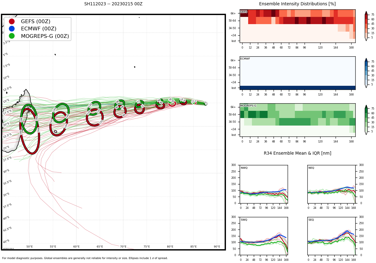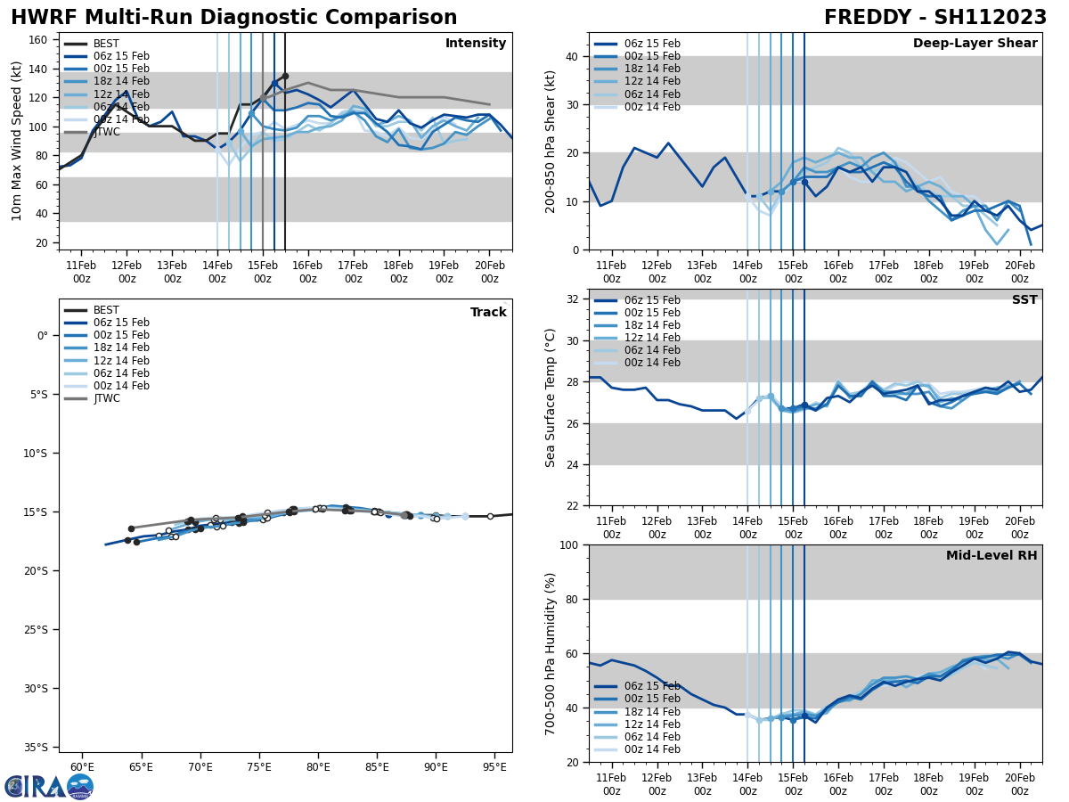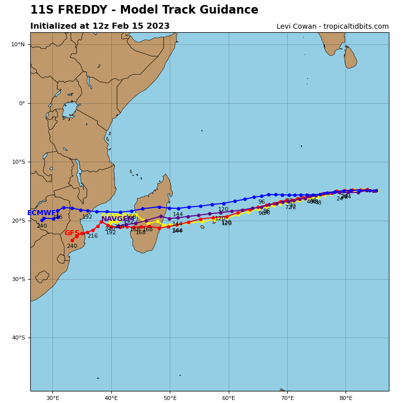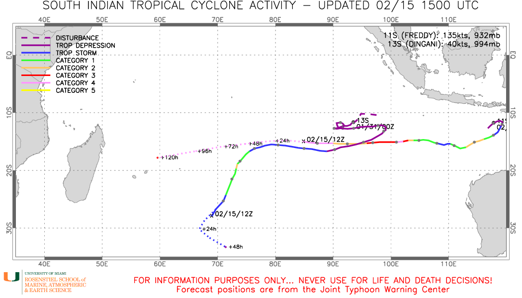 FORECAST REASONING. SIGNIFICANT FORECAST CHANGES: THERE ARE NO SIGNIFICANT CHANGES TO THE FORECAST FROM THE PREVIOUS WARNING. FORECAST DISCUSSION: TC FREDDY CONTINUES ITS WESTWARD TRACK AS IT TRANSITS THE NORTHERN PERIPHERY OF THE STR TO THE SOUTH. THE SYSTEM WILL CONTINUE THIS TRAJECTORY UNTIL APPROXIMATELY TAU 36 WHEN IT WILL EXPERIENCE A SLIGHT DIP WEST-SOUTHWESTWARD DUE TO THE SUPPORTING STR MIGRATING TO THE EAST. THERE IS COPIOUS AMOUNTS OF DRY AIR SURROUNDING THE SYSTEM, HOWEVER, TC FREDDY WILL STAY COCOONED IN ITS OWN MOISTURE POCKET DURING ITS FORECAST TRACK. TC 11S IS FORECAST TO SLOWLY BUT SURELY DECREASE IN INTENSITY THROUGHOUT THE FORECAST PERIOD, CONVERSELY, THE SYSTEM HAS UNDERGONE THREE PEAK INTENSITY EVENTS AND THE POSSIBILITY OF A FOURTH EVENT SHOULD NOT BE RULED OUT.