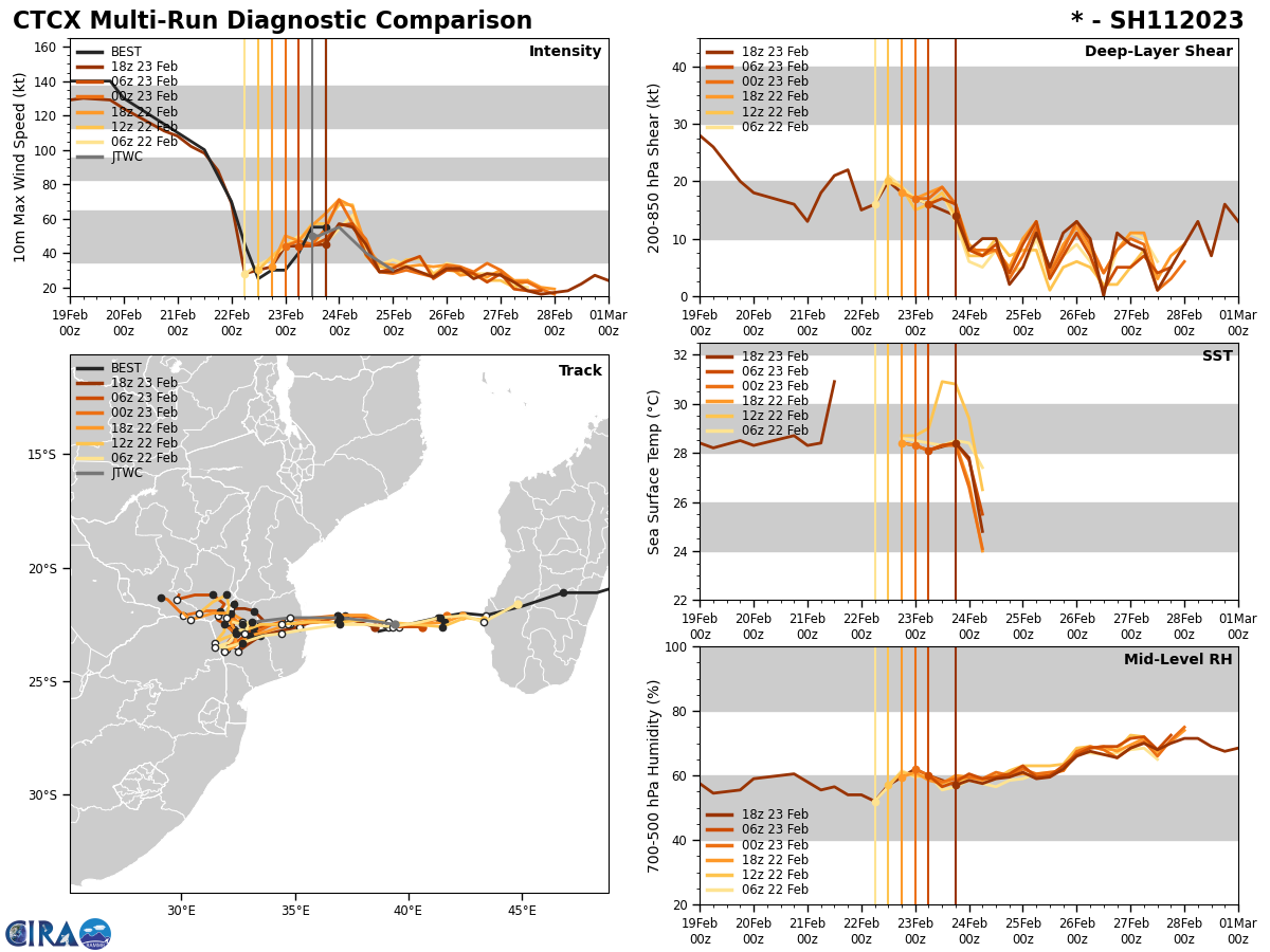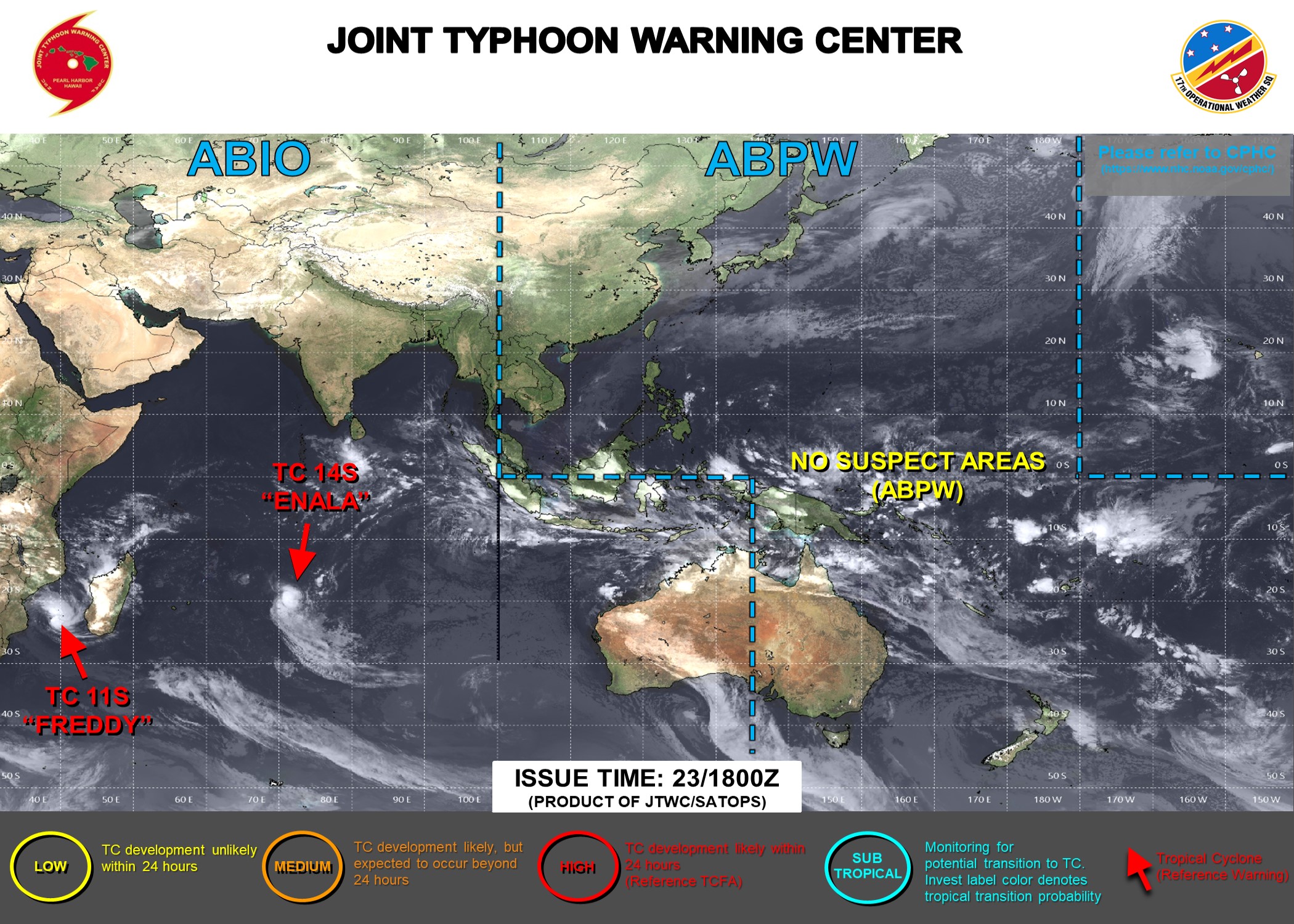 AFTER TRAVELING OVER 5500 MILES ACROSS THE SOUTHERN INDIAN OCEAN, TC 11S (FREDDY) IS FINALLY ENTERING THE TWILIGHT OF ITS LIFE CYCLE AND WILL SHORTLY MAKE A SECOND LANDFALL ALONG THE COAST OF MOZAMBIQUE. BUT TC FREDDY IS NOT YET READY TO GIVE UP THE GHOST COMPLETELY, AND HAS STEADILY, BUT RATHER SLOWLY, INTENSIFIED ONCE MORE AFTER MOVING INTO THE FAVORABLE ENVIRONMENT OF THE MOZAMBIQUE CHANNEL. SINCE THE PREVIOUS FORECAST, THE SYSTEM HAS PASSED DIRECTLY OVER EUROPA ISLAND, WHICH RECORDED A SIX HOUR PLUS PERIOD OF SUSTAINED 50-60 KNOT WINDS AS A WELL-DEFINED CONVECTIVE BAND ON THE EASTERN SIDE OF THE SYSTEM REMAINED STATIONARY OVER THE ISLAND. ANIMATED ENHANCED INFRARED (EIR) SATELLITE IMAGERY DEPICTS A SHRIMP-SHAPED STRUCTURE, WITH A SMALL CORE OF CONVECTION BUBBLING NEAR THE ASSESSED CENTER, AND A BANDING FEATURE EXTENDING UP TO THE NORTHEAST. THE INITIAL POSITION IS ASSESSED WITH MEDIUM CONFIDENCE, BASED ON A CONFLUENCE OF AGENCY FIX POSITIONS AND NEAR A WARM SPOT IN THE EIR IMAGERY. THE INITIAL INTENSITY IS ASSESSED ABOVE THE BULK OF THE SUBJECTIVE AND OBJECTIVE ESTIMATES, BASED PRIMARILY ON THE PGTW DVORAK CURRENT INTENSITY ESTIMATE OF T4.0. A 222210Z AMSR2 WINDSPEED ESTIMATE SHOWED MAX WINDS NEAR 55 KNOTS IN THE SOUTHEAST QUADRANT. THE ENVIRONMENT REMAINS FAVORABLE WITH LOW VWS, AND GOOD POLEWARD OUTFLOW AND A POOL OF WARM (29-30C) WATERS LYING DIRECTLY ON THE COAST.