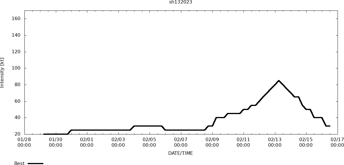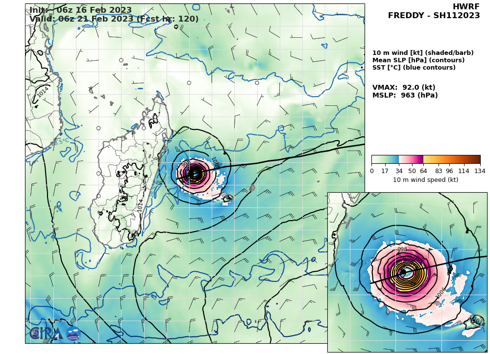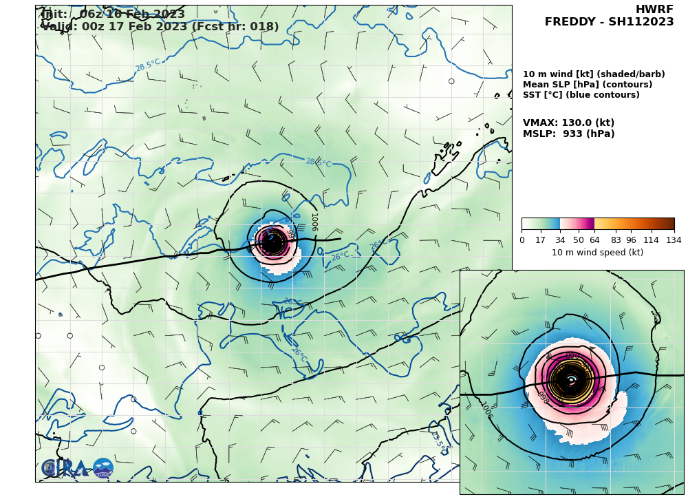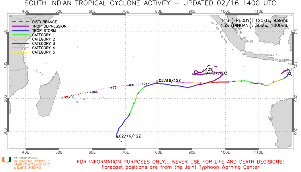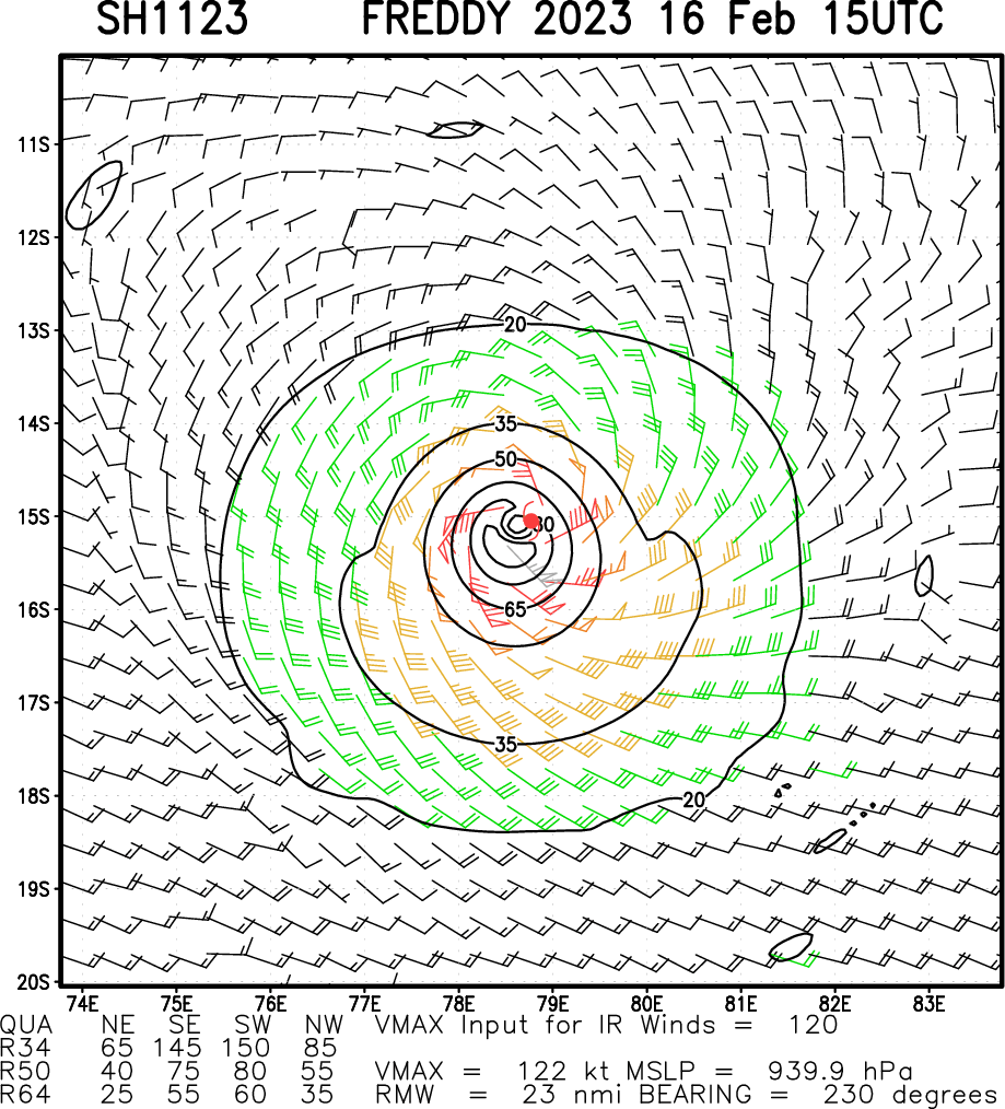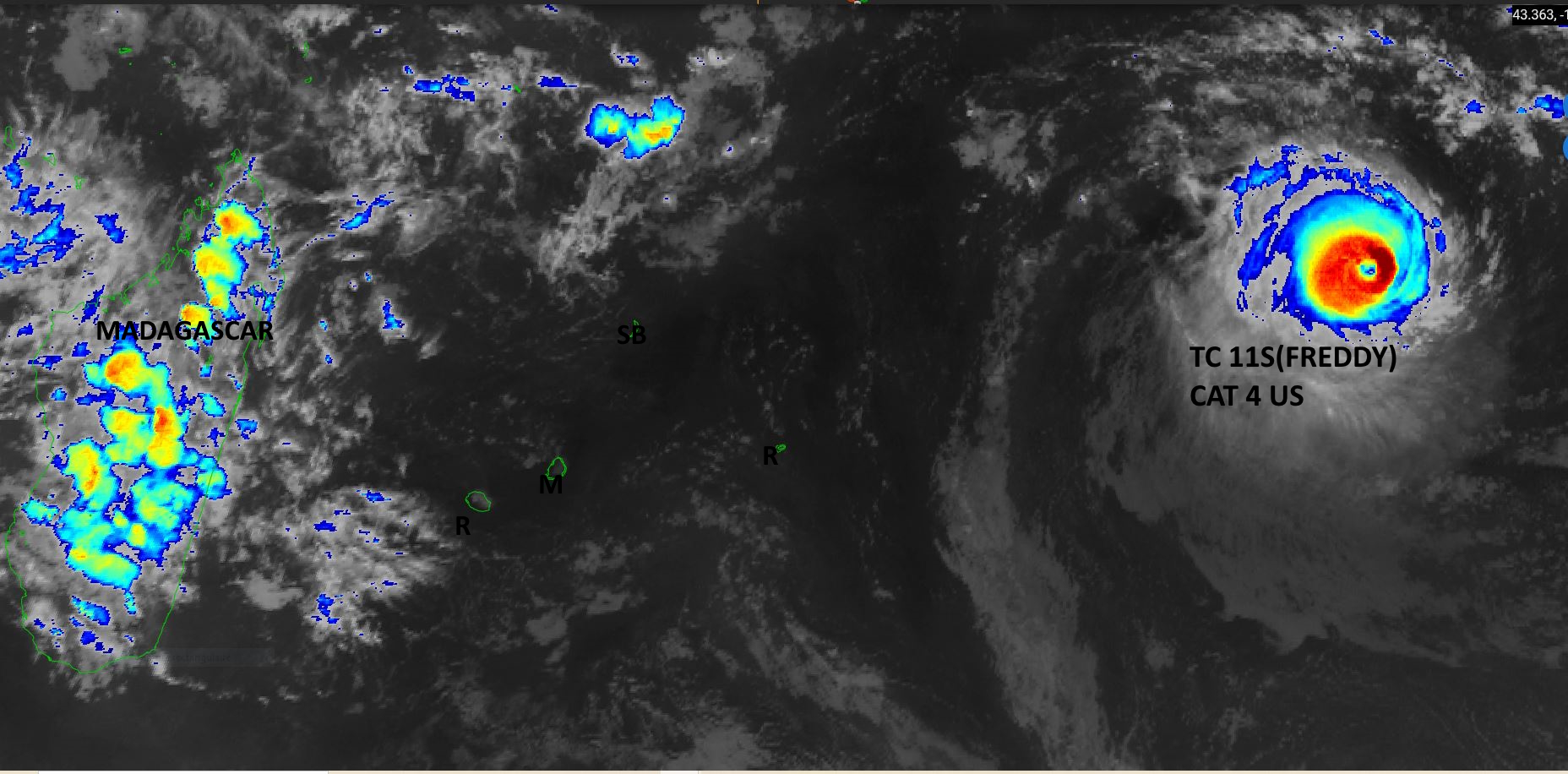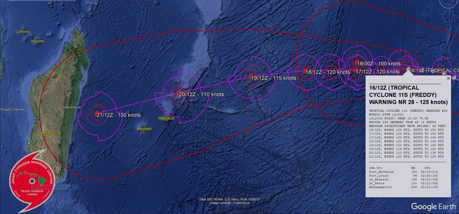 SIO: TC 11S(FREDDY). CURRENT ESTIMATED INTENSITY IS 125 KNOTS CAT 4 US. POST ANALYSIS REVEALS TC 11S PEAKED AT 145KNOTS CAT 5 US.