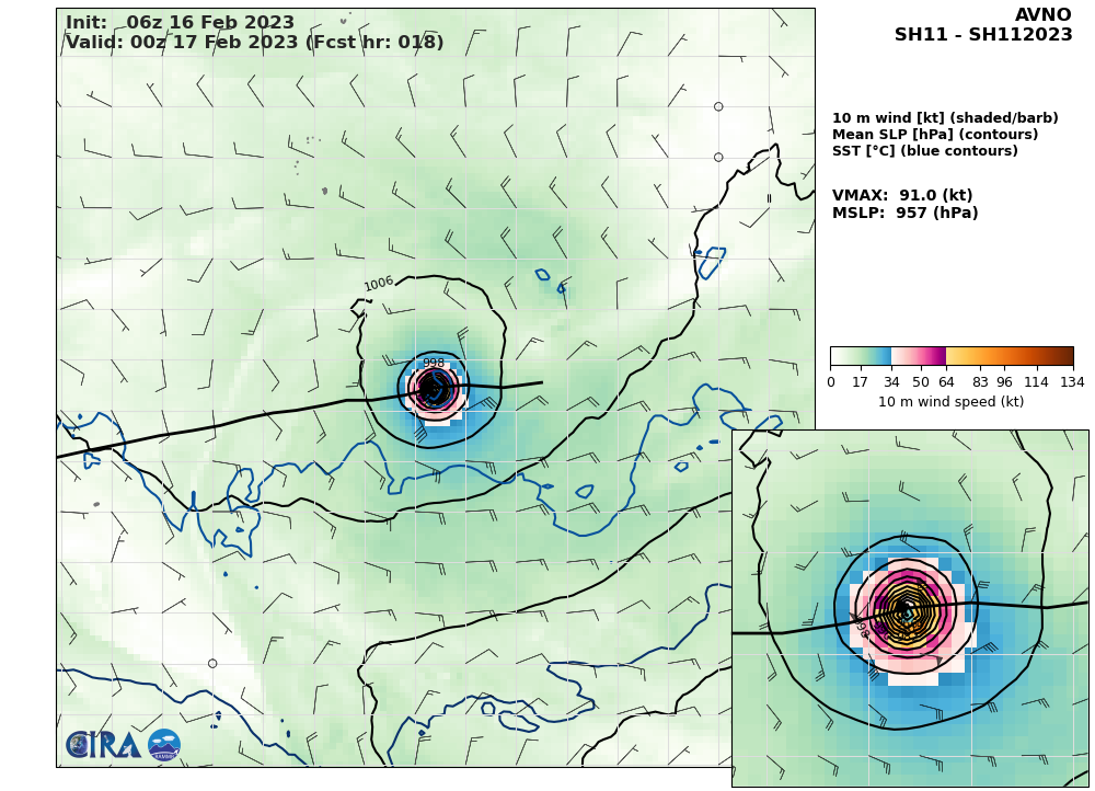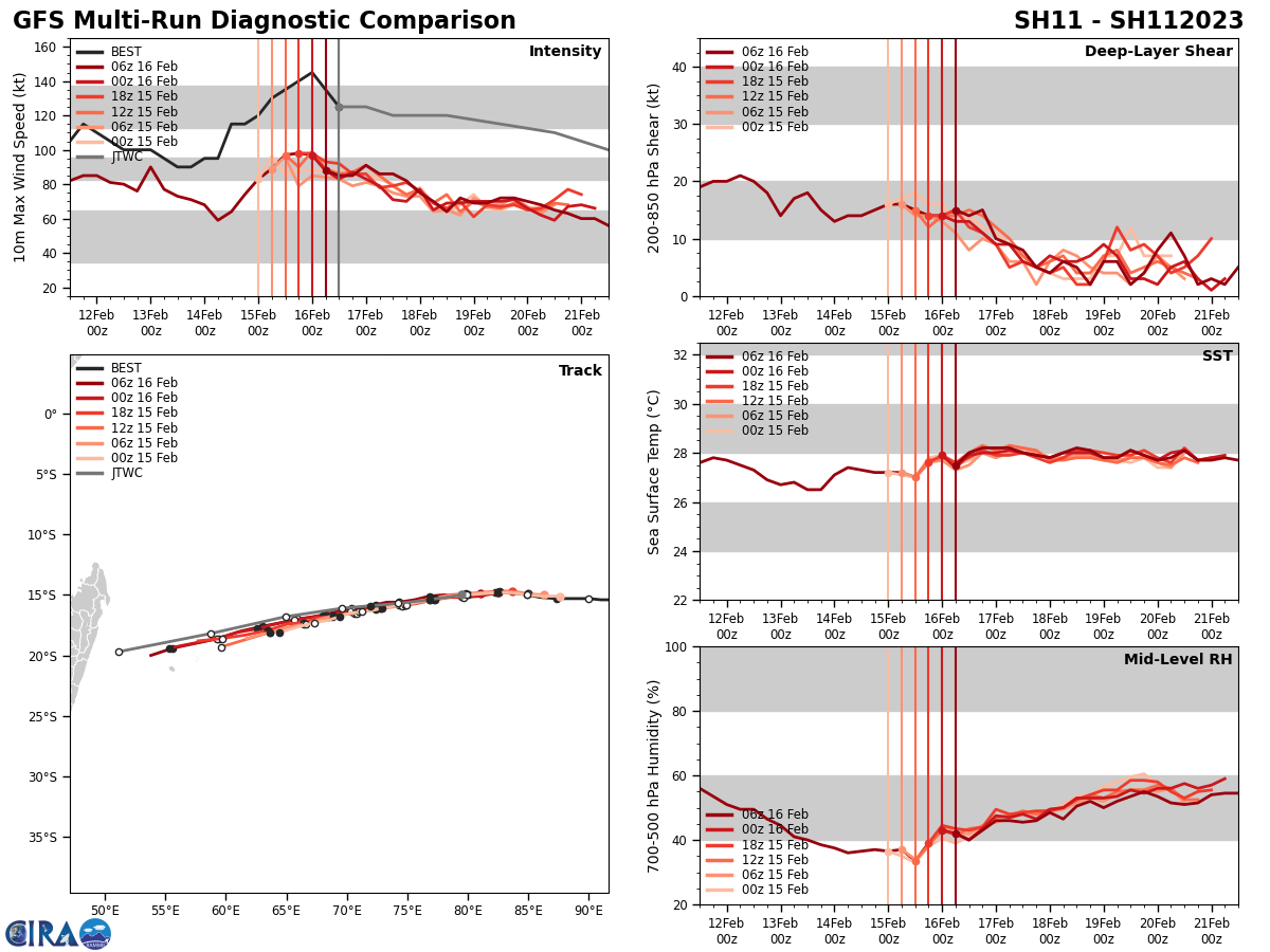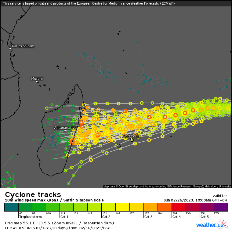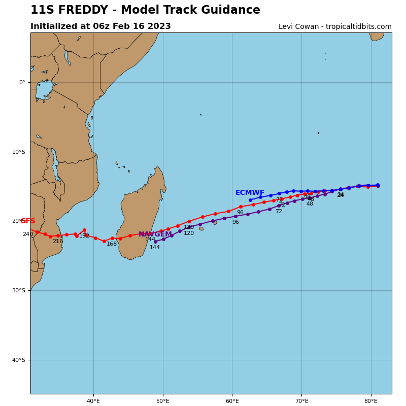 MODEL DISCUSSION: NUMERICAL MODEL GUIDANCE IS IN GOOD AGREEMENT THROUGH TAU 72 WITH A 120NM CROSS-TRACK SPREAD IN SOLUTIONS AT TAU 72. AFTER TAU 72, THE CROSS-TRACK SPREAD WILL INCREASE TO 250NM BY TAU 120 WITH INCREASING UNCERTAINTY IN THE EXACT FORECAST TRACK. BOTH THE ECMWF (EPS) AND GFS (GEFS) ENSEMBLES INDICATE A HIGH PROBABILITY OF LANDFALL OCCURRING OVER CENTRAL MADAGASCAR. THE 160000Z COAMPS-TC ENSEMBLE INDICATES RAPID INTENSIFICATION IS UNLIKELY, HOWEVER, IT DOES SHOW A 40 PERCENT PROBABILITY OF MODERATE INTENSIFICATION IN THE TAU 36 TO TAU 60 TIME PERIOD. RELIABLE INTENSITY GUIDANCE SUPPORTS A STEADY WEAKENING TREND THROUGH THE FORECAST PERIOD, HOWEVER, DECAY-SHIP (GFS VERSION) DOES INDICATE A MODEST 10-KNOT INCREASE FROM 115 TO 125 KNOTS IN THAT SAME TIME RANGE.