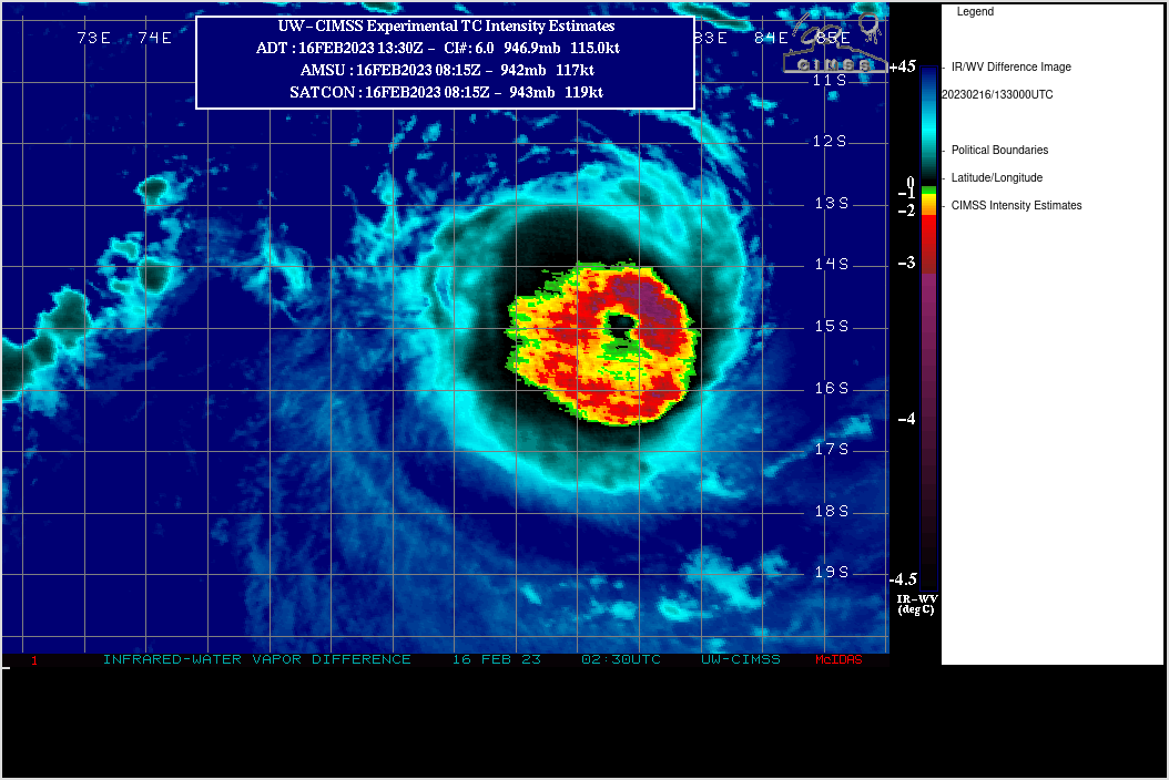 SATELLITE ANALYSIS, INITIAL POSITION AND INTENSITY DISCUSSION: TROPICAL CYCLONE (TC) 11S HAS WEAKENED OVER THE PAST 12 HOURS WITH WARMING CLOUD TOP TEMPERATURES AND A COOLING EYE TEMPERATURE EVIDENT IN ANIMATED ENHANCED INFRARED (EIR) SATELLITE IMAGERY. ADDITIONALLY, EIR IMAGERY DEPICTS A MORE OBLONG STRUCTURE TO BOTH THE EYE AND SYSTEM WITH A BREAK IN THE EYEWALL OVER THE EASTERN QUADRANT. A 161056Z SSMIS 91GHZ COLOR COMPOSITE MICROWAVE IMAGE SHOWS A SYMMETRIC CORE WITH A SMALL 15NM DIAMETER MICROWAVE EYE FEATURE, WHICH SUPPORTS THE INITIAL POSITION WITH HIGH CONFIDENCE. ANIMATED WATER VAPOR IMAGERY CONTINUES TO SHOW RADIAL OUTFLOW THUS ENVIRONMENTAL CONDITIONS REMAIN FAVORABLE. BASED ON THE STEADY WEAKENING TREND SINCE ABOUT 160000Z, DVORAK DATA-T ESTIMATES HAVE DECREASED TO THE T5.5-T6.0 (102-115 KNOTS) RANGE, HOWEVER, THE INITIAL INTENSITY IS HELD CLOSER TO THE PGTW, DEMS, FMEE CURRENT INTENSITY ESTIMATES OF 6.5 (127 KNOTS). IN GENERAL, OBJECTIVE ESTIMATES RANGE FROM 110-120 KNOTS TO INCLUDE SATCON, ADT, AIDT, OPEN-AIIR AND DMN.