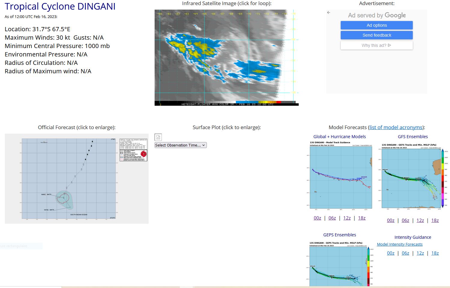 REMARKS: 160900Z POSITION NEAR 31.5S 67.7E. 16FEB23. TROPICAL CYCLONE (TC) 13S (DINGANI), LOCATED APPROXIMATELY 851 NM SOUTHEAST OF PORT LOUIS, MAURITIUS, HAS TRACKED SOUTHWARD AT 08 KNOTS OVER THE PAST SIX HOURS. ANIMATED MULTISPECTRAL SATELLITE IMAGERY DEPICTS A SHALLOW, WELL-DEFINED LOW-LEVEL CIRCULATION WITH NO DEEP CONVECTION. THE SYSTEM IS LOCATED UNDER AN UPPER-LEVEL SUBTROPICAL TROUGH, POLEWARD OF THE SUBTROPICAL JET WITH HIGH VERTICAL WIND SHEAR AND A DRY ATMOSPHERE. THE SYSTEM HAS STEADILY WEAKENED WITHIN AN UNFAVORABLE ENVIRONMENT WITH COOL SST (22-23C) AND PERSISTENT HIGH VWS, AND IS EXPECTED TO DISSIPATE BY TAU 12. THIS IS THE FINAL WARNING ON THIS SYSTEM BY THE JOINT TYPHOON WRNCEN PEARL HARBOR HI. THE SYSTEM WILL BE CLOSELY MONITORED FOR SIGNS OF REGENERATION. MAXIMUM SIGNIFICANT WAVE HEIGHT AT 160600Z IS 17 FEET.