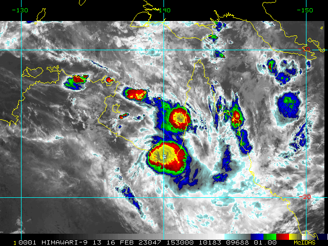 THE AREA OF CONVECTION (INVEST 91P) PREVIOUSLY LOCATED NEAR 14.9S 139.5E IS NOW LOCATED NEAR 15.0S 139.1E, APPROXIMATELY 102 NM NORTH OF MORNINGTON ISLAND, AUSTRALIA. ANIMATED MULTISPECTRAL SATELLITE IMAGERY (MSI) AND ANIMATED RADAR IMAGERY DEPICT A DISORGANIZED LOW-LEVEL CIRCULATION (LLC). A 160032Z METOP-C IMAGE SHOWS A BROAD AND ELONGATED CIRCULATION. ENVIRONMENTAL ANALYSIS REVEALS THAT INVEST 91P IS IN A MARGINAL ENVIRONMENT FOR INTENSIFICATION DUE TO MODERATE TO HIGH (20-25) VWS, MODERATE POLEWARD OUTFLOW ALOFT, AND VERY WARM (29-30C) SST. GLOBAL MODELS ARE IN AGREEMENT THAT INVEST 91P WILL TRACK SOUTHEASTWARD BEFORE RECURVING SOUTHWEST, MAKING LANDFALL OVER NORTHERN AUSTRALIA WITHIN THE NEXT 24 HOURS. MAXIMUM SUSTAINED SURFACE WINDS ARE ESTIMATED AT 25 TO 30 KNOTS. MINIMUM SEA LEVEL PRESSURE IS ESTIMATED TO BE NEAR 998 MB. THE POTENTIAL FOR THE DEVELOPMENT OF A SIGNIFICANT TROPICAL CYCLONE WITHIN THE NEXT 24 HOURS REMAINS LOW.