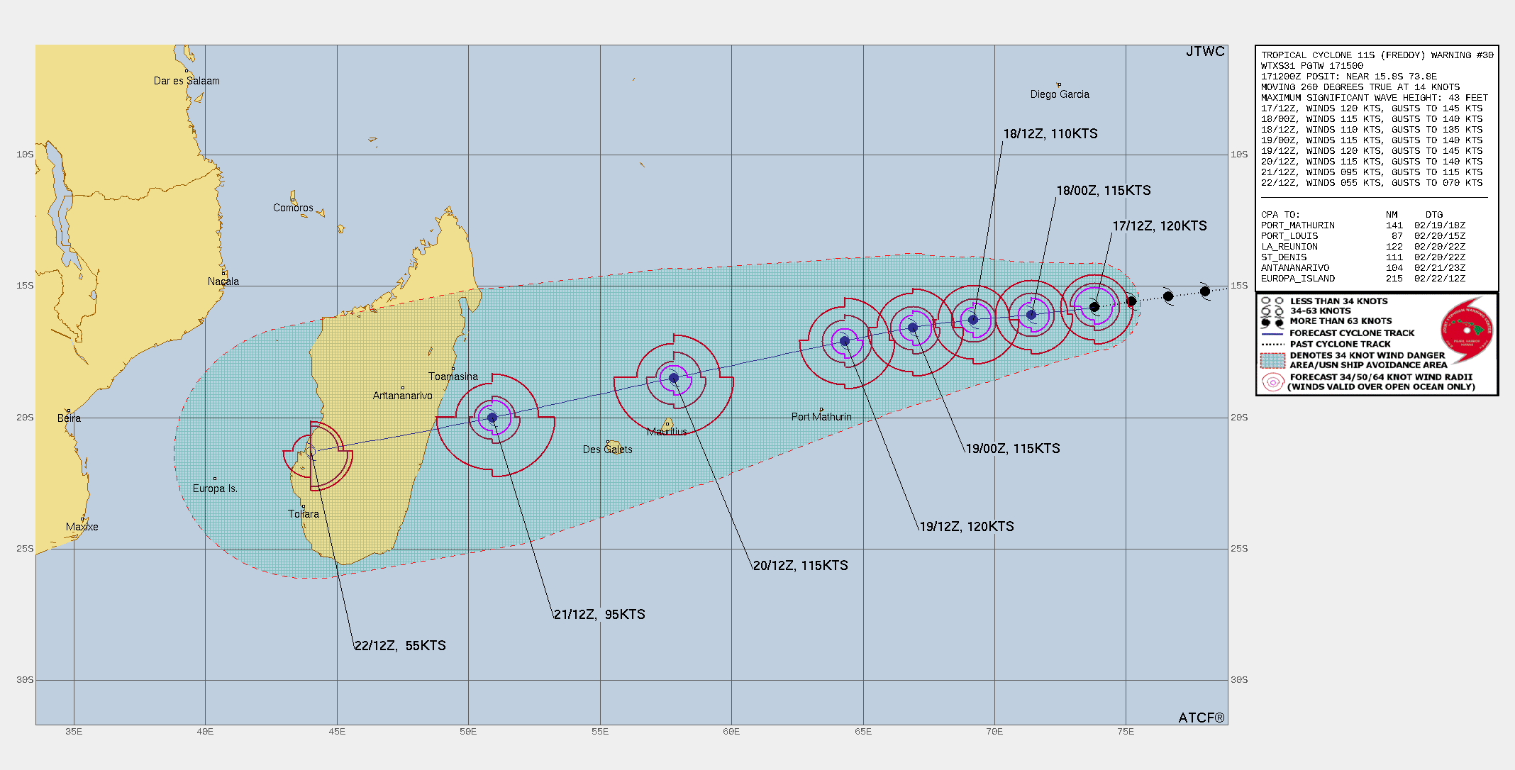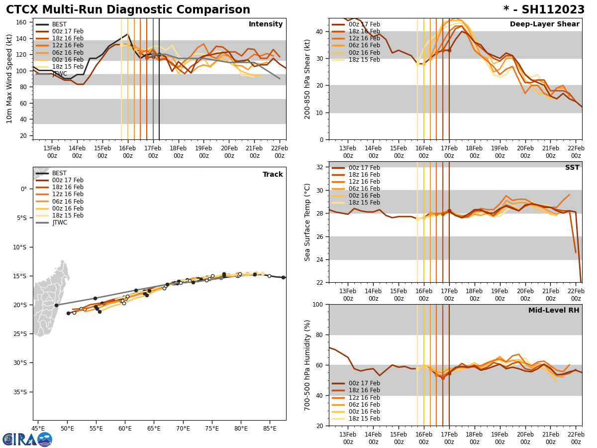 MODEL DISCUSSION: WITH THE EXCEPTION OF AFUM, WHICH RECURVES THE SYSTEM SOUTHWESTWARD OVER SOUTHERN MADAGASCAR, NUMERICAL MODEL GUIDANCE IS IN TIGHT AGREEMENT WITH A 60NM TO 115NM SPREAD IN SOLUTIONS FROM TAU 72 TO TAU 120. THE BULK OF THE EPS AND GEFS SOLUTIONS INDICATE A HIGH PROBABILITY OF LANDFALL OCCURRING OVER CENTRAL MADAGASCAR HOWEVER THERE IS A LARGER SPREAD OF SOLUTIONS THAT EXTEND OVER SOUTHERN MADAGASCAR. THE 170000Z COAMPS-TC ENSEMBLE INDICATES A 60 TO 70 PERCENT PROBABILITY OF MODERATE INTENSIFICATION OCCURRING FROM TAU 24 TO TAU 72 AS THE SYSTEM PASSES NORTH OF PORT MATHURIN AND MAURITIUS.
