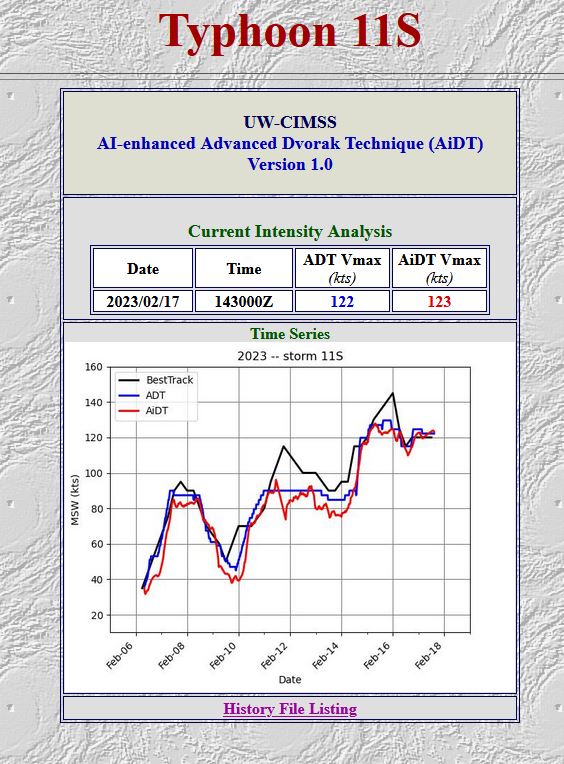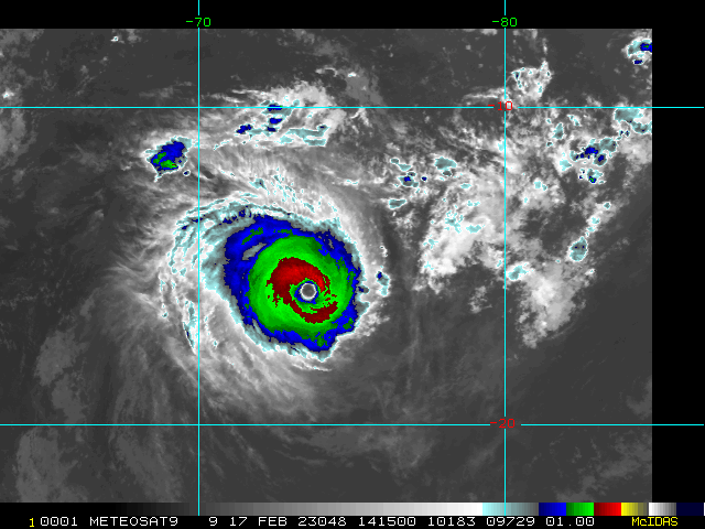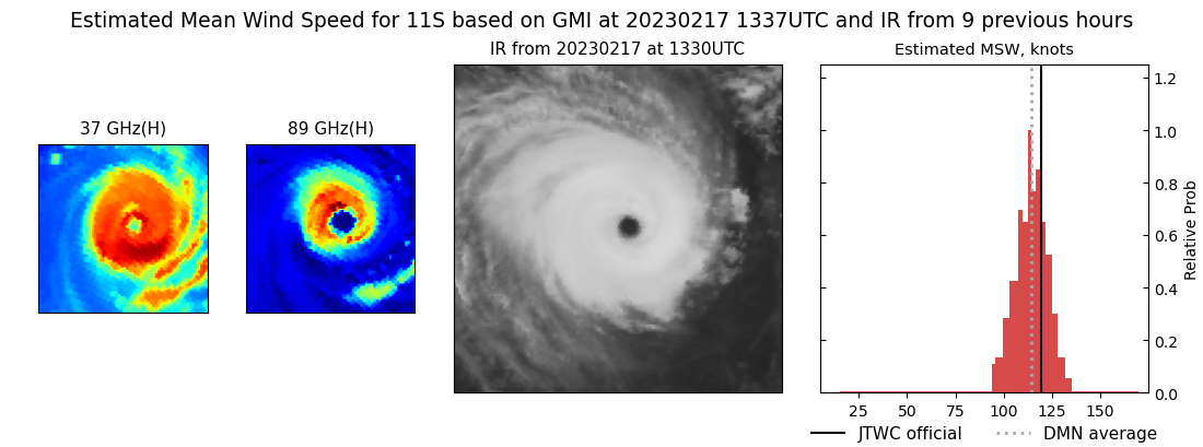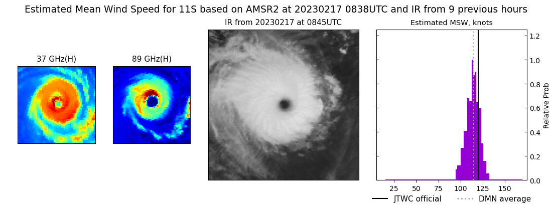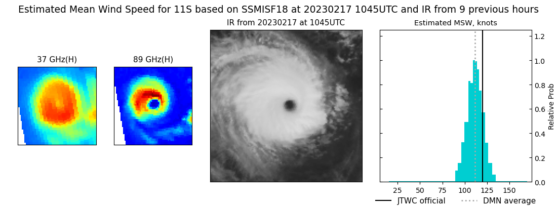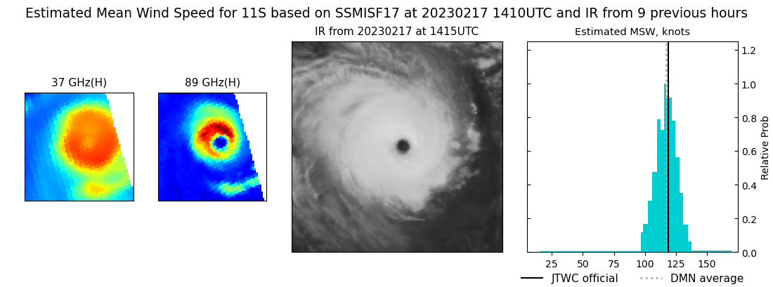 SATELLITE ANALYSIS, INITIAL POSITION AND INTENSITY DISCUSSION: OVER THE PAST 12 HOURS, TROPICAL CYCLONE (TC) 11S HAS CONSOLIDATED WITH A MORE SYMMETRIC STRUCTURE AND WARMER EYE. ANIMATED ENHANCED INFRARED (EIR) SATELLITE IMAGERY DEPICTS A SYMMETRIC CORE SURROUNDING A 20NM DIAMETER ROUND EYE WITH A 17.3C EYE TEMPERATURE. ALTHOUGH THE SYSTEM MAY APPEAR ANNULAR AT TIMES, IT IS CLEARLY NOT ANNULAR; CLOUD TOP TEMPERATURES ARE NOT UNIFORM AND A 171248Z SSMIS 91GHZ MICROWAVE IMAGE SHOWS CONVECTIVE BANDING OVER THE WESTERN SEMICIRCLE. ANIMATED WATER VAPOR IMAGERY CONTINUES TO INDICATE RADIAL OUTFLOW AND ENVIRONMENTAL CONDITIONS REMAIN FAVORABLE WITH LOW VERTICAL WIND SHEAR AND WARM (28C) SST VALUES. THE INITIAL POSITION IS PLACED WITH HIGH CONFIDENCE BASED ON RECENT EWS-G1 SATELLITE IMAGERY AND THE SSMIS 91GHZ IMAGE. THE INITIAL INTENSITY OF 120 KTS IS ASSESSED WITH HIGH CONFIDENCE BASED ON THE SUBJECTIVE DVORAK ESTIMATES RANGING FROM 115 TO 127 KNOTS AS WELL AS ADT AND AIDT ESTIMATES OF 122 AND 124 KNOTS. RECENT DMN AND OPEN-AIIR ESTIMATES ALSO SUPPORT THIS ASSESSMENT AND RANGE FROM 115 TO 120 KNOTS.