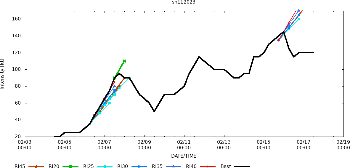FORECAST REASONING. SIGNIFICANT FORECAST CHANGES: THERE ARE NO SIGNIFICANT CHANGES TO THE FORECAST FROM THE PREVIOUS WARNING. FORECAST DISCUSSION: TC 11S WILL CONTINUE TO TRACK WESTWARD THROUGH TAU 48 ALONG THE NORTHERN PERIPHERY OF THE STR. AFTER TAU 48, THE SYSTEM WILL TURN WEST-SOUTHWESTWARD AS THE STR REORIENTS TO THE SOUTHEAST WITH THE APPROACH OF A MAJOR SHORTWAVE TROUGH. THIS TROUGH IS EXPECTED TO FILL AND PROPAGATE QUICKLY EASTWARD, WHICH WILL ALLOW TC 11S TO RETURN TO A MORE WESTWARD TRACK NEAR TAU 120. DESPITE DRY AIR ENTRAINING AROUND THE PERIPHERY OF THE SYSTEM AND POSSIBLE UPWELLING COOL WATER, TC 11S REMAINS RESILIENT AND CONTINUES TO TRACK STEADILY WESTWARD AT 14 KNOTS. TC 11S IS EXPECTED TO WEAKEN SLIGHTLY BY TAU 24 BUT IS EXPECTED TO REINTENSIFY SLIGHTLY TO 120 KNOTS BY TAU 48. AFTER TAU 72, STEADY WEAKENING IS ANTICIPATED AS THE SYSTEM APPROACHES MADAGASCAR NEAR TAU 96 THEN RAPID WEAKENING AS THE SYSTEM TRACKS OVER MADAGASCAR.
