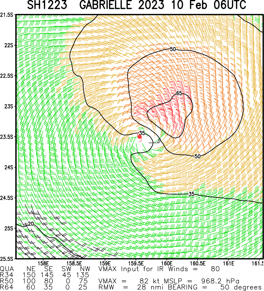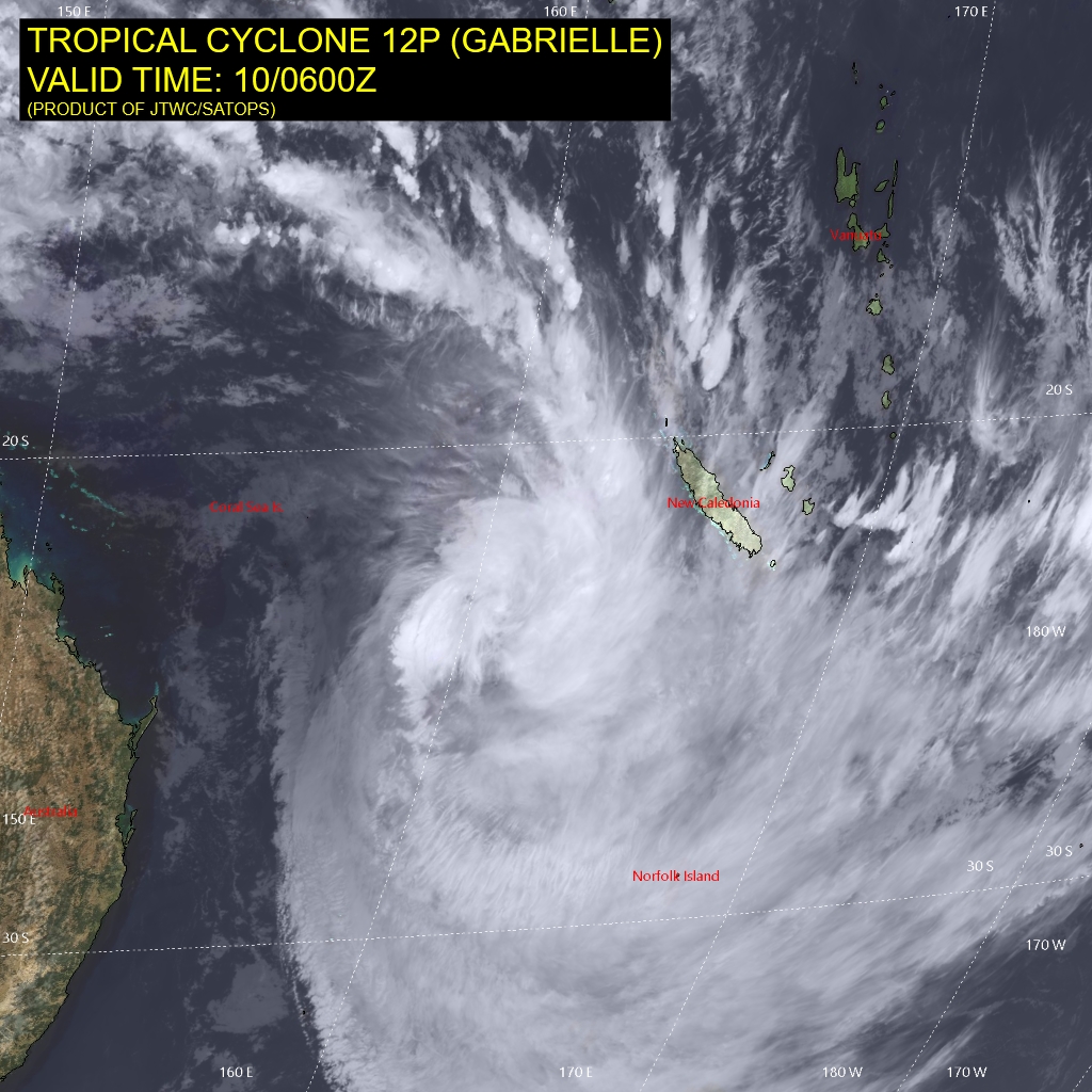 SATELLITE ANALYSIS, INITIAL POSITION AND INTENSITY DISCUSSION: AGAINST ALL ODDS AND IN THE FACE OF SHARPLY INCREASED NORTHWESTERLY SHEAR, ANIMATED MULTISPECTRAL SATELLITE IMAGERY (MSI), A SERIES OF RECENT MICROWAVE IMAGERY AND RECENT SCATTEROMETER AND SMAP PASSES, INDICATE THAT TC 12P (GABRIELLE) HAS INTENSIFIED. HOWEVER, THE PEAK HAS PROBABLY BEEN REACHED AND THE SYSTEM NOW FACES A RAPID TRANSITION TO A SUBTROPICAL LOW. THE MSI AND ENHANCED INFRARED (EIR) IMAGERY INDICATES THE SYSTEM REMAINS DEVOID OF A DISTINCT EYE FEATURE, EVEN NOW AT ITS PEAK. HOWEVER, MICROWAVE IMAGERY THROUGH THE DAY HAS SHOWN CONSISTENT LOW-LEVEL EYE FEATURES, WITH THE SMALLEST, BEST DEFINED MICROWAVE EYE IN THE MOST RECENT 100527Z SSMIS 37GHZ IMAGE. THE STRONGEST CONVECTION REMAINS DOWNSHEAR, IN THE SOUTHEASTERN QUADRANT, BUT THE EYEWALL REMAINS FIRM ON THE NORTHWEST SIDE, FOR NOW. THE INITIAL INTENSITY HAS BEEN INCREASED TO 90 KNOTS, WHICH IS ABOVE ALL THE OBJECTIVE ESTIMATES BUT IN LINE WITH THE SUBJECTIVE ESTIMATES. THE ADT IS T5.3 (97 KTS), THE AIDT IS 87 KTS AND THE SATCON IS 96 KTS AND A 100331Z AMSR2 WINDSPEED ESTIMATE MEASURED 91 KTS IN THE SOUTHEAST QUADRANT, WHICH COMBINED LENDS HIGH CONFIDENCE TO THE INITIAL INTENSITY. THE SYSTEM IS MOVING INTO AN INCREASINGLY MARGINAL ENVIRONMENT, WITH SHEAR NOW AT OR ABOVE 30 KTS, THOUGH IT IS IN PHASE WITH THE STORM MOTION, HENCE HOW THE SYSTEM HAS BEEN ABLE TO CONTINUE TO INTENSIFY. TC 12P IS IN THE PROCESS OF CROSSING THE 26C ISOTHERM AND WATER VAPOR IMAGERY SHOWS A VERY SHARP UPPER-LEVEL TROUGH, WITH VERY DRY AIR TRAILING THE TROUGH AXIS, JUST TO THE WEST. THE SYSTEM IS ALREADY STARTING THE VERY EARLY STAGES OF SUBTROPICAL TRANSITION AS IT RACES OFF TO THE SOUTHEAST ALONG THE STRENGTHENING GRADIENT BETWEEN THE SUBTROPICAL RIDGE (STR) TO THE EAST AND THE TROUGH TO THE WEST.