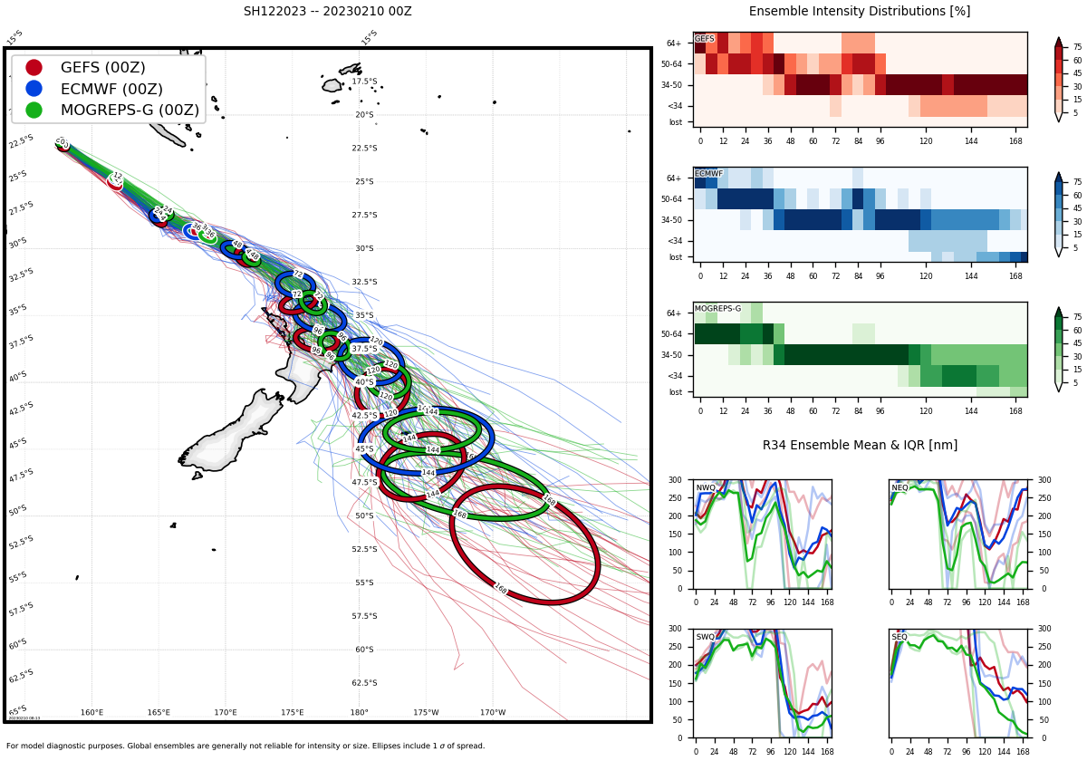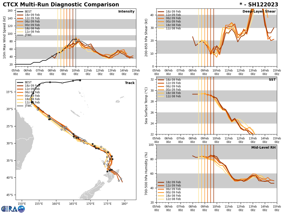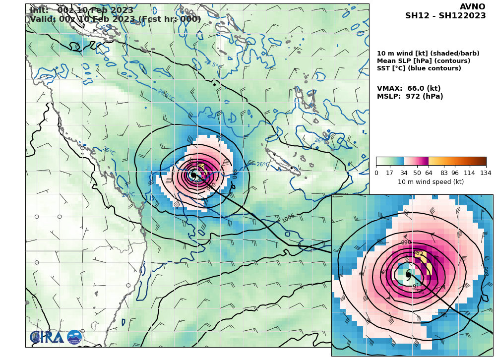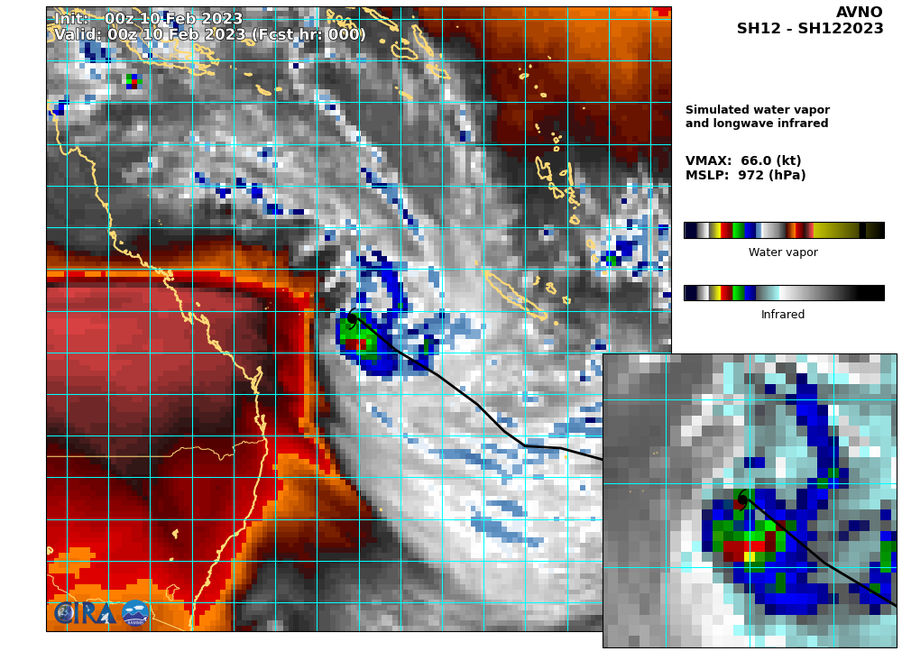 FORECAST REASONING. SIGNIFICANT FORECAST CHANGES: THERE ARE NO SIGNIFICANT CHANGES TO THE FORECAST FROM THE PREVIOUS WARNING. FORECAST DISCUSSION: HAVING REACHED ITS PEAK AT THE PRESENT ANALYSIS TIME, TC 12P WILL NOW RAPIDLY WEAKEN AND UNDERGO SUBTROPICAL TRANSITION (STT). THE SYSTEM WILL CONTINUE TO VERY RAPIDLY MOVE SOUTHEASTWARD ALONG THE TIGHT GRADIENT BETWEEN THE STR TO THE EAST AND THE TROUGH NOW ENCROACHING FROM THE WEST. TRACK SPEEDS ARE ANTICIPATED TO INCREASE FURTHER THROUGH TAU 12 BUT WILL THEN BEGIN TO SLOW AND TURN A BIT MORE EAST-SOUTHEASTWARD THROUGH THE END OF THE FORECAST AS THE SYSTEM MOVES UNDER THE UPPER-LEVEL TROUGH AND INTO A REDUCED STEERING GRADIENT. THE SYSTEM WILL CROSS THE 26C ISOTHERM IN THE NEXT FEW HOURS AND MOVE INTO STEADILY COOLER WATERS, ROBBING IT OF THE ENERGY SOURCE IT HAS ENJOYED THE PAST FEW DAYS. AT THE SAME TIME, THE TROUGH, WHICH HAS AN AXIS SITTING AT ABOUT 156E WILL RAPIDLY MOVE IN, BRINGING INCREASED SHEAR AND A WEDGE OF VERY DRY AIR OVER TOP OF THE SYSTEM, EFFECTIVELY DECAPITATING IT WITHIN THE NEXT 24 HOURS. THE COMBINATION OF THESE EFFECTS WILL LEAD TO RAPID WEAKENING, PARTICULARLY IN THE FIRST 24 HOURS. THE SYSTEM IS ALREADY STARTING THE VERY EARLY PHASES OF STT, AND TRANSITION TO A STORM-FORCE SUBTROPICAL LOW IS EXPECTED NO LATER THAN TAU 36 AND POTENTIALLY AS EARLY AS TAU 24. AFTER STT, THE SYSTEM WILL CONTINUE TO TRACK TOWARDS THE NORTH ISLAND OF NEW ZEALAND AND SOME MODELS SUGGEST SOME POTENTIAL FOR REINTENSIFICATION AS IT APPROACHES.