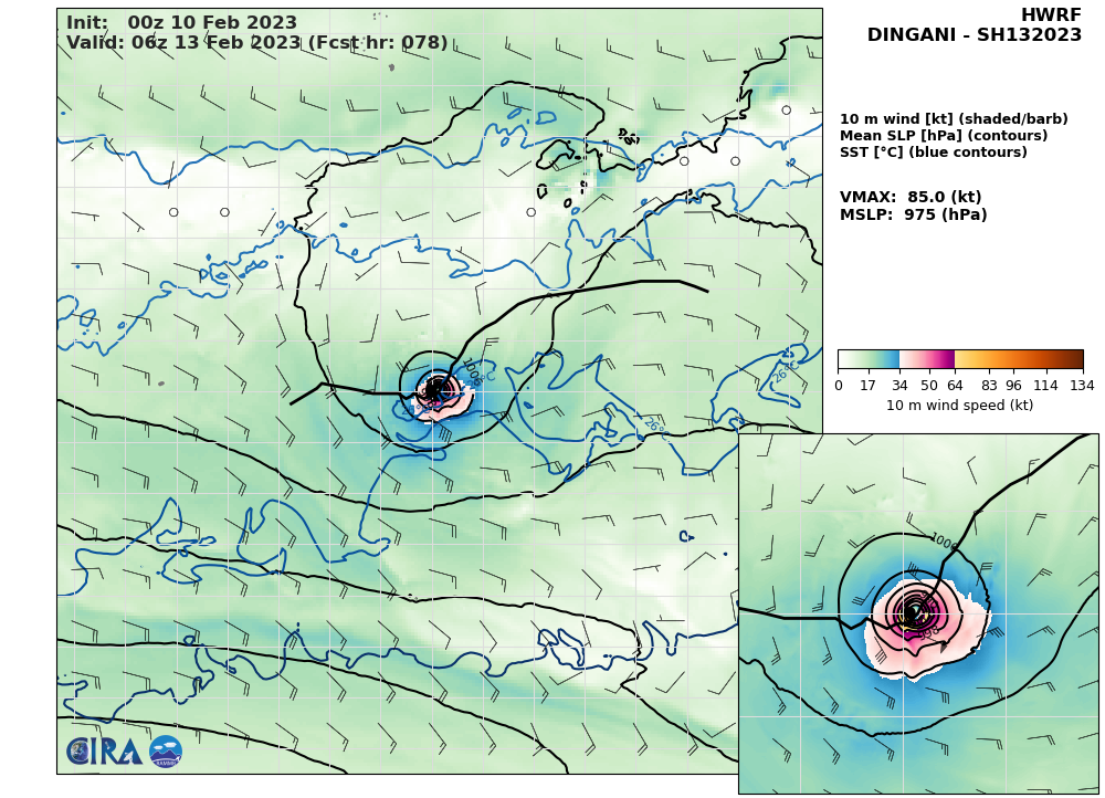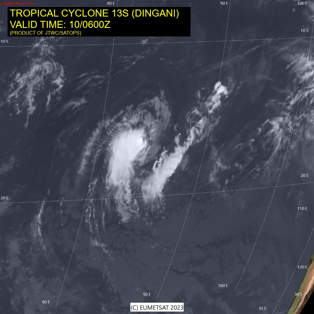 SATELLITE ANALYSIS, INITIAL POSITION AND INTENSITY DISCUSSION: ANIMATED MULTISPECTRAL SATELLITE IMAGERY (MSI) DEPICTS A VERY COMPACT SYSTEM WITH A PARTIALLY EXPOSED LOW LEVEL CIRCULATION CENTER (LLCC) DISPLACED TO THE EAST OF A SMALL REGION OF FLARING CONVECTION. TC 13S (DINGANI) CONTINUES TO STRUGGLE AGAINST PERSISTENT EASTERLY SHEAR BUT HAS BEEN ABLE TO STEADILY INTENSIFY OVER THE PAST 12 HOURS. UNFORTUNATELY, THERE HAS NOT BEEN ANY GOOD MICROWAVE PASSES IN OVER 12 HOURS, AND THE SYSTEM IS CROSSING THROUGH A REGION ON THE LIMBS OF BOTH HIMAWARI AND METEOSAT GEOSTATIONARY IMAGERY, AND THUS THE INITIAL POSITION IS ASSESSED WITH MEDIUM CONFIDENCE, USING AN EXTRAPOLATION OF AN 100324Z ASCAT-B SCATTEROMETER PASS. THE INITIAL INTENSITY IS ASSESSED WITH HIGH CONFIDENCE BASED ON THE T3.0 (45 KTS) CURRENT INTENSITY ESTIMATES FROM PGTW AND DEMS, THE WIND FIELD EVIDENT IN THE PREVIOUSLY MENTIONED ASCAT PASS AND THE CURRENT SATCON ESTIMATE. SHEAR REMAINS IN THE LOW TO MODERATE RANGE (15-20 KTS) BUT HAS STARTED TO COME DOWN SINCE THE PREVIOUS FORECAST. THE ENVIRONMENT IS ASSESSED AS MARGINALLY FAVORABLE, WITH THE SHEAR BEING OFFSET BY GOOD AND IMPROVING POLEWARD OUTFLOW AND WARM SSTS.