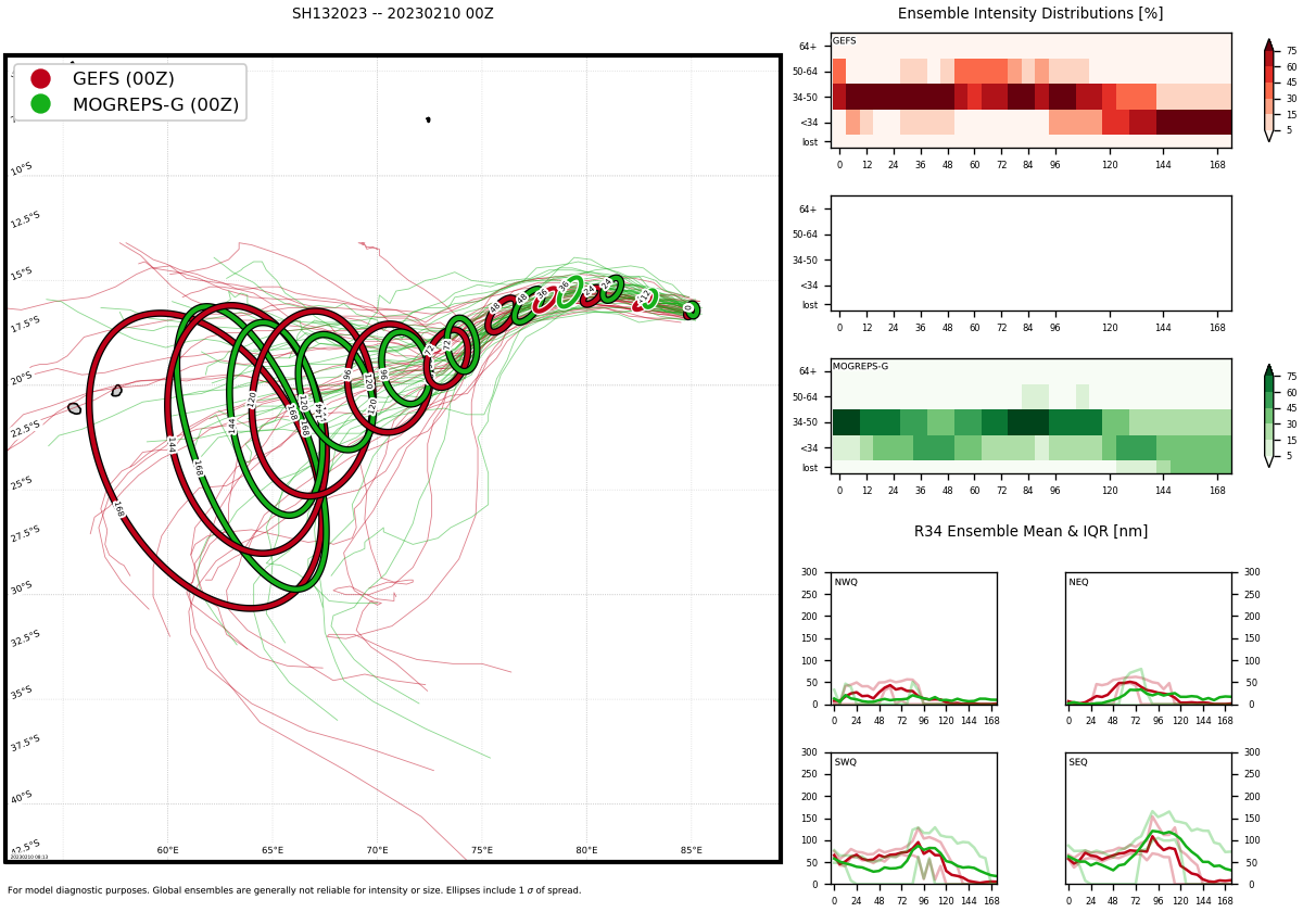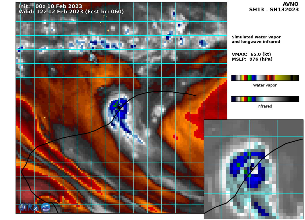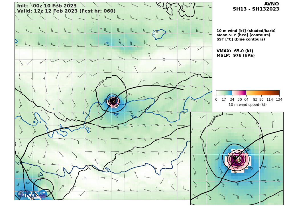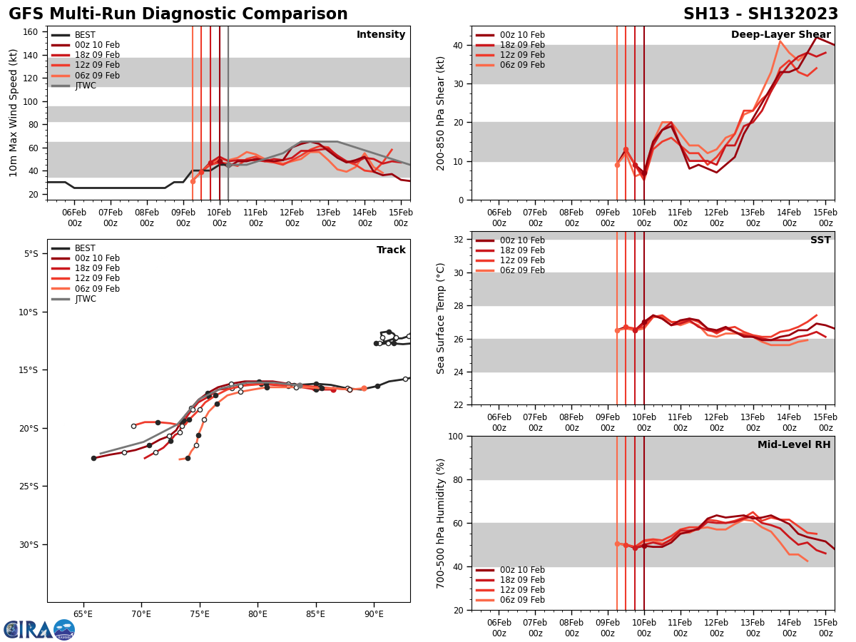FORECAST REASONING. SIGNIFICANT FORECAST CHANGES: THERE ARE NO SIGNIFICANT CHANGES TO THE FORECAST FROM THE PREVIOUS WARNING. FORECAST DISCUSSION: THROUGH THE FIRST 36 HOURS OF THE FORECAST, TC 13S IS FORECAST TO TRACK GENERALLY WESTWARD ALONG THE NORTHERN PERIPHERY OF THE DEEP STR TO THE SOUTH. BY TAU 48, AN UPPER-LEVEL TROUGH MOVING IN FROM THE WEST WILL BREAK DOWN THE RIDGE AND PUSH THE CENTER TO THE EAST, RESULTING IN A MORE NORTH-SOUTH ORIENTED AXIS. TC 13S WILL TAKE A SHARP TURN SOUTHWESTWARD ALONG THE NEWLY REORIENTED RIDGE AXIS. A NEWLY FORMED STR WILL MOVE IN TO THE SOUTH BY TAU 96, AND THE FORECAST TRACK FLATTENS SOMEWHAT THROUGH THE REMAINDER OF THE FORECAST. SHEAR HAS ALREADY STARTED TO SLACKEN A BIT BASED ON THE LATEST CIMSS ANALYSIS, SUPPORTED BY THE REFORMATION OF A SMALL CENTRAL DENSE OVERCAST (CDO) OVER THE LLCC. HOWEVER, IT WILL LIKELY TAKE A BIT OF TIME FOR THE INTENSITY TO INCREASE SIGNIFICANTLY, THUS THE FORECAST CALLS FOR A FLAT INTENSITY TREND FOR THE FIRST 12 HOURS. BY TAU 24, SHEAR IS EXPECTED TO RELAX FURTHER, AND THE SYSTEM SHOULD START TO INTENSIFY MORE QUICKLY, REACHING A PEAK OF 65 KNOTS BY TAU 48. INCREASED NORTHWESTERLY SHEAR AHEAD OF THE DEEP TROUGH MOVING IN FROM THE WEST, AN INFLUX OF DRY MID-LEVEL AIR, AND REDUCED SSTS (NEAR 26C) WILL USHER IN A WEAKENING TREND FORM TAU 72 ONWARD.
