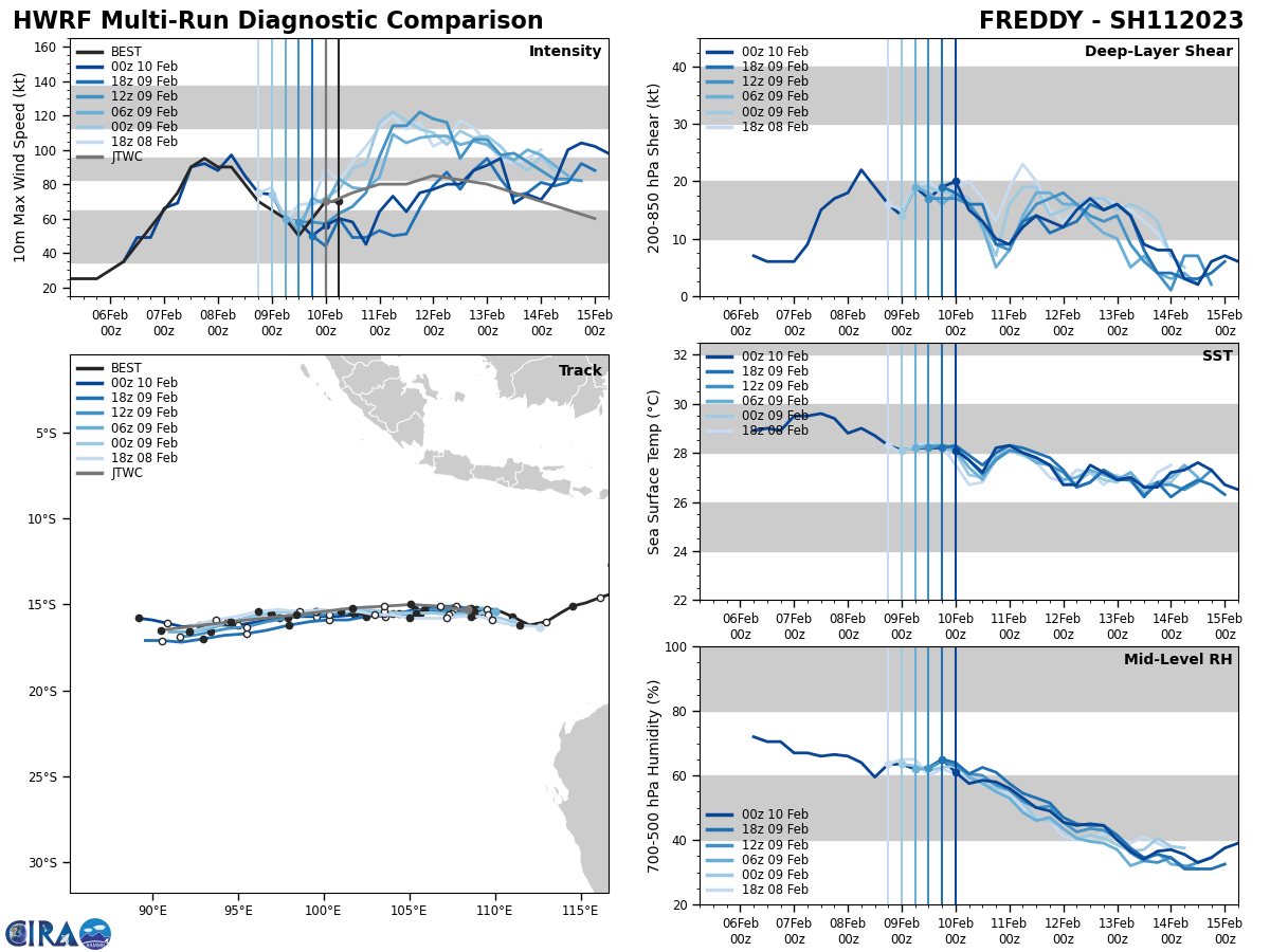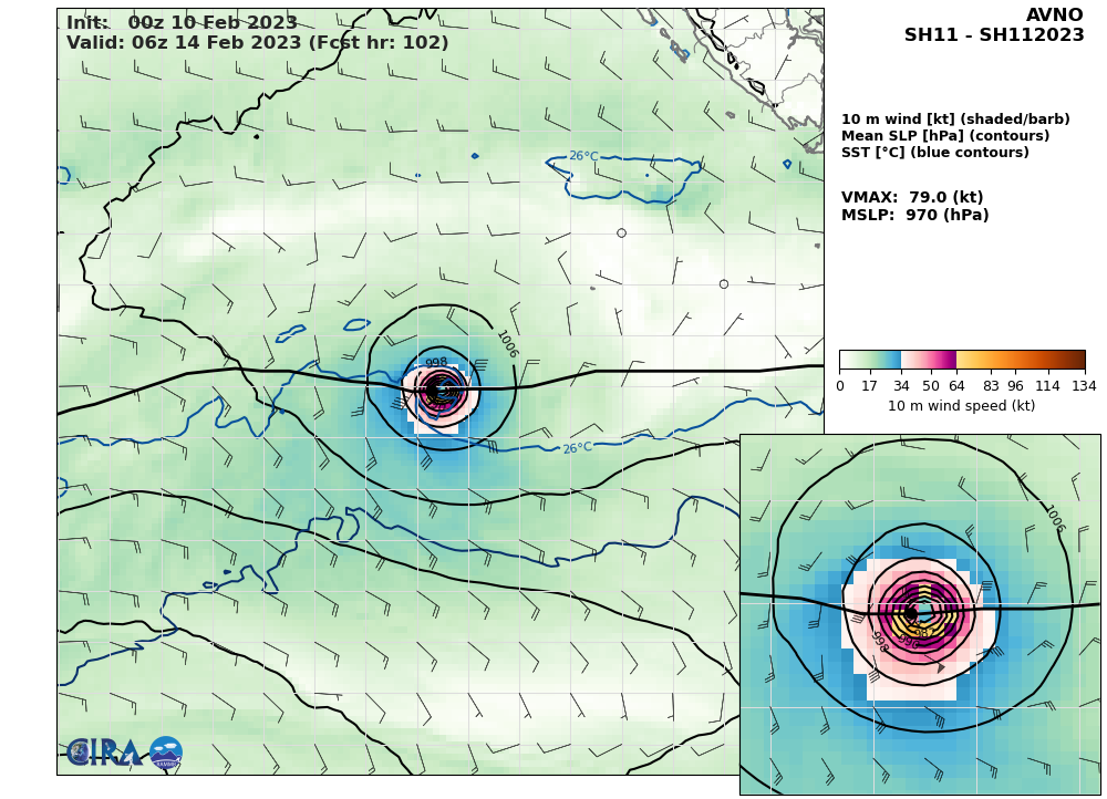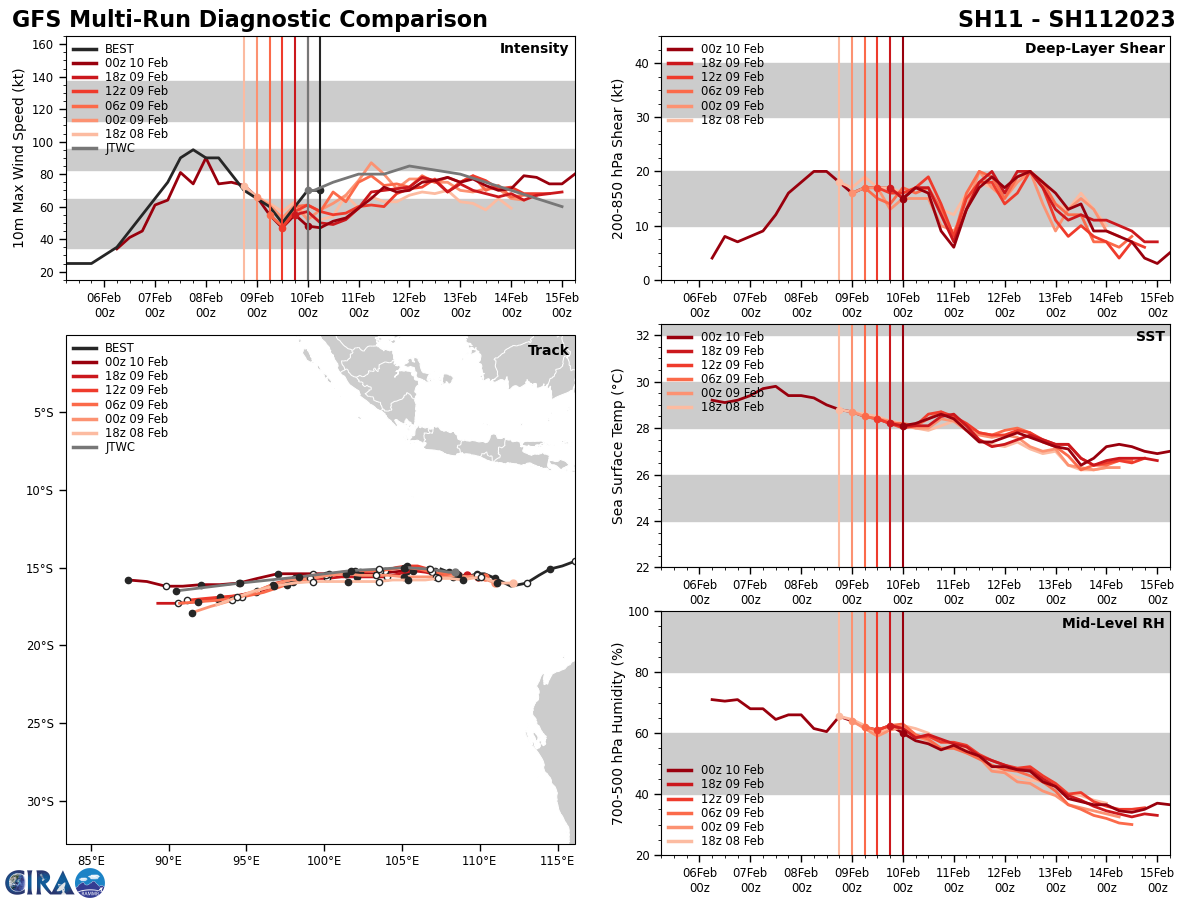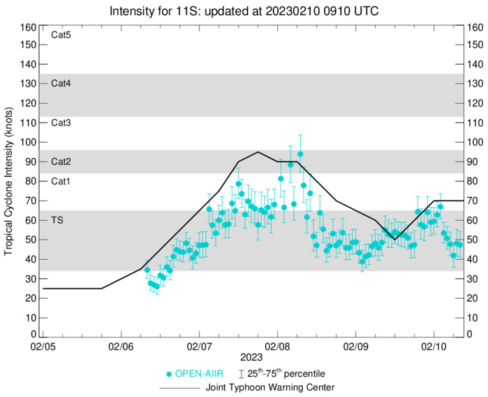 FORECAST REASONING. SIGNIFICANT FORECAST CHANGES: THERE ARE NO SIGNIFICANT CHANGES TO THE FORECAST FROM THE PREVIOUS WARNING. FORECAST DISCUSSION: OVER THE PAST 12 HOURS TROPICAL CYCLONE 11S HAS TRACKED GENERALLY WEST-NORTHWESTWARD AT 8 KNOTS. OVER THE NEXT 12 HOURS 11S IS FORECAST TO ACCELERATE NORTHWESTWARD AS THE SYSTEM TRANSITS ALONG THE NORTHWEST PERIPHERY OF THE DEEP-LAYER SUBTROPICAL RIDGE (STR) TO THE SOUTH. THE SYSTEM WILL CONTINUE TO TRANSIT NORTHWESTWARD QUICKLY THROUGH TAU 48, DUE TO THE SYSTEM'S POSITION WITHIN THE STR. AFTER WHICH, TC 11S WILL REACH A POINT NEAR 15S BEFORE TURNING AND TRACKING IN A WEST-SOUTHWESTWARD DIRECTION THROUGH THE REMAINDER OF THE FORECAST. TC 11S WILL STEADILY INTENSIFY OVER THE NEXT 48 HOURS AS DETERMINISTIC MODELS AGREE THAT VERTICAL WIND SHEAR (VWS) IS EXPECTED TO DECREASE. THIS WILL ALLOW THE SYSTEM TO ULTIMATELY ACHIEVE A PEAK INTENSITY OF 85 KNOTS BY TAU 48. AFTER TAU 48, SHEAR LOOKS TO PICK UP AGAIN AS THE SYSTEM MOVES INTO RELATIVELY COOLER (26-27C) WATERS AND UPPER-LEVEL FLOW BECOMES INCREASINGLY CONVERGENT, LEADING TO SLOW BUT STEADY WEAKENING THROUGH THE REMAINDER OF THE FORECAST PERIOD.