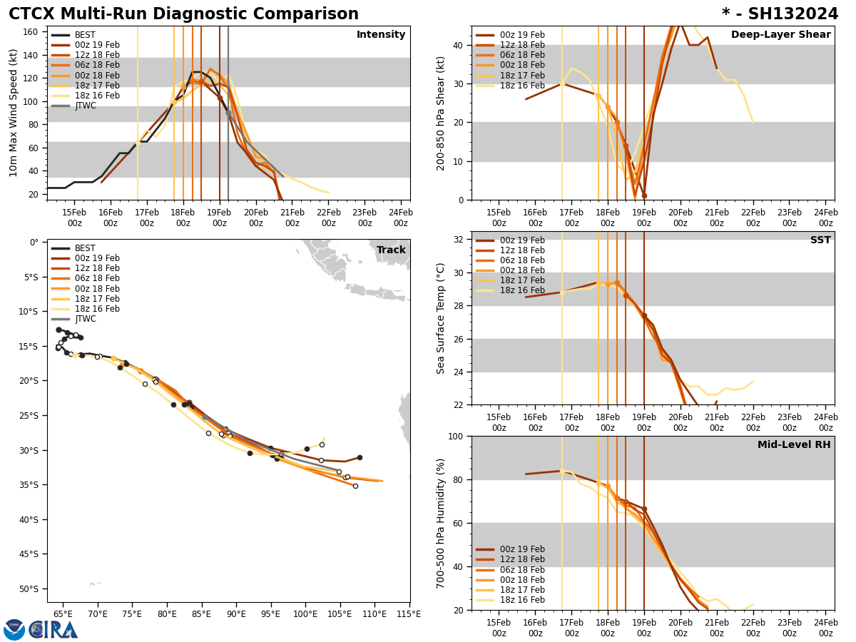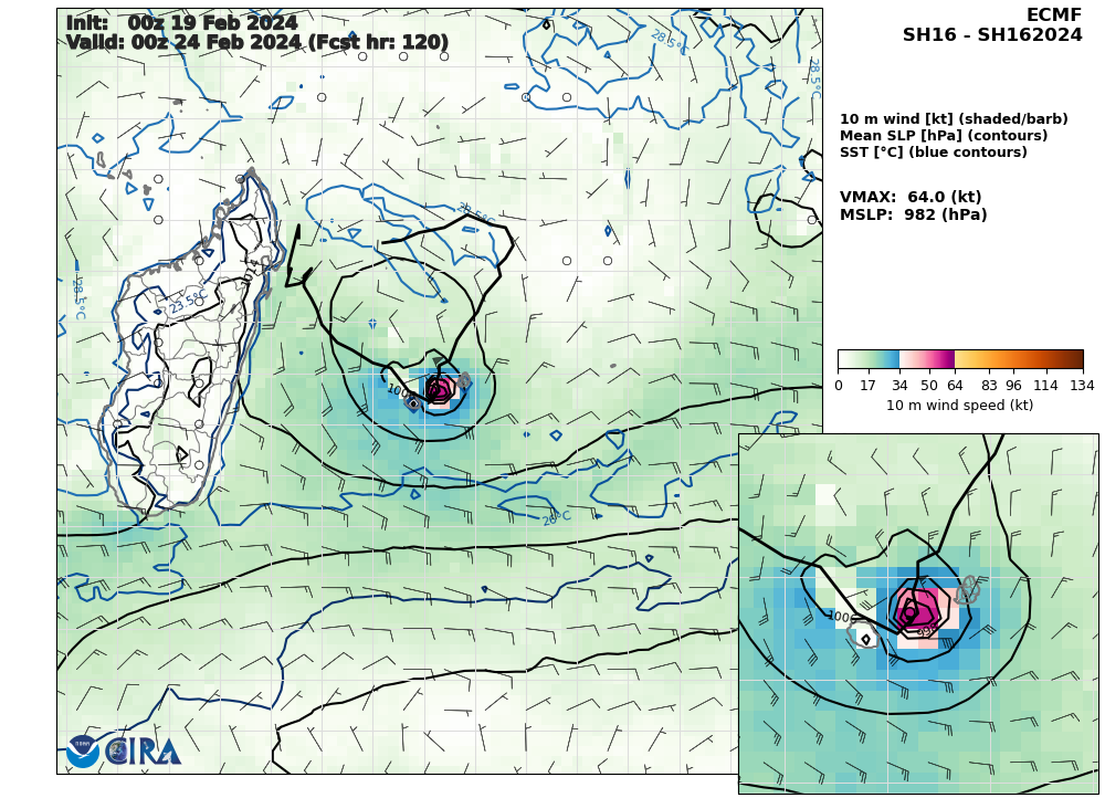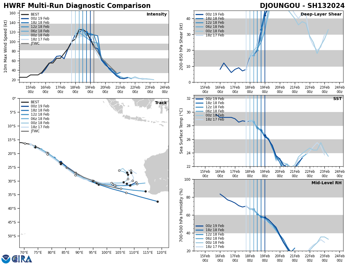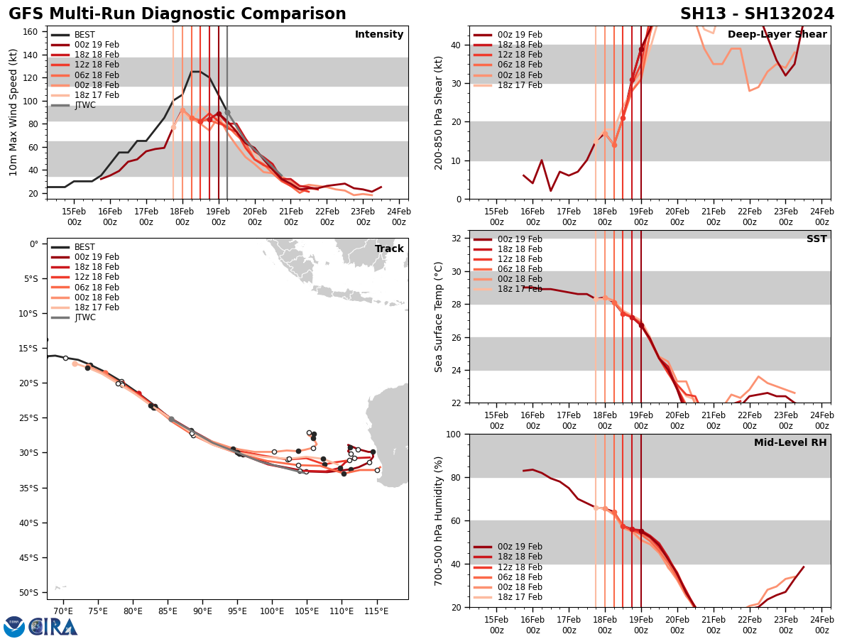 MODEL DISCUSSION: DETERMINISTIC TRACK GUIDANCE SHOWS A WIDE SPREAD IN POTENTIAL TRACK SOLUTIONS, PARTICULARLY AFTER TAU 36 WHEN THE SYSTEM BEGINS TO TURN SOUTHWARD. ACROSS THE CONSENSUS MEMBERS, THE TRIO OF THE UKMET BASED MODELS INCLUDING UKMET ENSEMBLE, EGRR AND THE GALWEM ALL DISPLAY THE SAME GENERAL TRACK TYPE AS THE REST OF THE GUIDANCE BUT TRACK THE SYSTEM EAST OF PORT MATHURIN. THIS SERVES TO PULL THE CONSENSUS MEAN SIGNIFICANTLY TOO FAR TO THE EAST. THE REMAINDER OF THE GUIDANCE PACKAGE LIES IN A MORE TIGHTLY-PACKED ENVELOPE THAT GRADUALLY EXPANDS FROM 100NM AT TAU 48 TO 320NM BY TAU 120, WITH ALL THE MEMBERS CONFINED TO THE WEST OF THE CONSENSUS MEAN. A MANUAL RUN OF A NEW CONSENSUS WHICH DISCARDS THE OUTLIERS ABOVE GENERATES A MORE REALISTIC SCENARIO, WITH THE TRACK PASSING JUST EAST OF MAURITIUS. THE JTWC FORECAST CLOSELY TRACKS THIS MANUAL CONSENSUS MEAN AND THE ECMWF TRACKER. CONFIDENCE IS LOW HOWEVER, PARTICULARLY AFTER TAU 48 DUE TO VERY LARGE MODEL SPREAD. BOTH THE GEFS AND ECENS ENSEMBLES ALSO SHOW A HIGH AMOUNT OF SPREAD, LENDING EVEN MORE UNCERTAINTY IN THE FORECAST. INTENSITY GUIDANCE IS MIXED AS WELL, WITH THE GLOBAL-MODEL-BASED SHIPS GUIDANCE, THE COAMPS-TC (NAVGEM) AND THE HWRF MODELS SHOWING FAR MORE EXCITEMENT THAN THE OTHER MESOSCALE MODELS SUCH AS HAFS-A AND THE GFS-BASED COAMPS-TC. THE LATTER MODELS ONLY SHOW MODEST INTENSIFICATION TO A PEAK BETWEEN 50-65 KNOTS, WHILE THE FIRST MODELS SHOW A PEAK CLOSER TO 95 KNOTS. ALL AGREE THAT THE PEAK WILL BE AT TAU 72, FOLLOWED BY A STEADY WEAKENING THROUGH TAU 120. THE JTWC FORECAST GENERALLY FOLLOWS ABOUT 5 KNOTS LOWER THAN THE SHIPS GUIDANCE AND SIGNIFICANTLY LOWER THAN THE RAPID INTENSIFICATION AIDS WHICH ARE TRIGGERING WITH THIS MODEL RUN. CONFIDENCE IS LOW THROUGH THE FORECAST PERIOD.