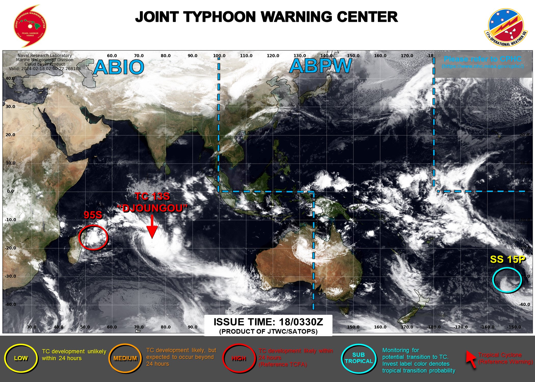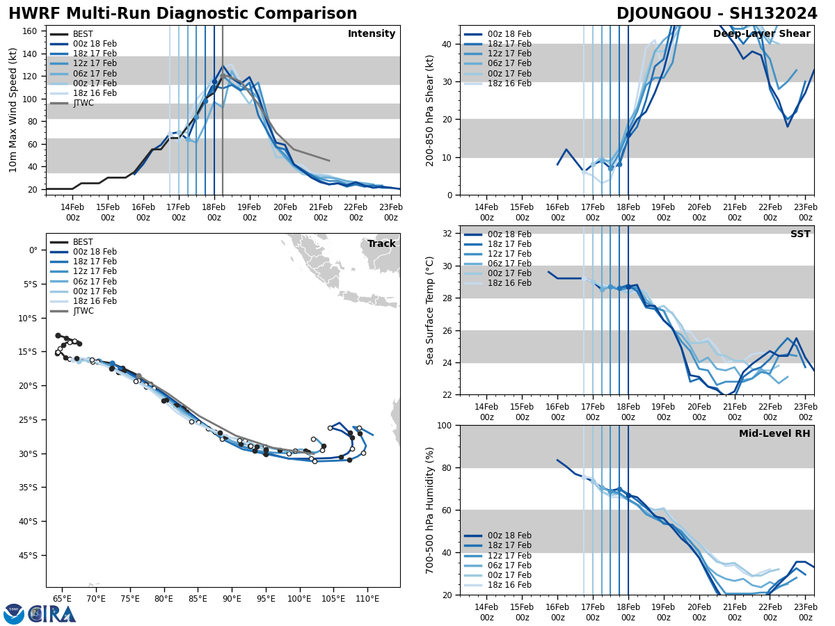 SATELLITE ANALYSIS, INITIAL POSITION AND INTENSITY DISCUSSION: ANIMATED MULTISPECTRAL SATELLITE IMAGERY (MSI) DEPICTS TROPICAL CYCLONE (TC) 13S (DJOUNGOU) EXHIBITING A TIGHTENING SYMMETRIC EYE OF 20NM DIAMETER AND SMOOTH CIRRUS CANOPY ALOFT (168NM DIAMETER). ROBUST SPIRAL BANDING PERSISTS THROUGHOUT THE EASTERN PERIPHERY OF THE SYSTEM WITH INTERMITTENT OVERSHOOTING CLOUD TOPS THROUGHOUT. A 180406Z MHS 89GHZ SATELLITE MICROWAVE IMAGE CAPTURED A SLIGHT OFFSET OF THE LOW LEVEL CIRCULATION CENTER (LLCC) AND UPPER LEVEL EYE FEATURE, SHOWING THE EYE FEATURE TO BE 30NM EAST OF THE LLCC AND SUGGESTING AN EASTWARD TILTING VORTEX WITH HEIGHT. THE ENVIRONMENT IS ASSESSED AS HIGHLY FAVORABLE HAVING SIGNIFICANT DIVERGENCE ALOFT, WARM (29-30C) SEAS SURFACE TEMPERATURES (SST) OFFSET BY MODERATE (15- 20KTS) VERTICAL WIND SHEAR (VWS). THE INITIAL POSITION IS PLACED WITH HIGH CONFIDENCE BASED ON THE SYMMETRIC EYE FEATURE OBSERVED IN A GOES-IO VISIBLE SATELLITE IMAGE. THE INITIAL INTENSITY OF 120 KTS IS ASSESSED WITH MEDIUM CONFIDENCE BASED ON THE SUBJECTIVE AND OBJECTIVE INTENSITY ESTIMATES LISTED BELOW.
