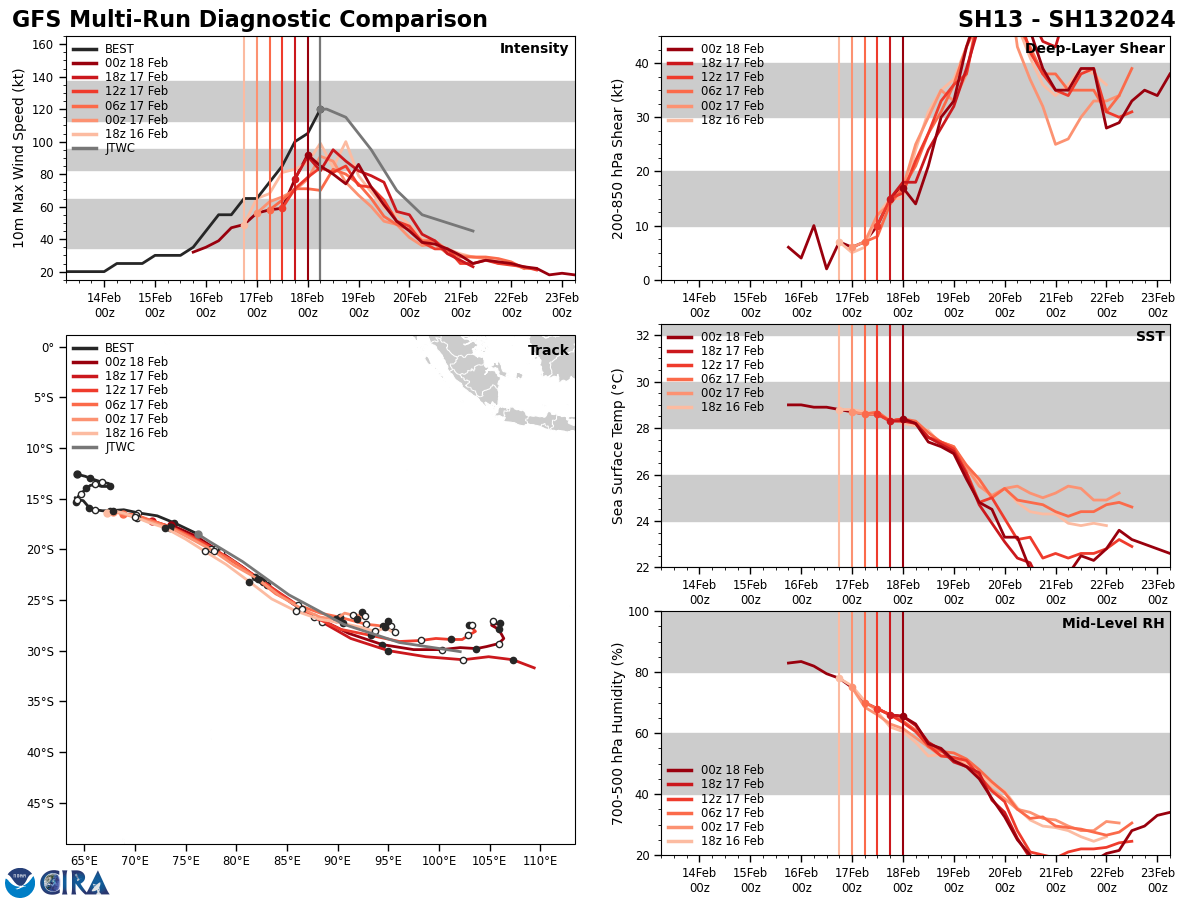 FORECAST REASONING. SIGNIFICANT FORECAST CHANGES: THERE ARE NO SIGNIFICANT CHANGES TO THE FORECAST FROM THE PREVIOUS WARNING. FORECAST DISCUSSION: TC 13S IS FORECAST TO TRACK ALONG THE SOUTHWESTERN PERIPHERY OF THE NEAR EQUATORIAL RIDGE TO THE NORTHEAST OF THE SYSTEM THROUGHOUT THE FORECAST PERIOD, STEERING THE SYSTEM SOUTHEASTWARD THROUGH TAU 48 AND THEN GRADUALLY TURNING TO AN EASTWARD TRACK BY TAU 72. IN GENERAL, THE FAVORABLE ENVIRONMENT BEGINS TO GRADUALLY BECOME UNFAVORABLE, STARTING WITH A RISE IN VWS (25-30KTS BY TAU 12). SST IS ANTICIPATED TO STEADILY DROP FROM 30C (TAU 00) TO 22C (TAU 72). UPPER LEVEL DIVERGENCE IS FORECAST TO SHARPLY CUT OFF BETWEEN TAU 36 AND TAU 48, ATTRIBUTED TO SIGNIFICANT DRY AIR ENTRAINMENT STARTING NEAR TAU 24. IN SUCH, A RAPID WEAKENING TREND IS FORECAST FROM TAU 12 TO TAU 72. THE SYSTEM IS FORECAST TO BEGIN SUBTROPICAL TRANSITION NEAR TAU 48 AND BE SUBTROPICAL BY TAU 72.