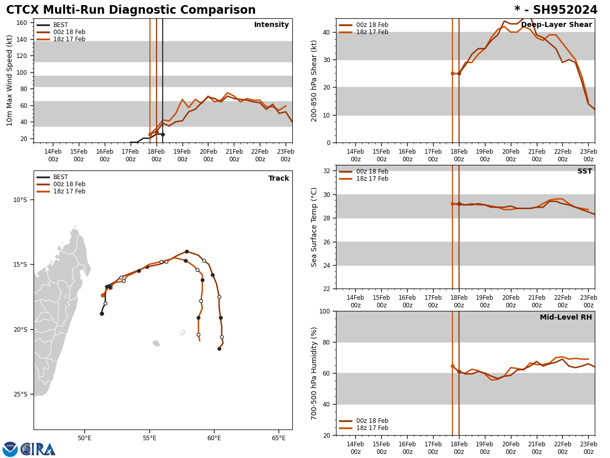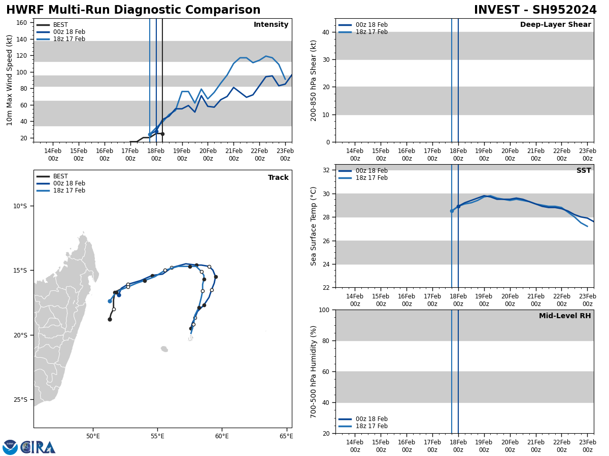 THE AREA OF CONVECTION (INVEST 95S) PREVIOUSLY LOCATED NEAR 17.9S 51.8E IS NOW LOCATED NEAR 16.7S 51.7E, APPROXIMATELY 397 NM WEST-NORTHWEST OF MAURITIUS. INVEST 95S WILL NOT STOP UNTIL IT GETS ENOUGH, SHOWING GREAT STRUCTURAL IMPROVEMENT AS IT HAS RAPIDLY CONSOLIDATED OVER THE PAST SIX HOURS. ANIMATED ENHANCED INFRARED (EIR) SATELLITE IMAGERY AND AN 180019Z SSMIS 91GHZ MICROWAVE IMAGE DEPICT A LOW LEVEL CIRCULATION (LLC) WITH DEEP FLARING CONVECTION CONCENTRATED OVER AND NORTHEAST OF THE PERCEIVED LOW LEVEL CIRCULATION CENTER (LLCC) AND FRAGMENTED BANDING MAINLY ON THE SOUTHERN PERIPHERY OF THE SYSTEM. THE ENVIRONMENT IS HIGHLY FAVORABLE FOR FURTHER DEVELOPMENT WITH LOW (5-10KT) VWS, GOOD POLEWARD OUTFLOW ALOFT, AND WARM (29-30 C) SST. GLOBAL DETERMINISTIC AND ENSEMBLE MODELS ARE IN TIGHT AGREEMENT ON THE DEVELOPMENT OF INVEST 95S AND TRACKING IT NORTHEASTWARD OVER THE NEXT 24-36 HOURS, BUT HAVE DIFFERENCES WHEN IT COMES TO SPEED OF THE SYSTEM AS IT FLATTENS OUT ON AN EASTWARD TRAJECTORY. INTENSITY GUIDANCE SHOWS GOOD CONSENSUS ON INVEST 95S TRACKING OVER A PATCH OF 32C WATER WITHIN THE NEXT 12-24 HOURS, WHICH WILL FUEL RAPID AND STEADY INTENSIFICATION BEFORE MAKING A SOUTHWARD TURN TOWARDS THE MASCARENE ISLANDS. MAXIMUM SUSTAINED SURFACE WINDS ARE ESTIMATED AT 23 TO 28 KNOTS. MINIMUM SEA LEVEL PRESSURE IS ESTIMATED TO BE NEAR 1004 MB. THE POTENTIAL FOR THE DEVELOPMENT OF A SIGNIFICANT TROPICAL CYCLONE WITHIN THE NEXT 24 HOURS IS UPGRADED TO HIGH.