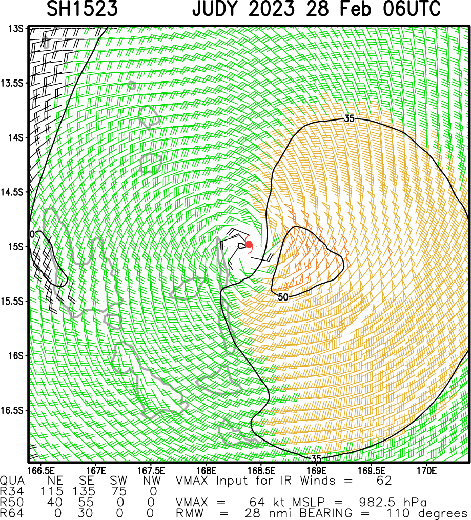 SATELLITE ANALYSIS, INITIAL POSITION AND INTENSITY DISCUSSION: ANIMATED MULTISPECTRAL SATELLITE IMAGERY (MSI) DEPICTS A FAIRLY SYMMETRICAL SYSTEM WITH THICK CONVECTIVE BANDS WRAPPING INTO AN ASSESSED LOW LEVEL CIRCULATION CENTER (LLCC). THE ABOVE MSI ALSO REVEALS HINTS OF AN EYE TRYING TO MAKE ITS PRESENCE KNOWN. ANALYSIS OF THE 280457Z SSMIS 91GHZ AND THE 280249Z ATMS 183GHZ IMAGES INDICATE A MICROWAVE EYE IS NOW TAKING SHAPE, FURTHER INDICATING THE SYSTEM IS INTENSIFYING AND BECOMING BETTER ORGANIZED. ENVIRONMENTAL ANALYSIS INDICATES TC JUDY TO BE IN FAVORABLE CONDITIONS FOR CONTINUAL TROPICAL DEVELOPMENT. THESE CONDITIONS ARE CHARACTERIZED BY CONSISTENT POLEWARD OUTFLOW ALOFT, LOW (5-10 KTS) VERTICAL WIND SHEAR (VWS), A STRONG 850 MB VORTICITY SIGNATURE, AND VERY WARM (30-31 C) SEA SURFACE TEMPERATURES (SST). THE INITIAL POSITION IS PLACED WITH HIGH CONFIDENCE BASED ON THE AFOREMENTIONED MSI, MICROWAVE IMAGERY AND SURFACE OBSERVATIONS FROM SOLA (VANUA LAVA) AND SARATMATA WHICH INDICATE AN ABRUPT CHANGE IN WIND DIRECTION FROM EASTWARD TO WESTWARD RESPECTIVELY OVER APPROXIMATELY A 65 NM SPAN. THE INITIAL INTENSITY OF 65 KTS IS ASSESSED WITH MEDIUM CONFIDENCE BASED ON PREVIOUS MULTI-AGENCY AND AUTOMATED DVORAK ESTIMATES.