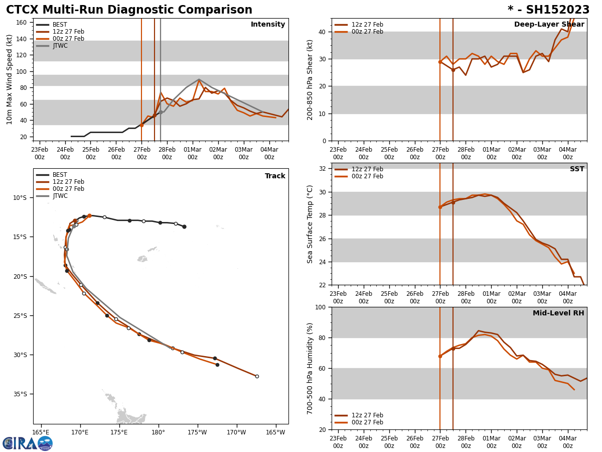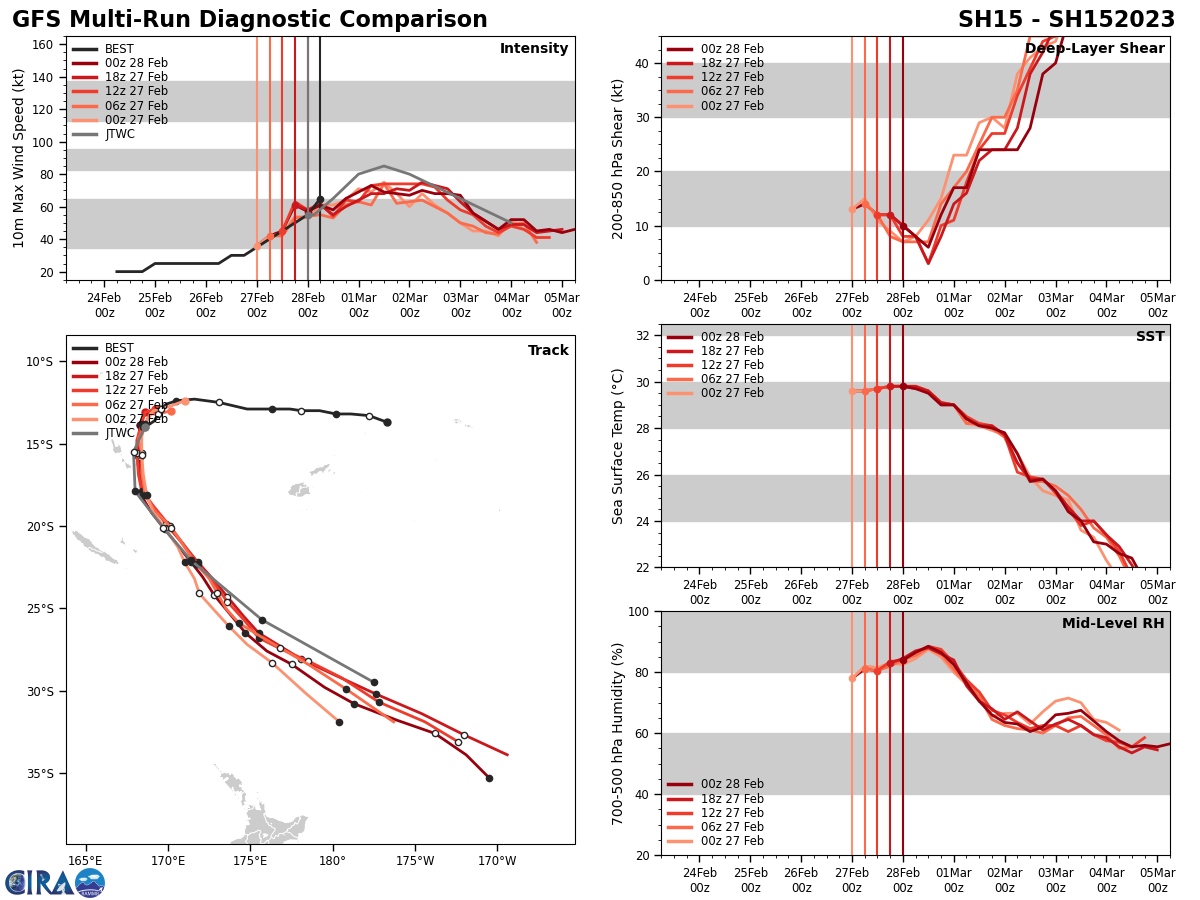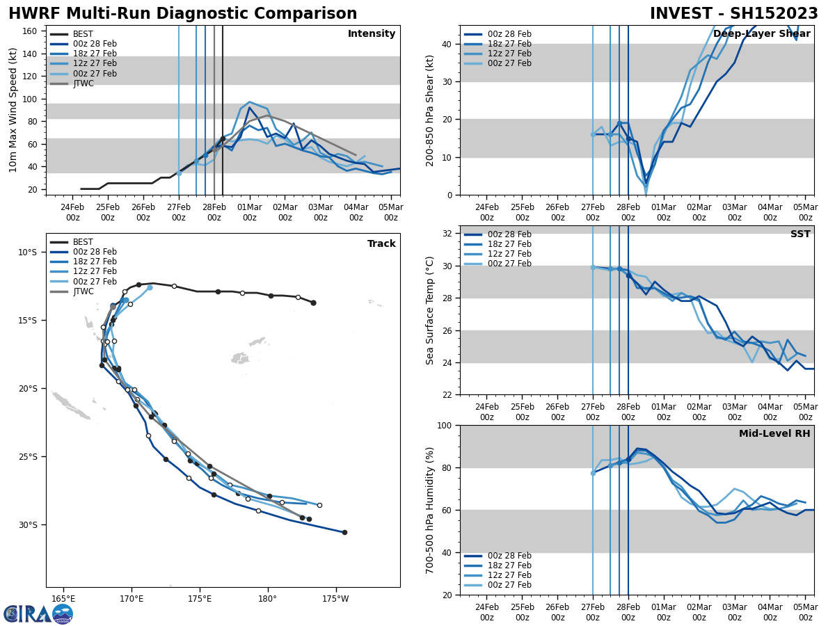 MODEL DISCUSSION: THE JTWC TRACK CONSENSUS MEMBERS ARE IN RELATIVELY GOOD AGREEMENT WITH A CONTINUAL SOUTHWARD TRACK, FOLLOWED BY A SOUTHEASTWARD TRACK. THE FORECAST MODEL ENVELOPE HAS A 95 NM SPREAD BY TAU 24 WHICH SLIGHTLY INCREASES TO 105 NM BY TAU 96. BECAUSE THIS THIS, THE JTWC FORECAST TRACK TO SET WITH HIGH CONFIDENCE. THE JTWC INTENSITY CONSENSUS MEMBERS ARE ALSO IN GOOD AGREEMENT SHOWING AN INCREASE IN INTENSITY UP TO TAUS 24 AND 36, THEN A GRADUAL DECREASE THROUGHOUT THE FORECAST PERIOD. RAPID INTENSIFICATION MODEL GUIDANCE DID TRIGGER, HOWEVER THE COAMPS-TC INTENSITY GUIDANCE DID NOT SHOW ANY INDICATIONS OF RI DURING THIS FORECAST PERIOD.
