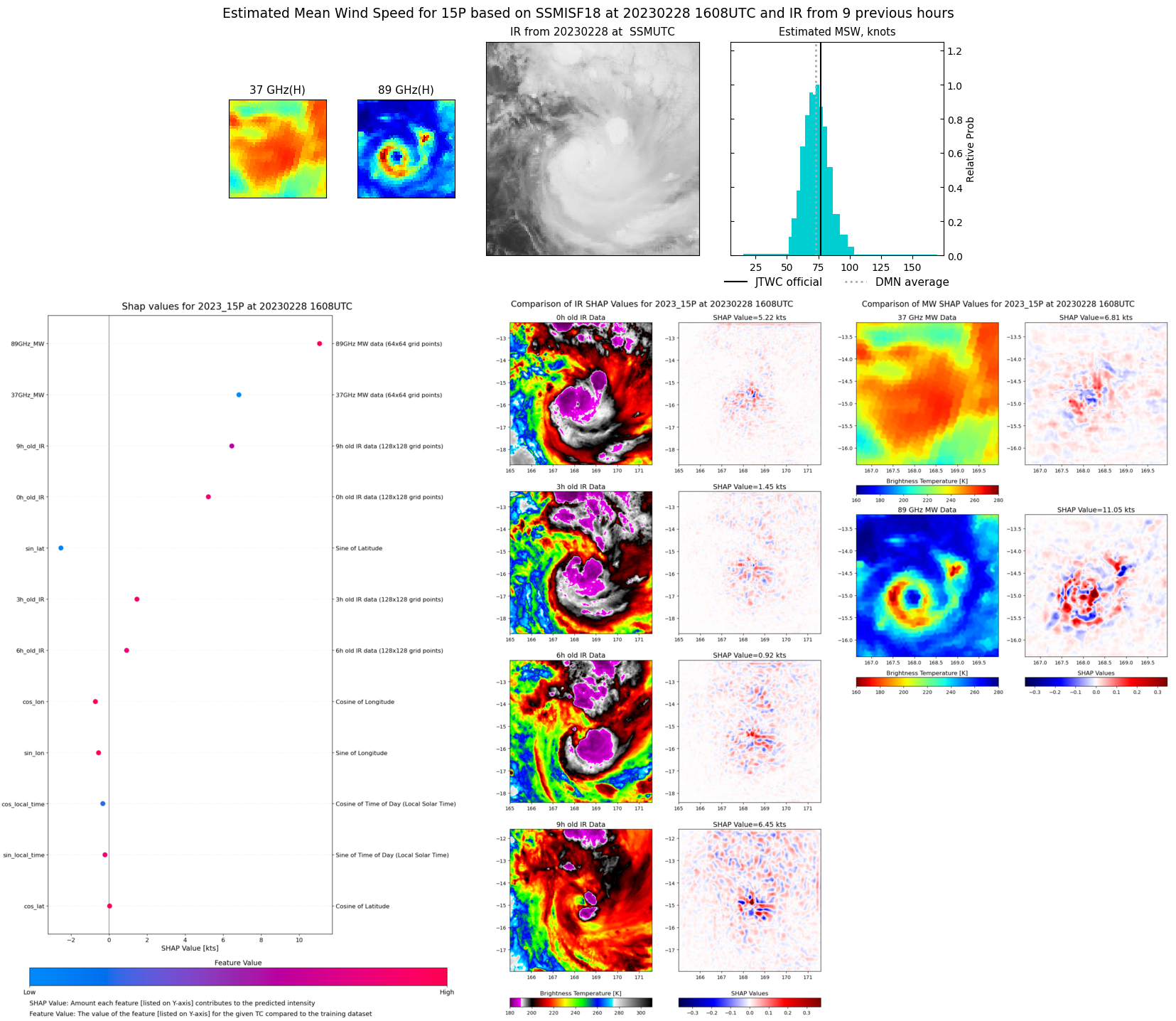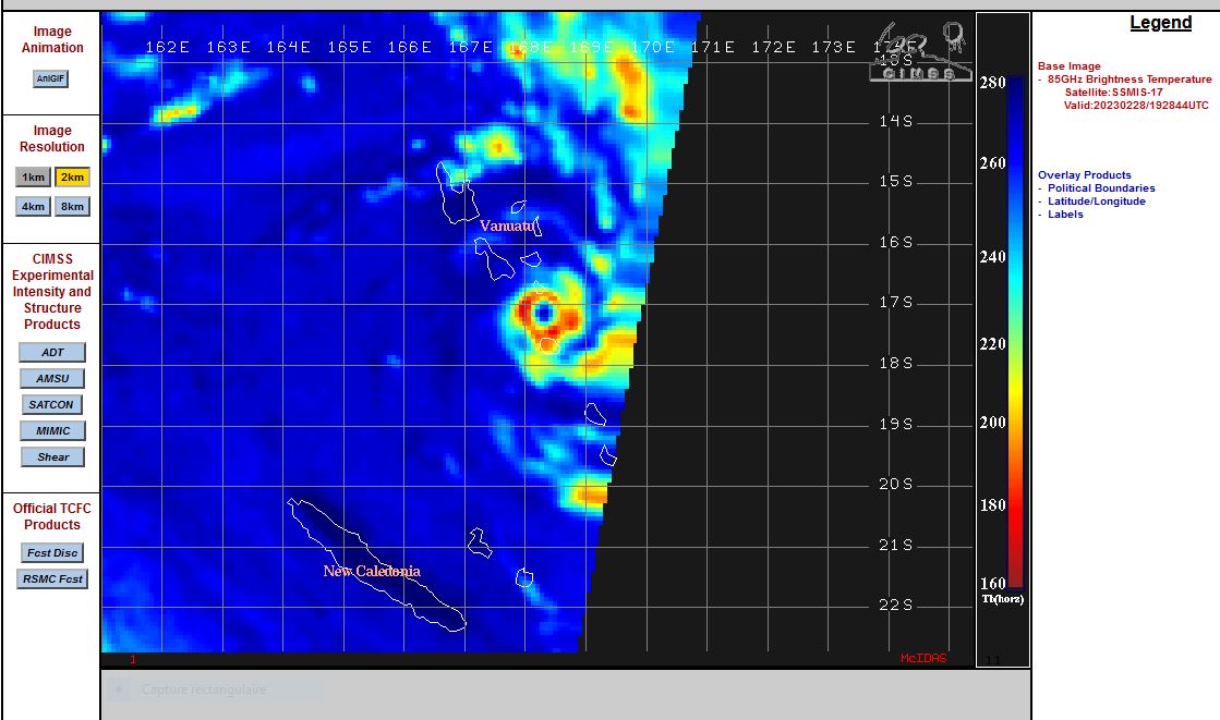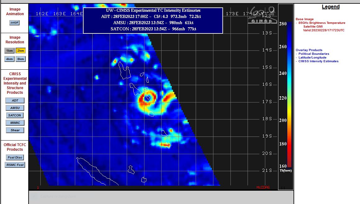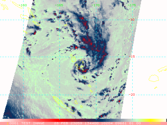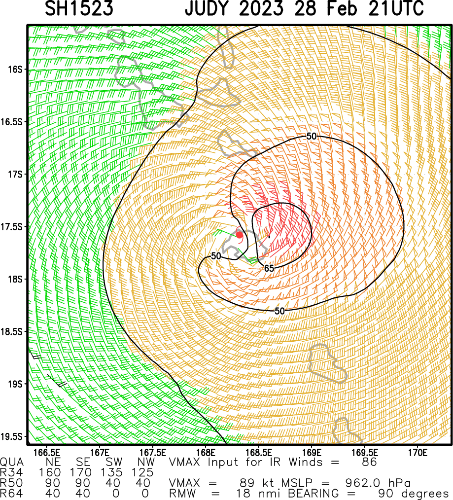 SATELLITE ANALYSIS, INITIAL POSITION AND INTENSITY DISCUSSION: TROPICAL CYCLONE 15P (JUDY) HAS RAPIDLY INTENSIFIED OVER THE PAST 24 HOURS, WITH INTENSITIES INCREASING FROM 50 KNOTS TO AT LEAST 85 KNOTS SINCE 1800Z YESTERDAY. ANIMATED ENHANCED INFRARED (EIR) SATELLITE IMAGERY INDICATES THIS TREND IS CONTINUING, WITH A RAGGED EYE TRYING TO ESTABLISH ITSELF OVER THE PAST COUPLE OF HOURS AS THE SYSTEM MOVED OVER THE ISLANDS OF EPI AND EMAE. IN THE EIR, A RAGGED EYE IS BEGINNING TO OPEN UP, BUT CLOUD TEMPERATURES IN THIS EYE-LIKE FEATURE REMAIN VERY COLD, WHILE CLOUD TOP TEMPERATURES IN THE SURROUNDING CONVECTIVE BANDS ARE AN EXTREMELY COLD -96C. WHILE THE EYE REMAINS RAGGED IN THE EIR, IN THE 281726Z GMI MICROWAVE IMAGERY THE EYE IS VERY WELL-DEFINED THROUGH THE COLUMN AND PROVIDED HIGH CONFIDENCE TO THE INITIAL POSITION. HOWEVER, BASED ON ANALYSIS OF THE 37GHZ AND 89GHZ IMAGES, THE PRESENCE OF SOME MODERATE WESTERLY MID-LEVEL SHEAR IS RESULTING IN ABOUT 11NM OF EASTERLY VORTEX TILT, POSSIBLY ONE REASON WHY THE EYE HAS NOT YET BECOME FULLY ESTABLISHED. SINCE THE EYE HAS YET TO COMPLETELY CLEAR OUT IN THE EIR, DVORAK INTENSITY ESTIMATES REMAIN CONSTRAINED FOR THE MOST PART, CONTINUING TO USE THE CURVED BAND OR CDO METHODS BY AND LARGE. HENCE THERE IS A LARGE SPREAD IN THE AGENCY CURRENT INTENSITY ESTIMATES BETWEEN T4.5 (77 KTS) ON THE LOW END ALL THE WAY UP TO A VERY AGGRESSIVE T6.0 (115 KTS) FROM KNES. THE JTWC INTENSITY IS ASSESSED WITH MEDIUM CONFIDENCE AT 85 KNOTS BASED ON A BLEND OF THE SUBJECTIVE AND OBJECTIVE FIX ESTIMATES. THE SYSTEM LOOKS TO HAVE SLOWED A BIT AS IT DRAGGED ACROSS THE NORTHERN ISLANDS OF VANUATU BUT IS GENERALLY MOVING SOUTHWARD ALONG THE WEST SIDE OF THE SUBTROPICAL RIDGE (STR) TO THE EAST. THE ENVIRONMENT REMAINS FAVORABLE FOR FURTHER DEVELOPMENT, WITH LOW VWS, AND WARM SSTS. OUTFLOW HAS IMPROVED, WITH THE EQUATORWARD OUTFLOW CHANNEL NOW BEING JOINED BY A NEWLY FORMED POLEWARD CHANNEL. MODERATE MID-LEVEL IS HOWEVER PUSHING IN FROM THE WEST AND SLOWING THE PACE OF INTENSIFICATION SOMEWHAT.