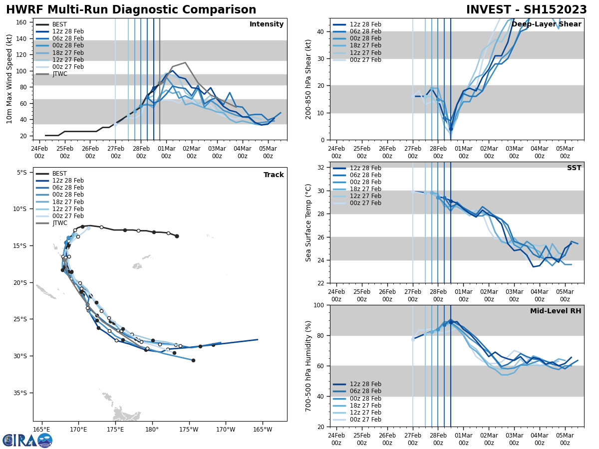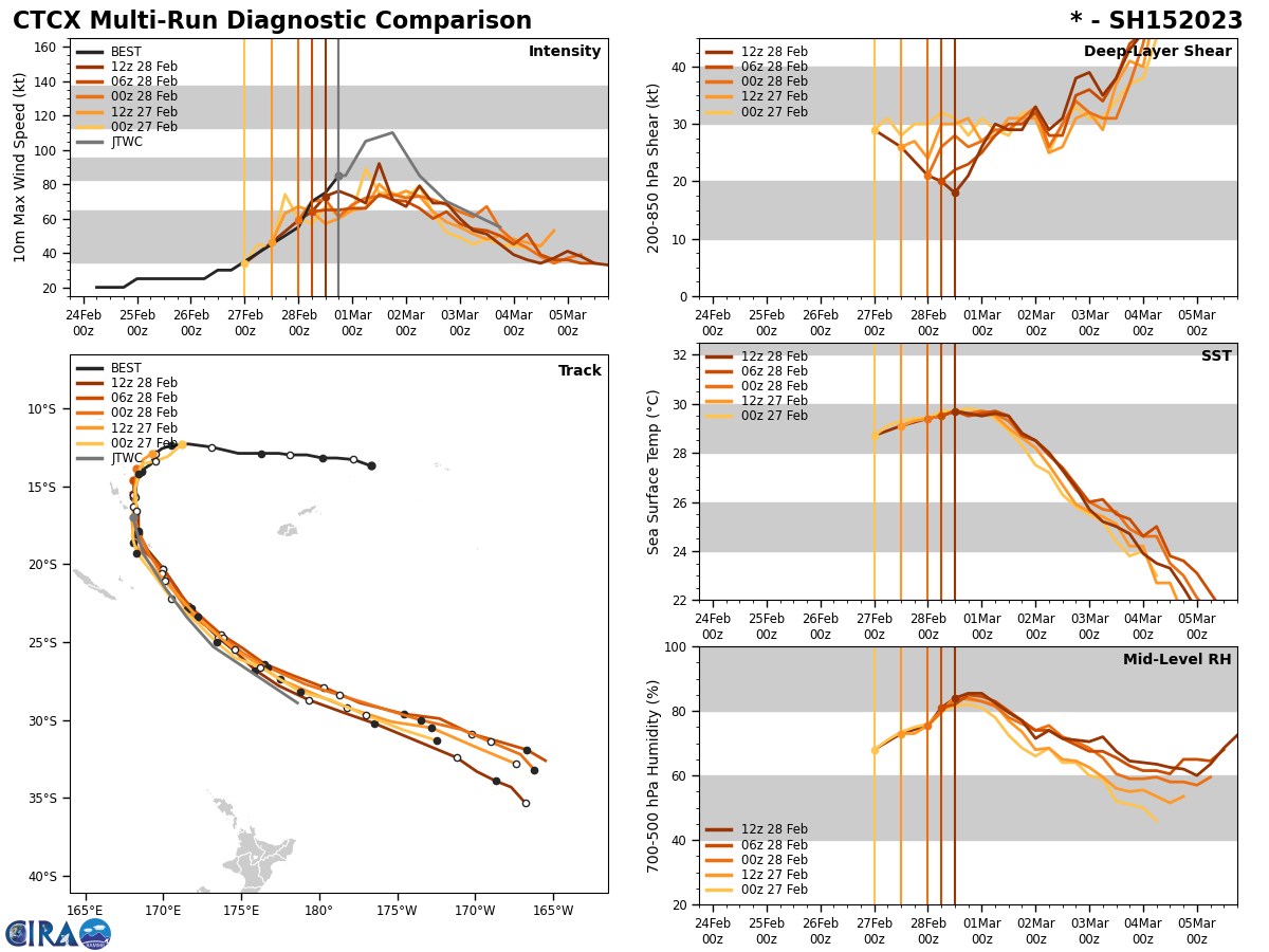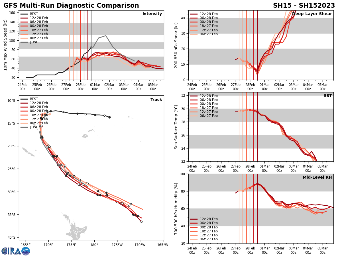 FORECAST REASONING. SIGNIFICANT FORECAST CHANGES: THERE ARE NO SIGNIFICANT CHANGES TO THE FORECAST FROM THE PREVIOUS WARNING. FORECAST DISCUSSION: TC JUDY CONTINUES TO TRACK SOUTHWARD, THOUGH AS MENTIONED, RECENT SATELLITE IMAGERY SUGGESTS IT MAY BE SLOWING DOWN A BIT AS IT APPROACHES PORT VILA. THE SYSTEM IS EXPECTED TO CONTINUE SOUTHWARD AS IT ROUNDS THE AXIS OF THE STEERING RIDGE, AND EITHER PASS JUST A HAIR WEST OF EFATE ISLAND, OR MAKE LANDFALL DIRECTLY ON THE ISLAND, WITHIN THE NEXT 6 TO 12 HOURS. ONCE PAST EFATE, THE SYSTEM IS EXPECTED TO PASS SOUTH OF THE RIDGE AXIS AND TURN ONTO SOUTHEASTWARD TRAJECTORY THROUGH THE REMAINDER OF THE FORECAST PERIOD. IN TERMS OF INTENSITY, TC JUDY HAS AT MOST ANOTHER 18-24 HOURS OF FRIENDLY CONDITIONS BEFORE THINGS GET NASTY. WHILE THE MID-LEVEL SHEAR CONTINUES TO BE AN ISSUE, HIGH RESOLUTION MODELS SUGGEST THAT THE RAPID DEVELOPMENT OF INNER CORE CONVECTION SHOULD HELP PUSH BACK AGAINST THIS SHEAR OVER THE NEXT 12 HOURS. THE IMPROVEMENT IN UPPER-LEVEL POLEWARD OUTFLOW WILL ENHANCE THE REDUCED MESOSCALE SHEAR, ALLOWING THE SYSTEM TO CONTINUE TO RAPIDLY INTENSIFY THROUGH TAU 12. THE PACE OF INTENSIFICATION WILL SLOW AFTER TAU 12 AS DEEP-LAYER WESTERLY SHEAR STARTS TO INCREASE, AND SSTS START TO COOL. THE PEAK OF 110 KNOTS IS STILL EXPECTED AROUND TAU 18, HOLDING ON THROUGH TAU 24. AFTER THIS POINT HOWEVER, THINGS BEGIN TO DRASTICALLY CHANGE. SHEAR DOUBLES TO 25 KNOTS BY TAU 36, THEN DOUBLES AGAIN TO 50 KNOTS BY TAU 60, AS THE SYSTEM BECOMES EMBEDDED WITHIN THE SUBTROPICAL WESTERLIES. BY TAU 36, SSTS DROP BELOW 26C, AND THE SYSTEM BEGINS TO MERGE INTO PHASE WITH A SHARP 500MB BAROCLINIC TROUGH, MARKING THE START OF SUBTROPICAL TRANSITION (STT). THE SYSTEM SHOULD COMPLETE STT NO LATER THAN TAU 72, BUT IN REALITY, IS MORE LIKELY TO TRANSITION TO A STORM-FORCE SUBTROPICAL LOW BY TAU 60.