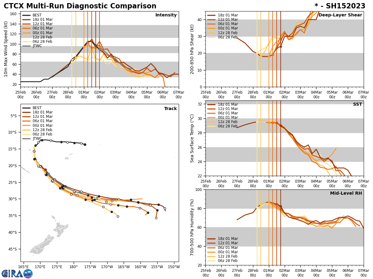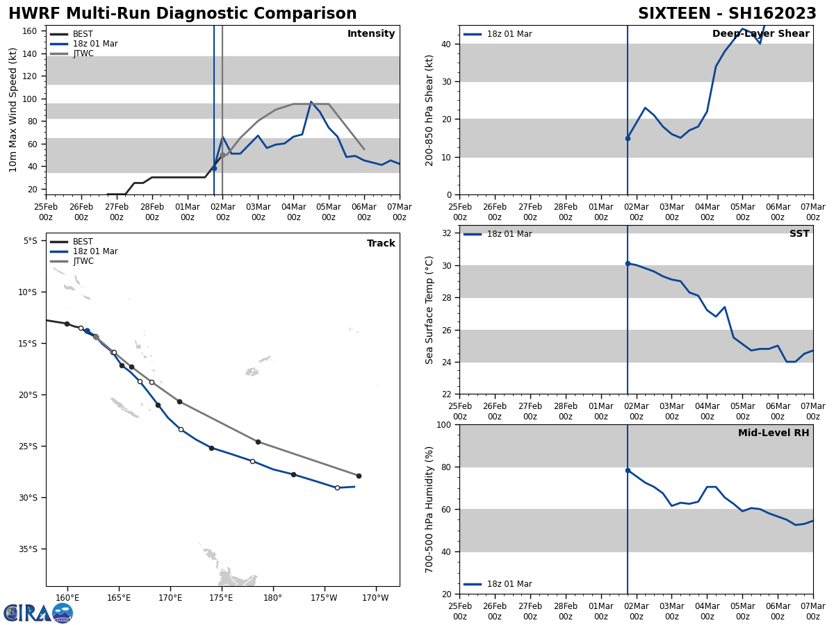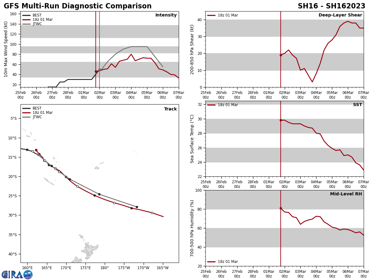 FORECAST REASONING. SIGNIFICANT FORECAST CHANGES: THERE ARE NO SIGNIFICANT CHANGES TO THE FORECAST FROM THE PREVIOUS WARNING. FORECAST DISCUSSION: TC 16P (KEVIN) IS FORECAST TO MIMIC THE TRACK OF TC 15P (JUDY). AS THE SYSTEM CONTINUES TO TRANSITION ITS STEERING INFLUENCE TO THE STR TO THE EAST-SOUTHEAST IT WILL CONTINUE TRACKING GENERALLY SOUTHEASTWARD OVER THE NEXT 48 HOURS. DURING THIS TIME, THE SYSTEM WILL BE IN A FAVORABLE ENVIRONMENT CHARACTERIZED BY WARM SEA SURFACE TEMPERATURES AND VIGOROUS OUTFLOW ALOFT NEGLIGIBLY AFFECTED BY MODERATE VERTICAL WINDS SHEAR. THESE FACTORS ARE FORECAST TO STRENGTHEN 16P TO 95 KTS AND LIKELY HIGHER, EVENTUALLY PEAKING NEAR TAU 60. AS 16P CONTINUES POLEWARD OF THE STR NEAR TAU 72, VERTICAL WIND SHEAR BEGINS TO CLIMB, DRY AIR ENTRAINMENT INCREASES AND THE SYSTEM PASSES SOUTH OF THE 26 C ISOTHERM, THESE FACTORS HERALD THE START OF SUB-TROPICAL TRANSITION (STT). OVER THE FOLLOWING 24 HOURS, THESE FACTORS CONTINUE TO INCREASE AND THE SYSTEM WILL CONTINUE TO WEAKEN THROUGH TAU 96 AFTER WHICH TC 16P IS FORECAST TO BE FULLY SUB-TROPICAL.