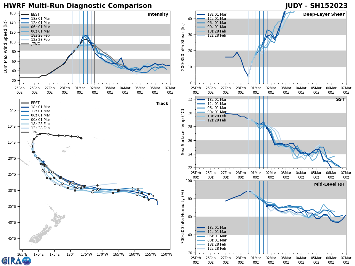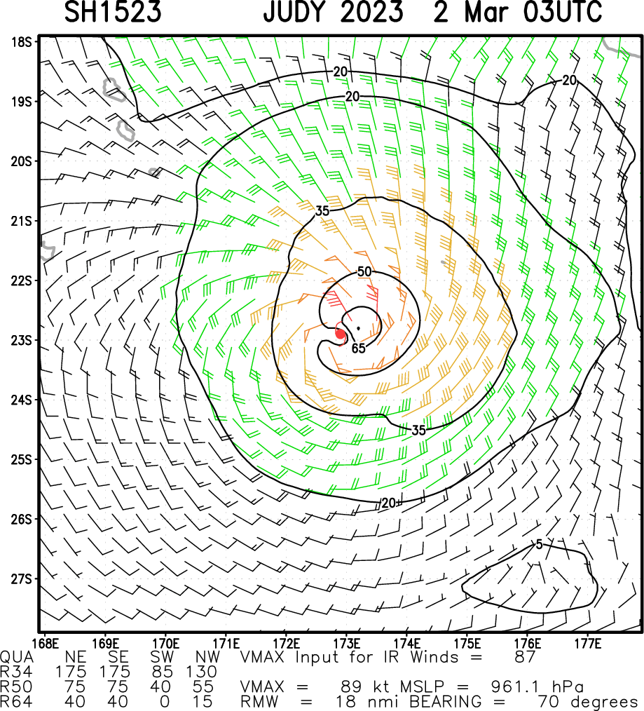 FORECAST REASONING. SIGNIFICANT FORECAST CHANGES: THERE ARE NO SIGNIFICANT CHANGES TO THE FORECAST FROM THE PREVIOUS WARNING. FORECAST DISCUSSION: TC 15P (JUDY) IS FORECAST TO CONTINUE ON ITS SOUTHEASTWARD TRACK AS IT PROGRESSES ALONG THE OUTER PERIPHERY OF THE STR TO THE EAST-NORTHEAST. AS 15P TRANSITS POLEWARD, IT WILL BE IN AN INCREASINGLY HOSTILE ENVIRONMENT CHARACTERIZED BY STRONGER VWS, AND INCREASING DRY AIR ENTRAINMENT, THESE FACTORS WILL CONSPIRE TO WEAKEN THE SYSTEM TO AROUND 70 KTS BY TAU 24. AFTER TAU 24, THE SYSTEM WILL BEGIN ITS SUBTROPICAL TRANSITION (STT) AND A FURTHER DECREASE IN INTENSITY TO 55 KTS IS ANTICIPATED AS THE SYSTEM CROSSES THE 26 C ISOTHERM. BY TAU 36, 15P WILL CONTINUE ITS STT AND WILL CONTINUE TO FEEL THE EFFECTS OF DRY AIR ENTRAINMENT FROM THE NORTHWEST BEING WRAPPED INTO THE CENTER. BY TAU 48, 15P WILL HAVE WEAKENED TO AROUND 50 KTS AND BECOME FULLY SUBTROPICAL.