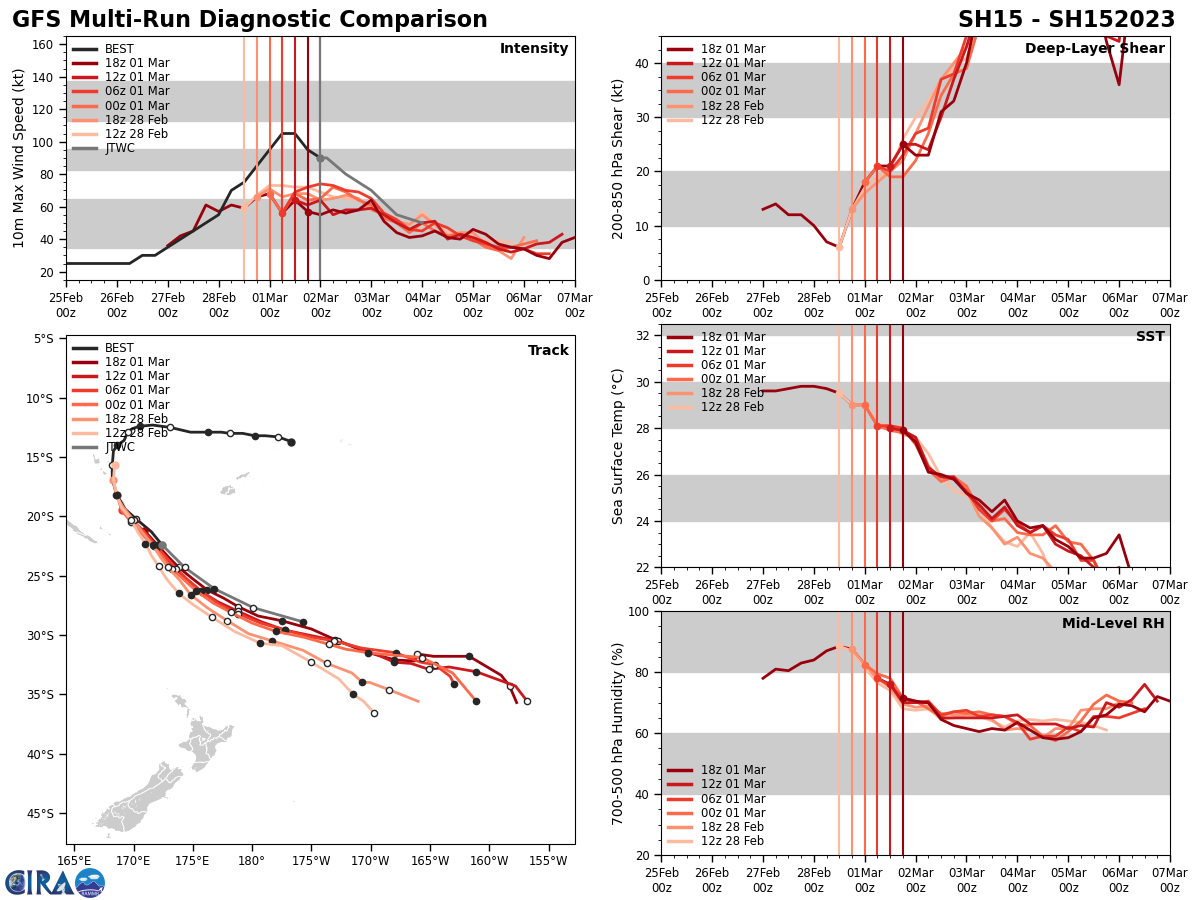 MODEL DISCUSSION: NUMERICAL MODELS ARE IN FAIR AGREEMENT THAT 15P WILL TRANSIT POLEWARD OF THE STR AND BY TAU 48 THE SYSTEM WILL ACCELERATE EAST-SOUTHEASTWARD AS A SUBTROPICAL SYSTEM. THERE IS A SLIGHT SPREAD IN MODEL OUTPUT BY TAU 48 RESULTING IN AN OVERALL MEDIUM CONFIDENCE IN THE TRACK FORECAST. RELIABLE MODEL INTENSITY GUIDANCE IS IN GOOD AGREEMENT WITH ALL MEMBERS INDICATING A WEAKENING TREND THROUGH THE FORECAST PERIOD. FOR THIS REASON THE JTWC INTENSITY FORECAST IS PLACED WITH HIGH CONFIDENCE.