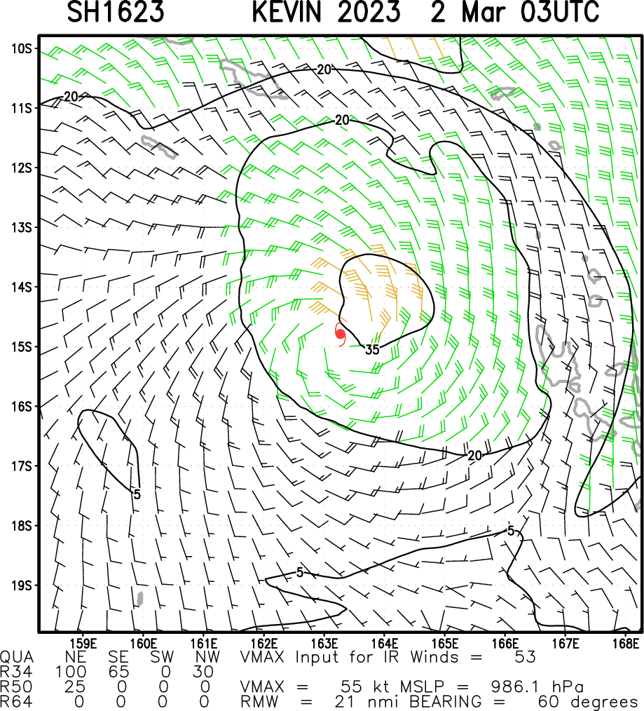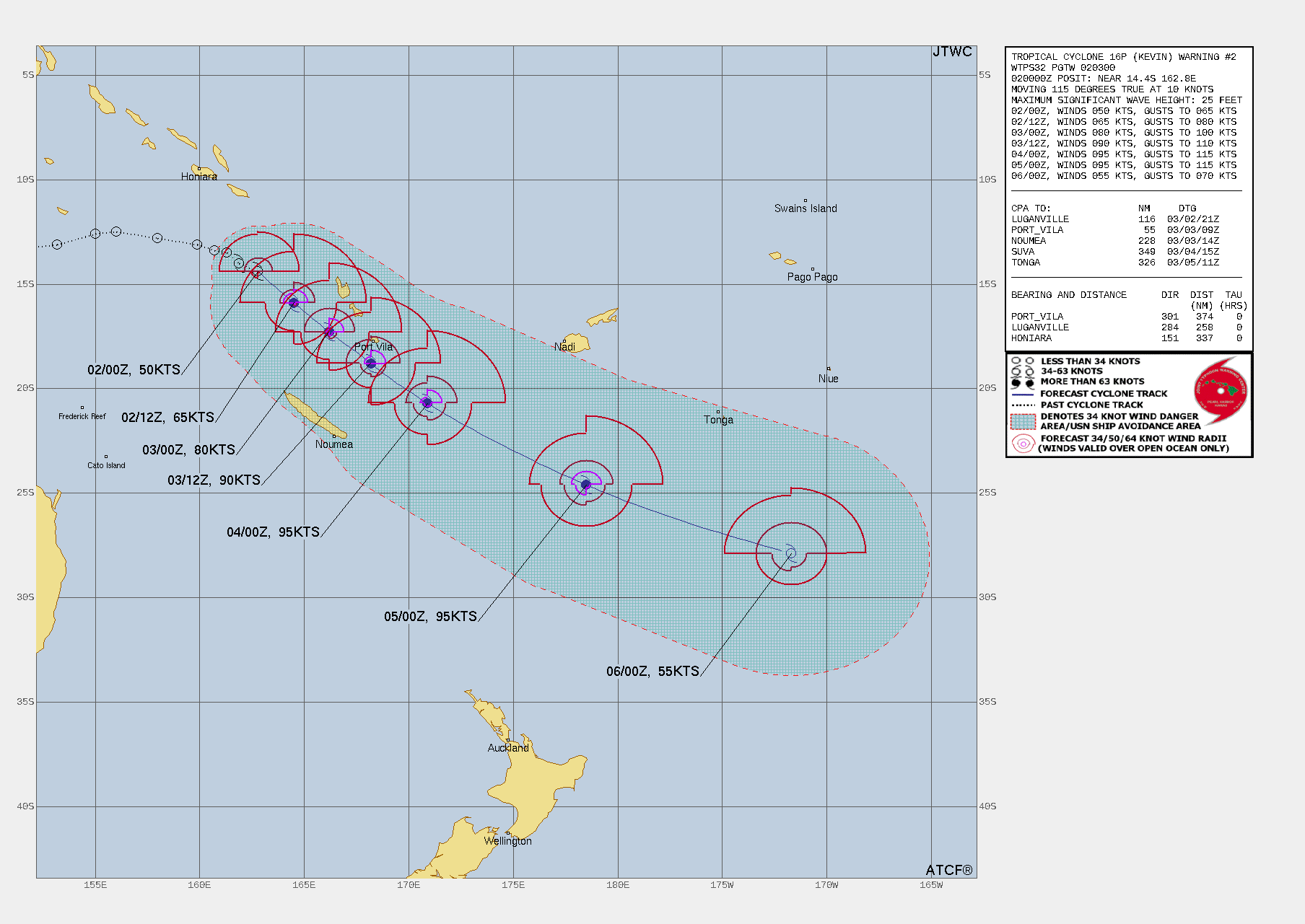 SOUTH PACIFIC OCEAN: TC 16P(KEVIN). CURRENT ESTIMATED INTENSITY IS 50 KNOTS AT 02/00UTC. WARNING 2 ISSUED AT 02/03UTC.
