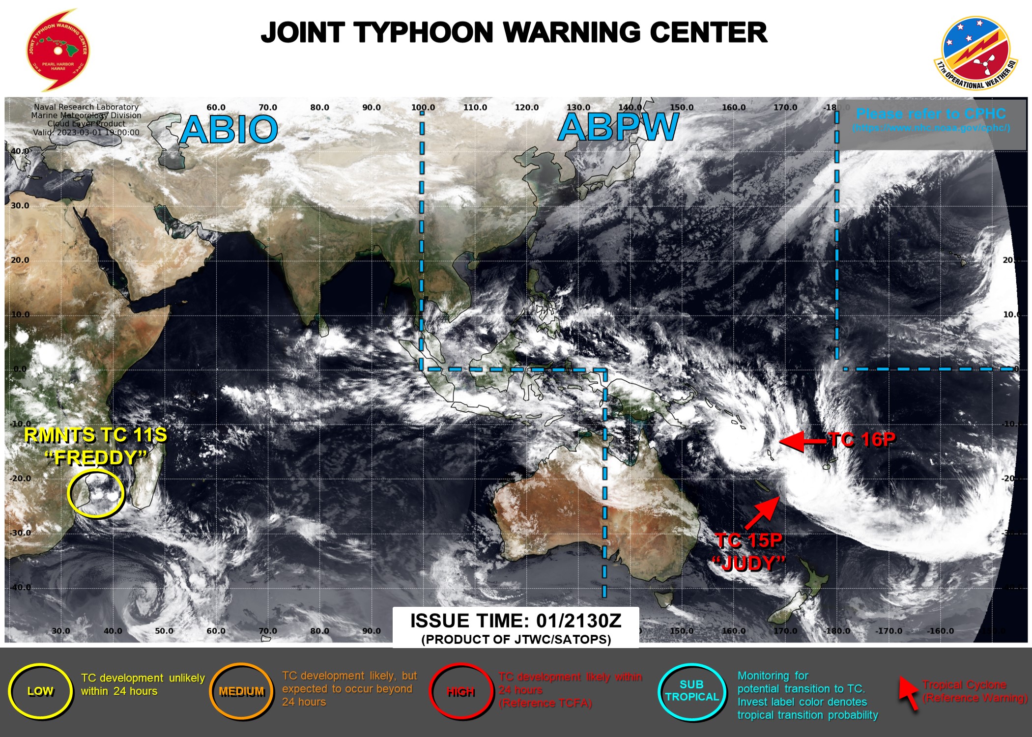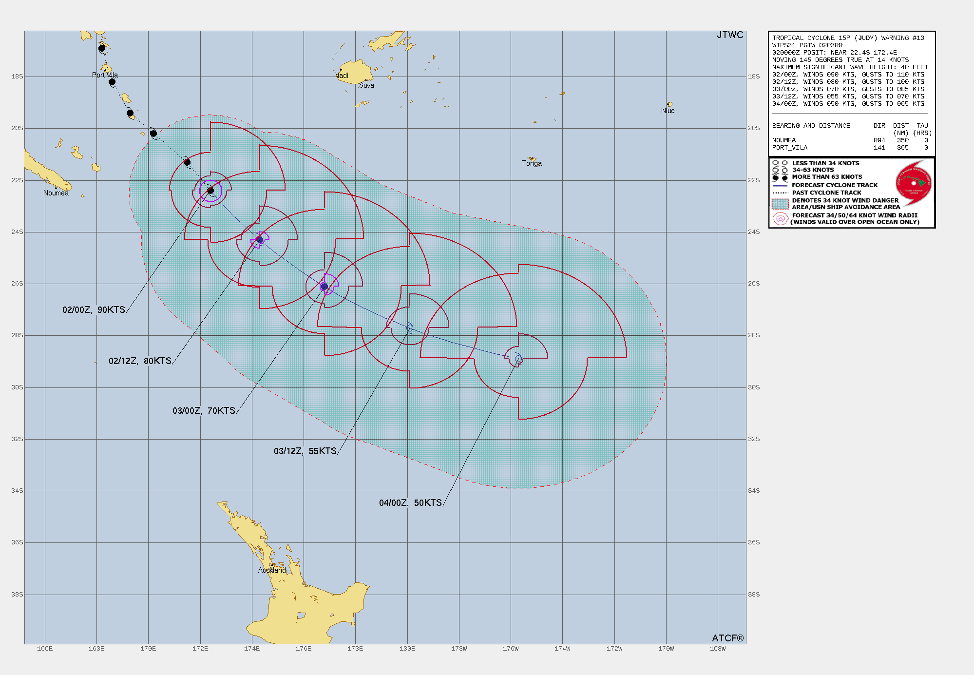 SOUTH PACIFIC OCEAN: TC 15P(JUDY). CURRENT ESTIMATED INTENSITY IS 90 KNOTS CAT 2 US AT 02/00UTC. WARNING 13 ISSUED AT 02/03UTC.