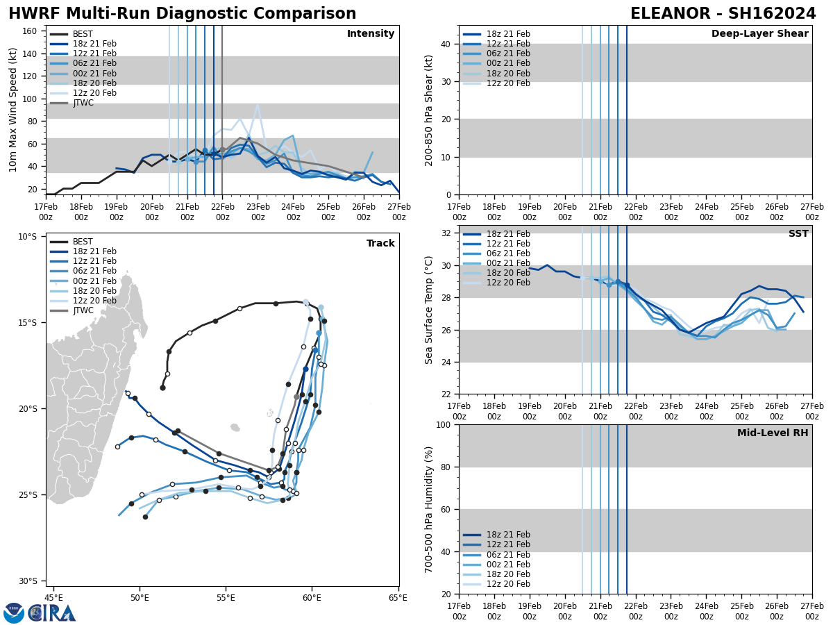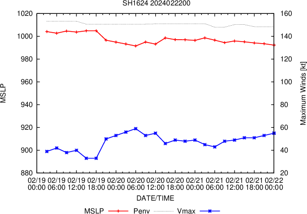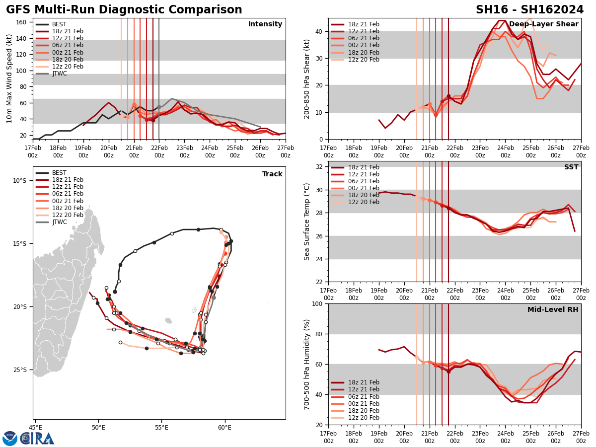 FORECAST REASONING. SIGNIFICANT FORECAST CHANGES: THERE ARE NO SIGNIFICANT CHANGES TO THE FORECAST FROM THE PREVIOUS WARNING. FORECAST DISCUSSION: THROUGH TAU 12, TC 16S IS FORECAST TO TRACK SOUTH-SOUTHWEST AS IT CONTINUES TO RIDE THE WESTERN PERIPHERY OF AN STR TO THE EAST BEFORE TRACKING ON A MORE SOUTHERLY ROUTE ALONG THE RIDGE THROUGH TAU 24. AROUND TAU 48, A DEEP MID-LATITUDE TROUGH MOVES IN FROM THE WEST, INDUCING SIGNIFICANT VERTICAL WIND SHEAR OF 25-30KTS, WHICH WILL SHEAR APART TC 16S, MARKING THE ONSET OF RAPID WEAKENING. AS THE SYSTEM WEAKENS, THE VORTEX WILL SHALLOW OUT, RESULTING IN THE LOWER-LEVEL FLOW BECOMING THE DOMINANT STEERING MECHANISM AND A TRACK TO THE WEST-NORTHWEST THROUGH THE END OF THE FORECAST PERIOD. THE SYSTEM IS ANTICIPATED TO INTENSIFY THROUGH TAU 12 AND PEAK AT APPROXIMATELY 65KTS AS UPPER-LEVEL POLEWARD OUTFLOW INTO A 120 KNOT JET MAX TO THE SOUTH OFFSETS STEADILY INCREASING VWS. BEYOND TAU 24, VERTICAL WIND SHEAR IS EXPECTED TO SIGNIFICANTLY INCREASE TO A STRONG 25-30KTS AND ENCOURAGE DRY AIR ENTRAINMENT AS THE SYSTEM STEADILY DRIES AND WEAKENS TO 45KTS BY TAU 48 AND REACH FULL DISSIPATION OF 30KTS AT TAU 96.