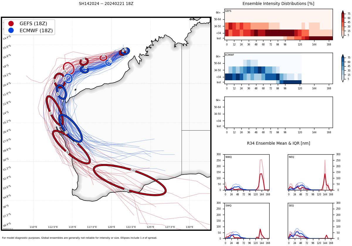 FORECAST REASONING. SIGNIFICANT FORECAST CHANGES: THIS INITIAL REGENERATED PROGNOSTIC REASONING MESSAGE ESTABLISHES THE FORECAST PHILOSOPHY. FORECAST DISCUSSION: TC 14P IS CURRENTLY TRACKING SOUTHWESTWARD ALONG THE NORTHERN PERIPHERY OF THE SUBTROPICAL RIDGE THAT IS PLACED OVER WESTERN AUSTRALIA. IT WILL CONTINUE ALONG THIS TRACK UNTIL AROUND TAU 24, WHEN THE STR REORIENTS TO A NORTH-SOUTH ORIENTATION, ALLOWING FOR TC 14P TO TURN SOUTHWARD. AROUND TAU 60, TC 14 IS FORECASTED TO MAKE LANDFALL, JUST WEST OF LEARMONTH. TC 14P WILL THEN MAKE A SOUTHEASTWARD TURN TOWARDS INLAND AUSTRALIA AND DISSIPATE BY TAU 96. THE INTENSITY FORECAST FOLLOWS A CLIMATOLOGICAL INTENSIFICATION THROUGH TAU 48 DUE TO A FAVORABLE, BUT NOT HIGHLY FAVORABLE ENVIRONMENT, WITH WARM SEA SURFACE TEMPERATURES AND MODERATE OUTFLOW ALOFT OFFSET BY MODERATE TO HIGH (20-30 KTS) MID-LEVEL SHEAR AND SOME DRY AIR ENTRAINMENT. AROUND TAU 48 TC 14P IS FORECASTED TO REACH ITS PEAK INTENSITY OF 50 KTS. AFTER TAU 48, THE SYSTEM QUICKLY MAKES LANDFALL AND DISSIPATES DUE TO LAND INTERACTION NO LATER THAN TAU 96.