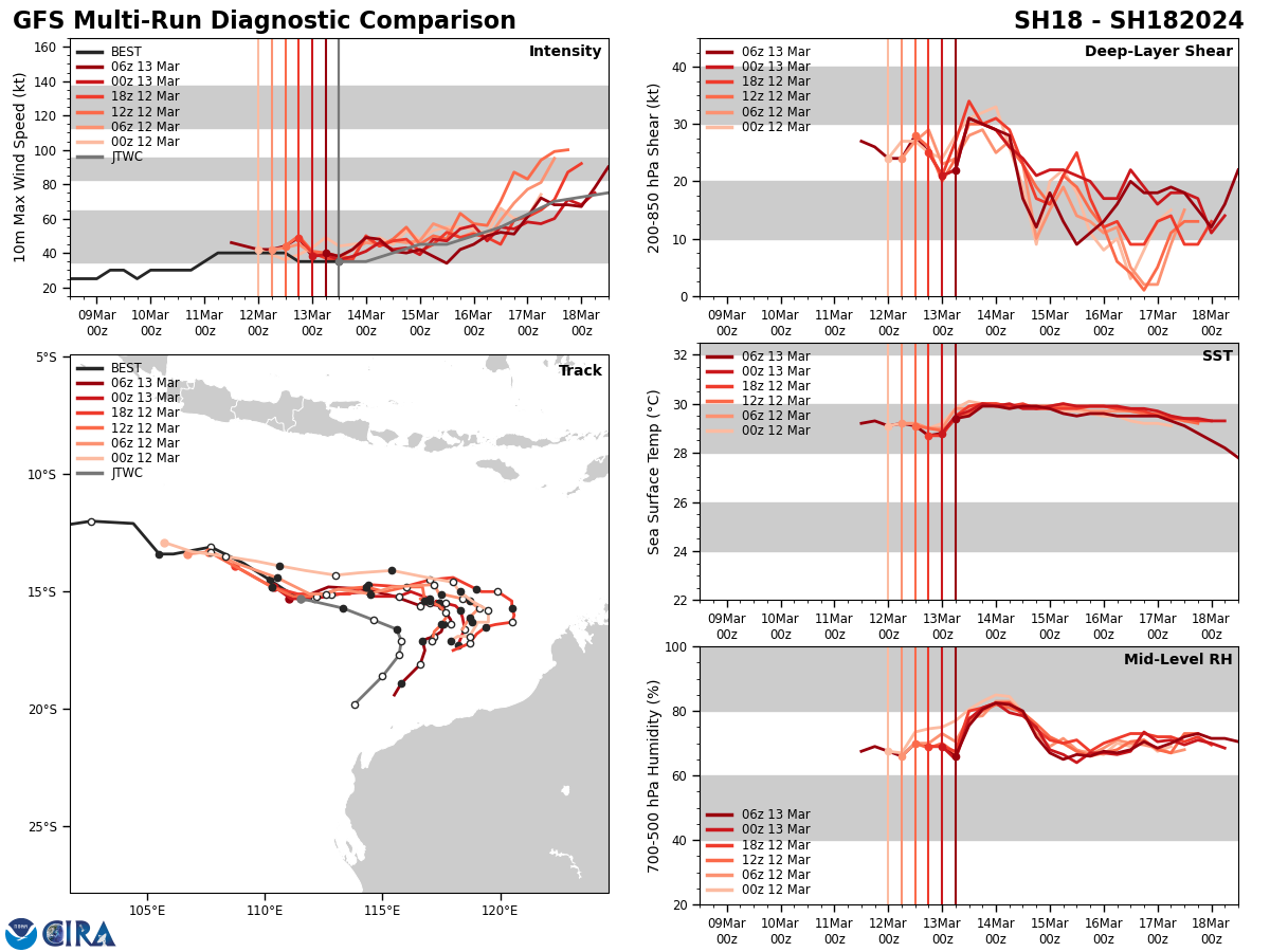 FORECAST REASONING. SIGNIFICANT FORECAST CHANGES: THERE ARE NO SIGNIFICANT CHANGES TO THE FORECAST FROM THE PREVIOUS WARNING. FORECAST DISCUSSION: TC 18S IS CURRENTLY TRACKING SOUTHEASTWARD ALONG THE SOUTHERN PERIPHERY OF A NER TO THE NORTH. TC 18S IS FORECAST TO CONTINUE THIS TRACK UNTIL TAU 36, WHERE IT IS ANTICIPATED TO INITIATE A POLEWARD TURN IN RESPONSE TO A SUBTROPICAL RIDGE (STR) POSITIONED OVER WESTERN AUSTRALIA. THE SYSTEM IS FORECAST TO HAVE COMPLETED THE POLEWARD TURN NEAR TAU 72. AFTER TAU 72, TC 18S IS EXPECTED TO CONTINUE ON A SOUTHWESTWARD TRACK FOR THE REMAINDER OF THE FORECAST PERIOD. REGARDING THE INTENSITY FORECAST, TC 18S IS FORECAST TO MAINTAIN 35 KTS THROUGH TAU 12 DUE TO THE RELATIVELY DISORGANIZED STRUCTURE AND MARGINAL ENVIRONMENT. AFTER TAU 12, TC 18S IS FORECAST TO THEN GRADUALLY INCREASE INTENSITY THROUGHOUT THE DURATION OF THE FORECAST PERIOD AS THE SYSTEM TRACKS INTO A MARGINALLY FAVORABLE ENVIRONMENT WITH LESS VERTICAL WIND SHEAR VALUES (10-15 KTS) STARING AT TAU 36 AND SEA SURFACE TEMPERATURES REMAINING VERY WARM.