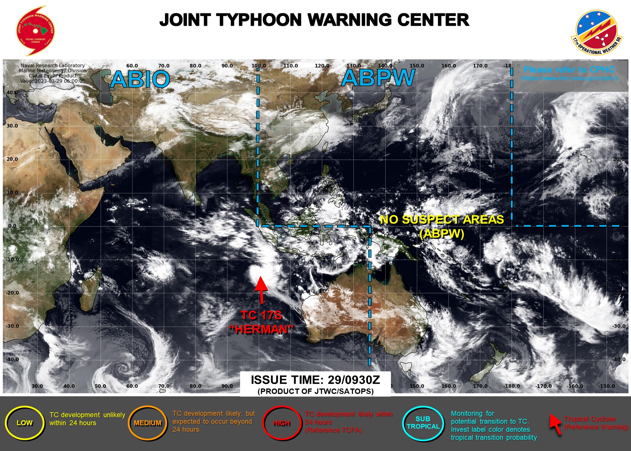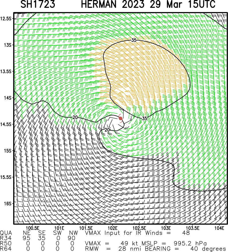 REMARKS: 291500Z POSITION NEAR 14.1S 102.6E. 29MAR23. TROPICAL CYCLONE 17S (HERMAN), LOCATED APPROXIMATELY 841 NM NORTHWEST OF LEARMONTH, AUSTRALIA, HAS TRACKED EAST- SOUTHEASTWARD AT 12 KNOTS OVER THE PAST SIX HOURS. MAXIMUM SIGNIFICANT WAVE HEIGHT AT 291200Z IS 19 FEET.