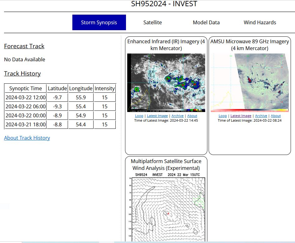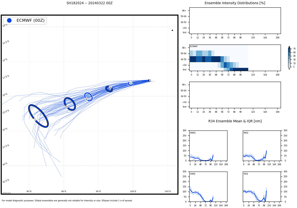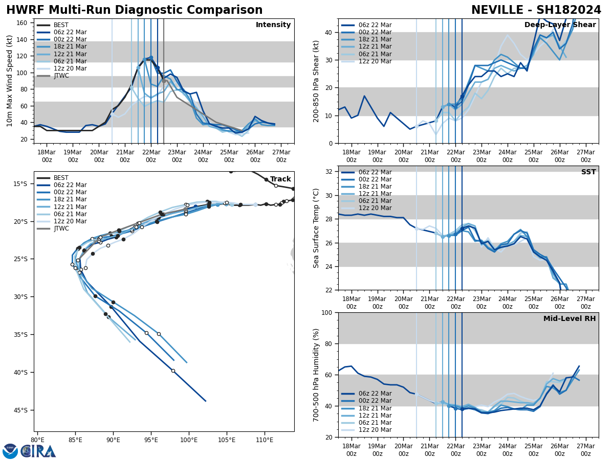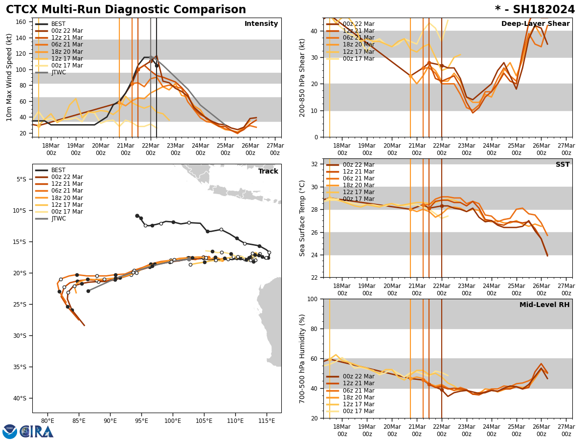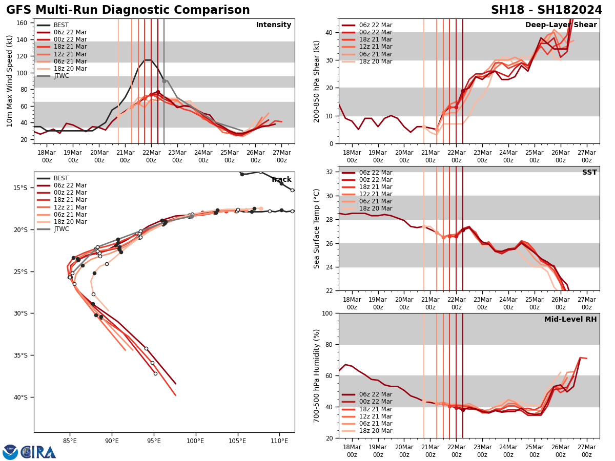 FORECAST REASONING. SIGNIFICANT FORECAST CHANGES: THERE ARE NO SIGNIFICANT CHANGES TO THE FORECAST FROM THE PREVIOUS WARNING. FORECAST DISCUSSION: TC 18S IS FORECAST TO CONTINUE ON A WEST-SOUTHWESTWARD TRACK THROUGH TAU 48 AS IT TRACKS ALONG THE NORTHWESTERN PERIPHERY OF THE STR TO THE SOUTH. AFTER TAU 48, THE SYSTEM IS FORECAST TO TURN MORE POLEWARD (SOUTHWESTWARD) AS 18S ROUNDS THE WESTERN EXTENT OF THE STR. REGARDING INTENSITY, TC 18S IS EXPECTED TO CONTINUE TO WEAKEN AS VWS VALUES REMAIN HIGH, SEA SURFACE TEMPERATURES DECREASE, AND DRY AIR ENTRAINS THE SYSTEM. ADDITIONALLY, A PRONOUNCED SHORTWAVE TROUGH IS POSITIONED TO THE WEST AND WILL AID IN DISSIPATION AS 18S ENCROACHES THE TROUGH. THE SYSTEM IS FORECAST TO WEAKEN TO 70 KTS NEAR TAU 12, 60 KTS NEAR TAU 24, 50 KTS NEAR TAU 36, AND 40 KTS NEAR TAU 48. BY TAU 72, TC 18S IS ANTICIPATED TO HAVE ENTIRELY DISSIPATED.