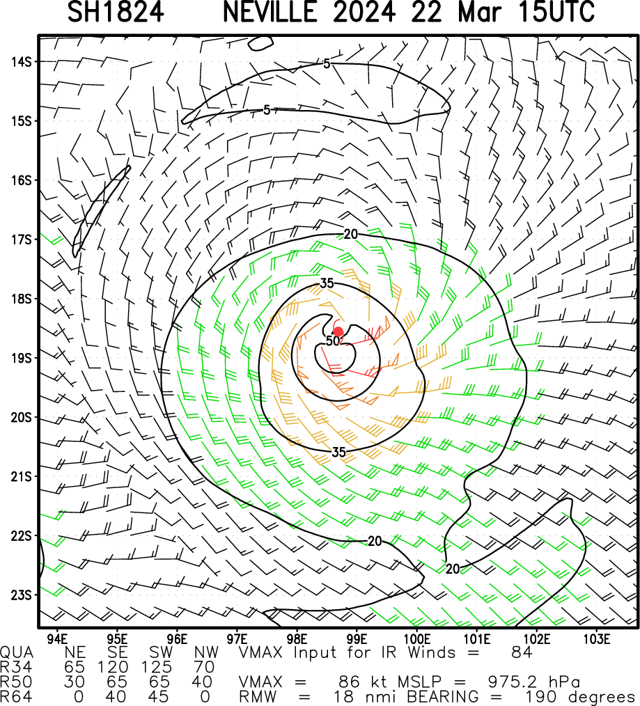 SATELLITE ANALYSIS, INITIAL POSITION AND INTENSITY DISCUSSION: ANIMATED ENHANCED INFRARED SATELLITE IMAGERY (EIR) DEPICTS TROPICAL CYCLONE (TC) 18S (NEVILLE) WITH A DEGRADING RAGGED-EYE THAT HAS NEARLY FILLED AS THE SYSTEM WEAKENS. THE CURRENT ENVIRONMENT IS ASSESSED AS MARGINALLY UNFAVORABLE CHARACTERIZED BY MODERATE POLEWARD OUTFLOW ALOFT AND WARM (27-28 C) SEA SURFACE TEMPERATURES GREATLY OFFSET BY MODERATE TO HIGH (20-25 KTS) VERTICAL WIND SHEAR (VWS) AND DRY AIR BEGINNING TO ENTRAIN INTO THE SYSTEM. THE INITIAL POSITION IS PLACED WITH HIGH CONFIDENCE BASED ON A 221200Z HIMAWARI-9 INFRARED SATELLITE IMAGE. THE INITIAL INTENSITY OF 90 KTS IS ASSESSED WITH MEDIUM CONFIDENCE BASED ON OBJECTIVE AND SUBJECTIVE INTENSITY ESTIMATES LISTED BELOW. THE CURRENT INTENSITY (CI) DVORAK ESTIMATES ARE ASSESSED AS POTENTIALLY TOO HIGH DUE TO THE COMPACT NATURE AND SIZE OF THE SYSTEM. FINAL-T NUMBERS RANGING FROM 4.5-5.0 ARE ASSESSED TO BE MORE REPRESENTATIVE AND WERE LEVIED MORE WHEN DETERMINING SYSTEM INTENSITY.