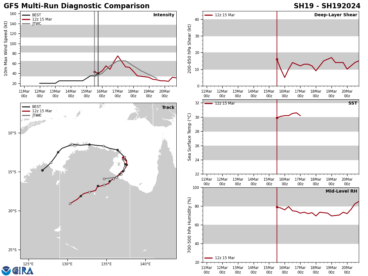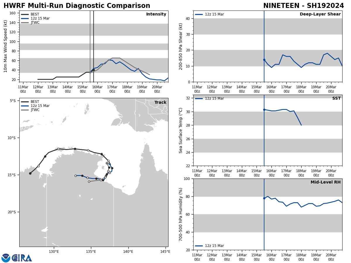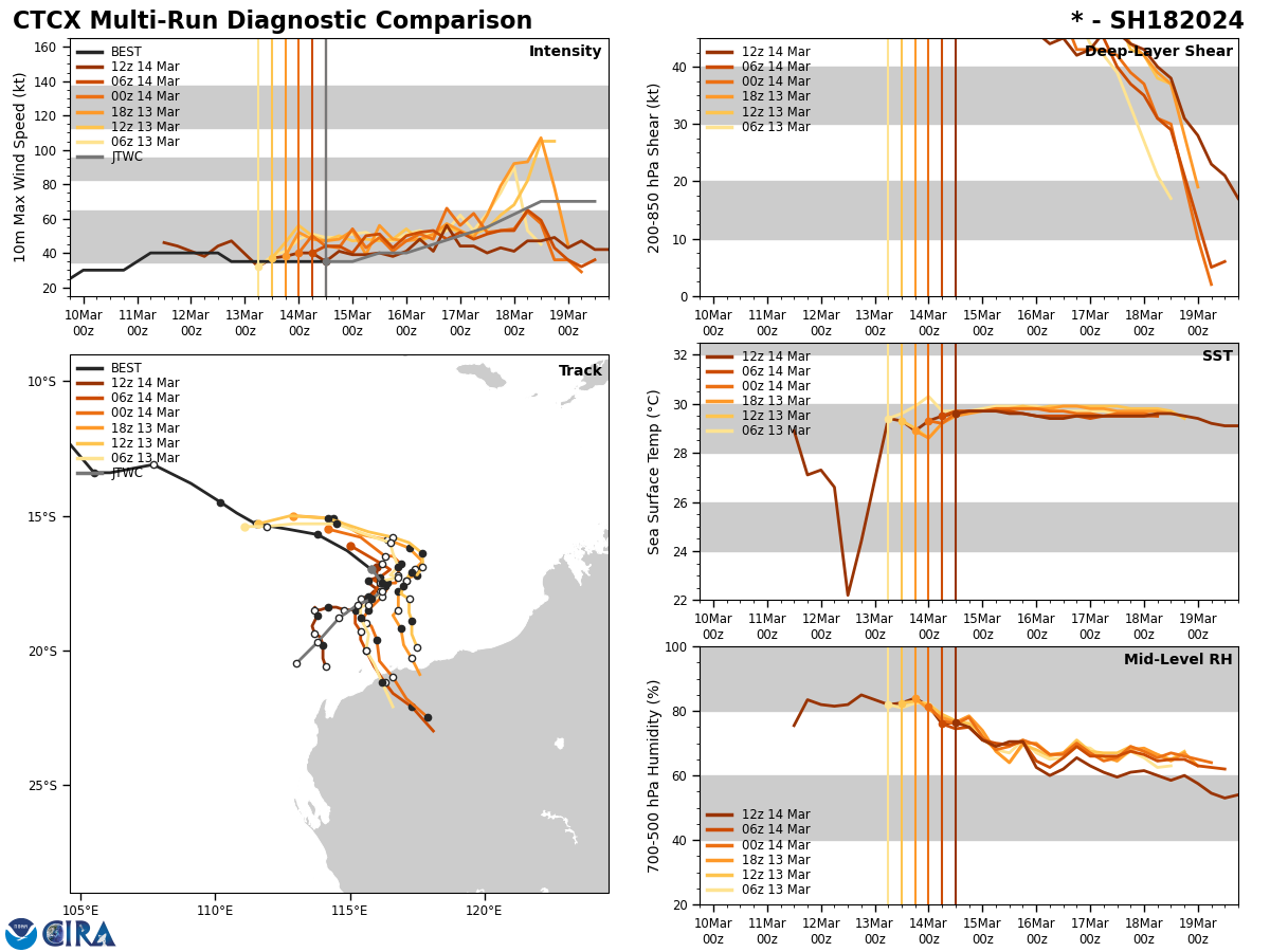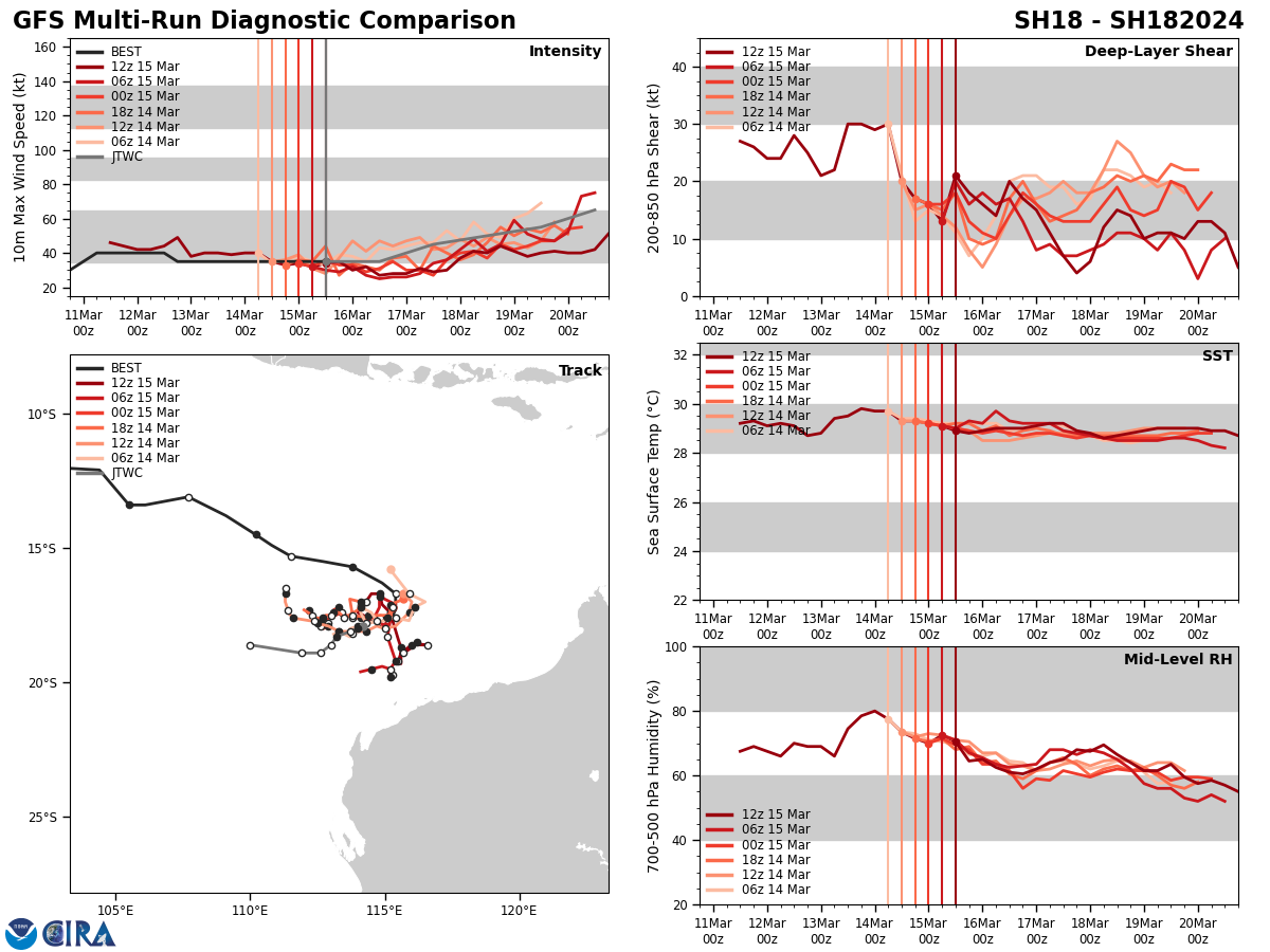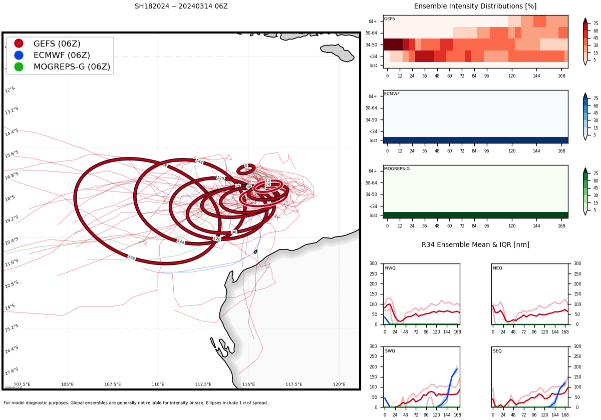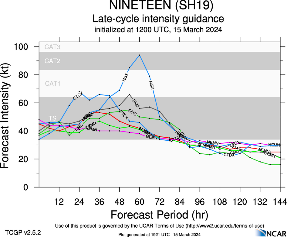MODEL DISCUSSION: THE DETERMINISTIC MODEL TRACK GUIDANCE IS IN POOR AGREEMENT THROUGH TAU 72, AS THE NAVGEM AND GFS TRACKERS HAVE ILLUSTRATED ERRATIC FORECAST SOLUTIONS OVER THE LAST 12 HOURS AWAY FROM THE CONSENSUS. THE 150600Z ECMWF ENSEMBLE (EPS) AND GFS ENSEMBLE (GEFS) ALSO INDICATE CONTINUED UNCERTAINTY AFTER TAU 72 DUE TO COMPETING STEERING MECHANISMS, WITH TWO DISTINCT GROUPINGS OF SOLUTIONS IN A SOUTHWARD AND WESTWARD TRAJECTORY. ROUGHLY 90 PERCENT OF THE EPS AND GEFS SOLUTIONS DEPICT A GENERAL WESTWARD TRACK, WHILE 10 PERCENT OF ENSEMBLE SOLUTIONS HAVE SHOWN A SLOW SOUTHWARD TRACK INTO NORTHWESTERN AUSTRALIA. THE 150600Z COAMPS-TC INTENSITY ENSEMBLE (CTCXEPS) SHOWS A STEADY INTENSIFICATION TREND, WITH DECREASING PEAK PROBABILITIES REACHING MODERATE INTENSIFICATION OF 30 TO 40 PERCENT BETWEEN TAU 60 AND TAU 84.
