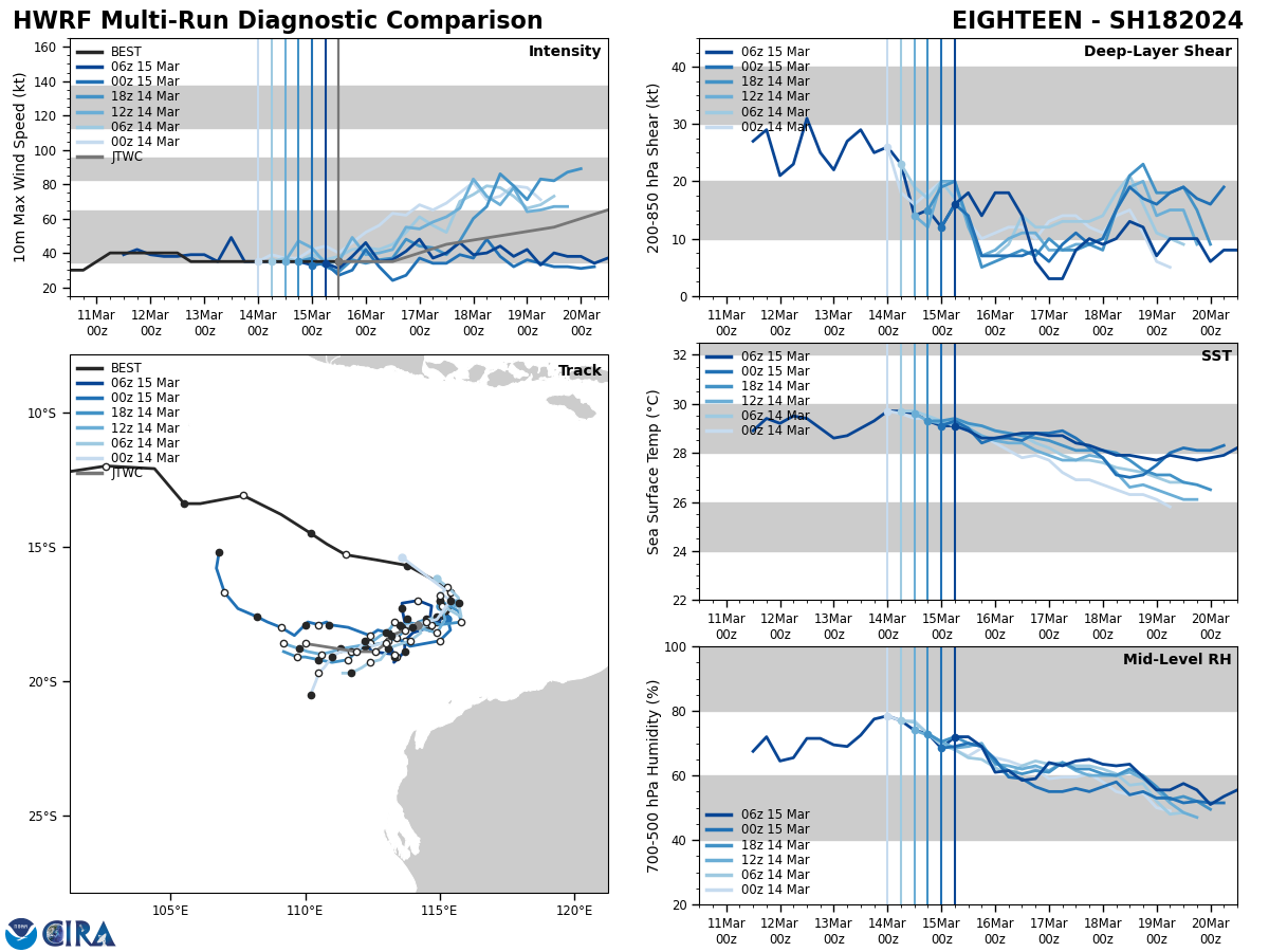 FORECAST REASONING. SIGNIFICANT FORECAST CHANGES: THERE ARE NO SIGNIFICANT CHANGES TO THE FORECAST FROM THE PREVIOUS WARNING. FORECAST DISCUSSION: TC 18S IS CURRENTLY TRACKING WEST-SOUTHWESTWARD ALONG THE NORTHWESTERN PERIPHERY OF THE STR LOCATED OVER CENTRAL AUSTRALIA AND EXTENDING WESTWARD INTO THE SOUTHWESTERN INDIAN OCEAN (IO). AS THE AFOREMENTIONED DEEP-LAYER STR CONTINUES TO BUILD SLIGHTLY WESTWARD, TC 18S IS FORECASTED TO CONTINUE ITS SLOW, MEANDERING WEST- SOUTHWESTWARD TRACK THROUGH TAU 36. AFTER TAU 36, A DEEP LONGWAVE TROUGH WILL WEAKEN THE STR STEERING FLOW, ALLOWING FOR A SHARP SOUTHWESTWARD TRACK UNTIL TAU 72. AS THE HIGH IN THE SOUTHERN IO REORIENTS EASTWARD, TC 18S WILL BEGIN A WEST-NORTHWESTWARD TRACK ALONG THE NORTHERN PERIPHERY OF THE SOUTHEAST TRADE FLOW THROUGH TAU 120. AS THE CYCLONE PROGRESSES GENERALLY WESTWARD, A MORE CONDUCIVE ENVIRONMENT IS EXPECTED AS VERTICAL WIND SHEAR (VWS) REMAINS LOW (10- 15 KNOTS), THE SYSTEM'S CORE MAINTAINS ITS MOIST STRUCTURE, AND FAVORABLE POLEWARD OUTFLOW INCREASES, RESULTING IN A STEADY INCREASE IN INTENSITY THROUGH TAU 120 OF UP TO 65 KNOTS.